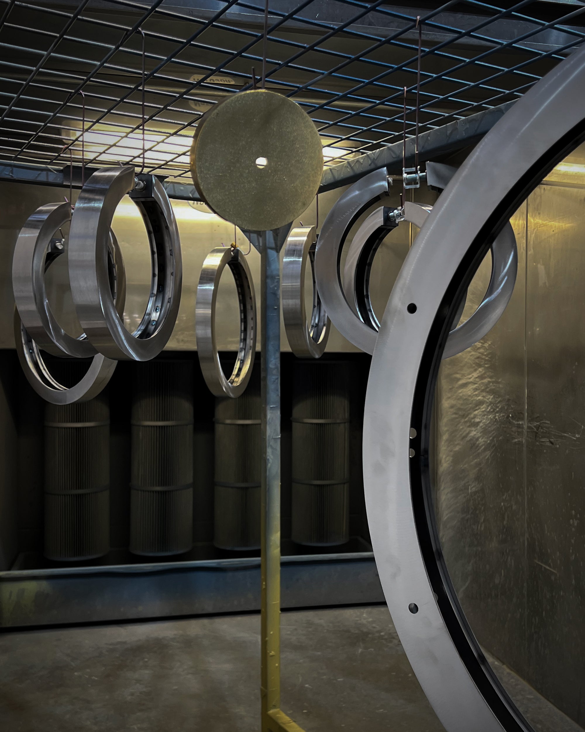 The hoops are carefully cleaned and hung, ready for powder coating.More from this collection