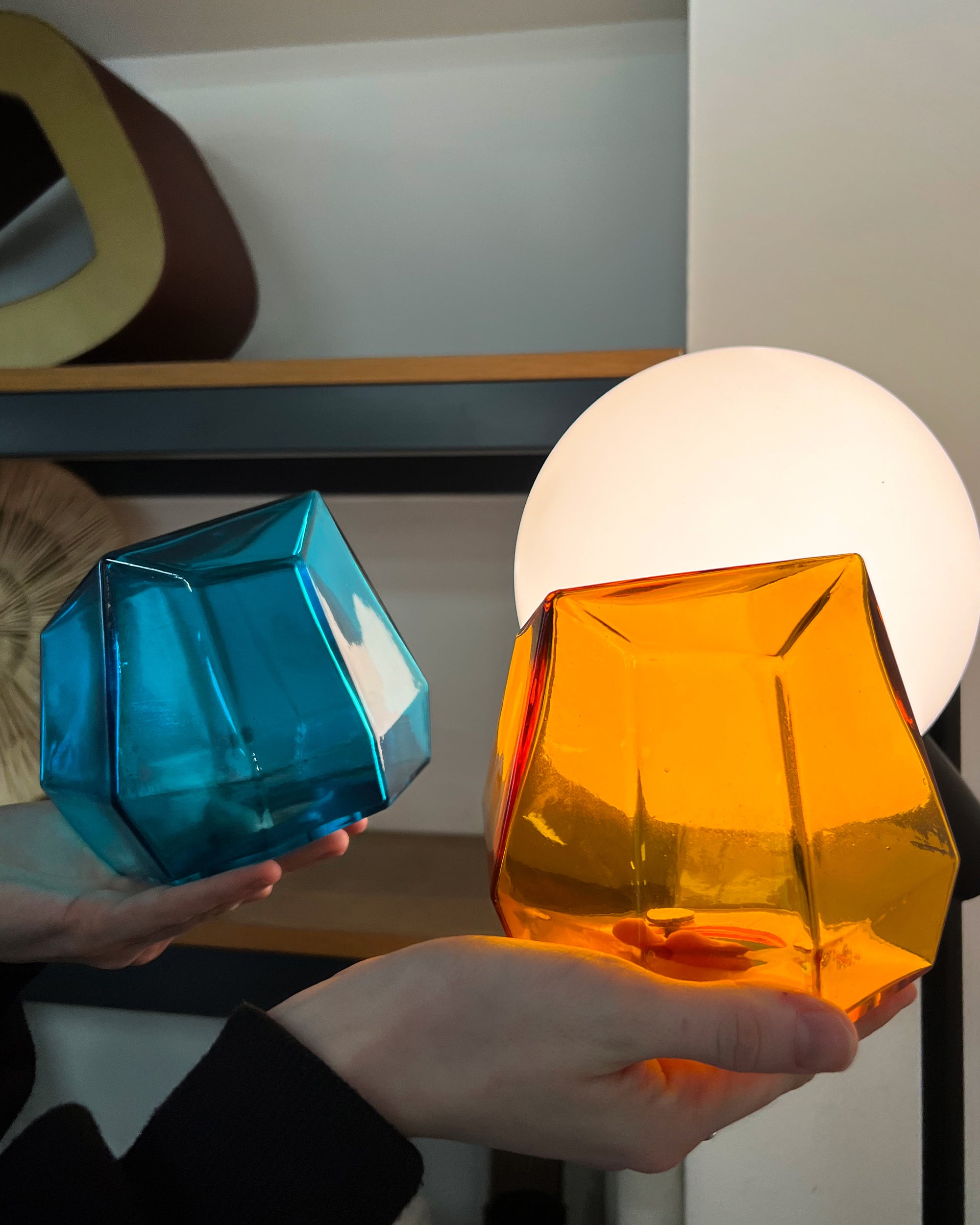 The Jewel chandelier features nine gemstone-inspired forms, suspended from an elegant metal frame. Multi-faceted glass catches and disperses light in a subtle, dynamic play, while real brass anchors and continues the sculptural lines, linking glass and metal into a cohesive, luxurious composition.
