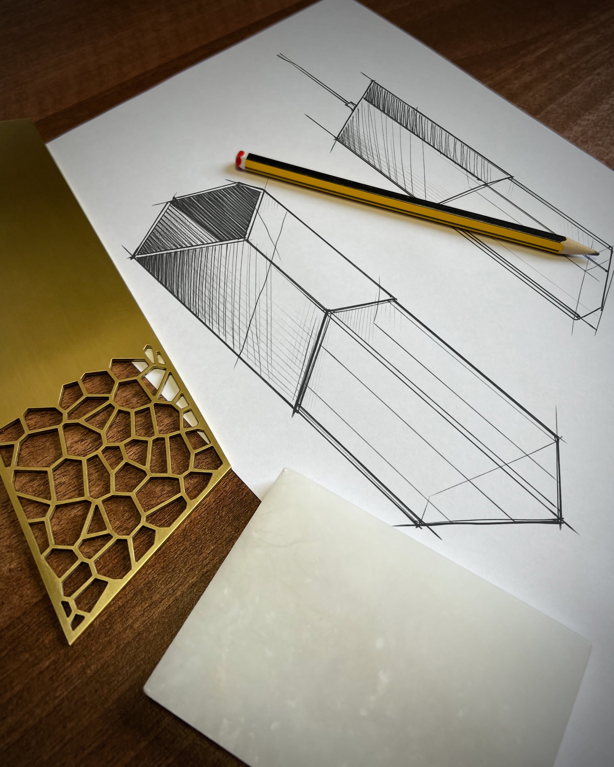 Hand-drawn studies explore asymmetry, translating into a balanced, sculptural form
