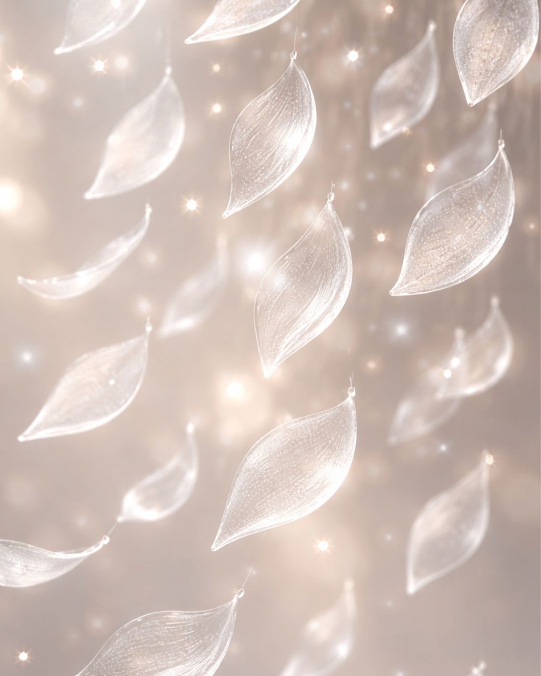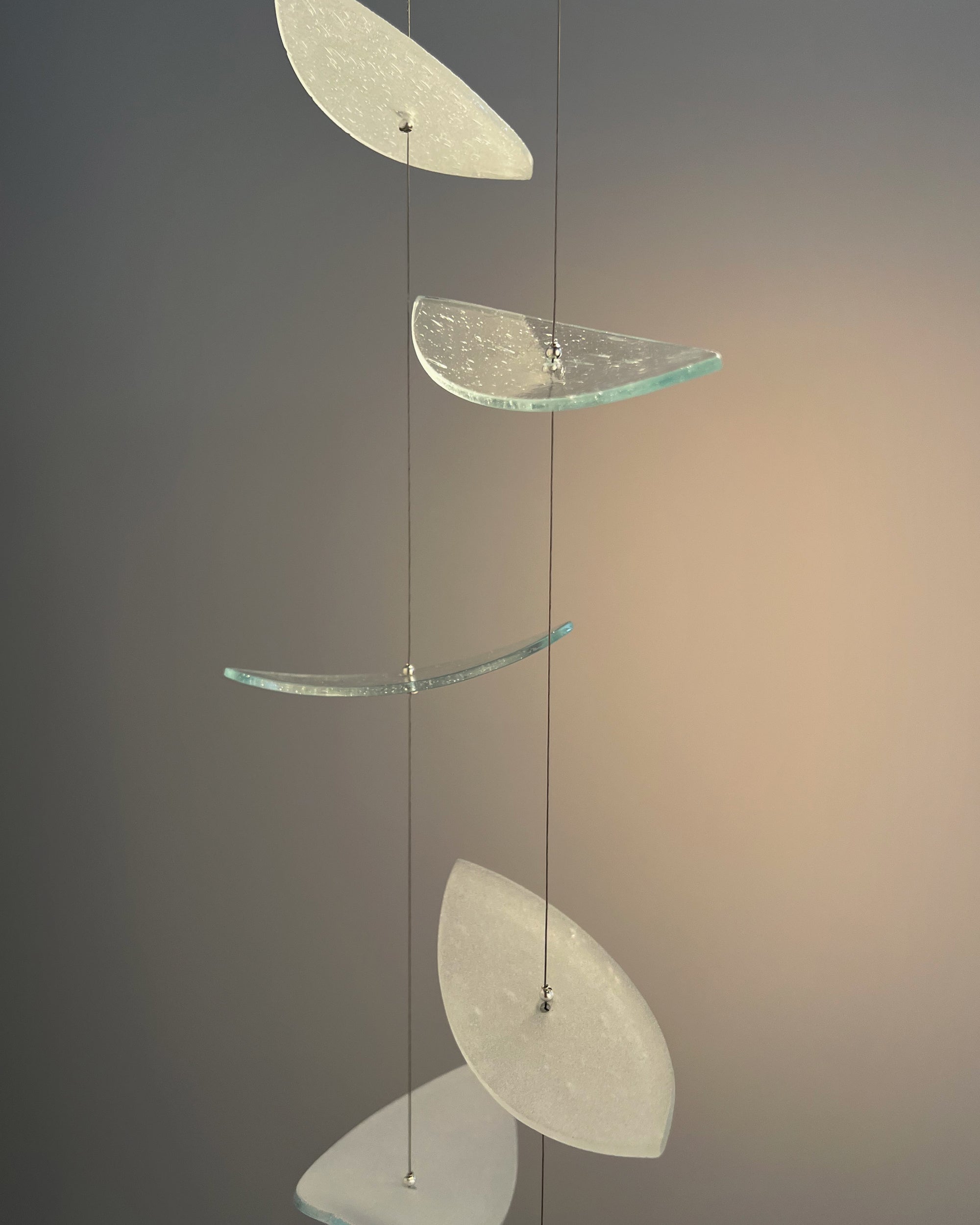 Casting a soft, shimmering cascade of light, the Veil chandelier exemplifies our mastery of artisan glass techniques. Each hand-formed glass leaf begins as a seeded sheet, chosen for its subtle texture and delicate air bubbles that animate the light. Individually hand-cut, fired, and shaped in our kiln, and partially frosted by hand, the glass achieves a sculpted form with soft opacity, accentuating its ethereal waterfall effect.