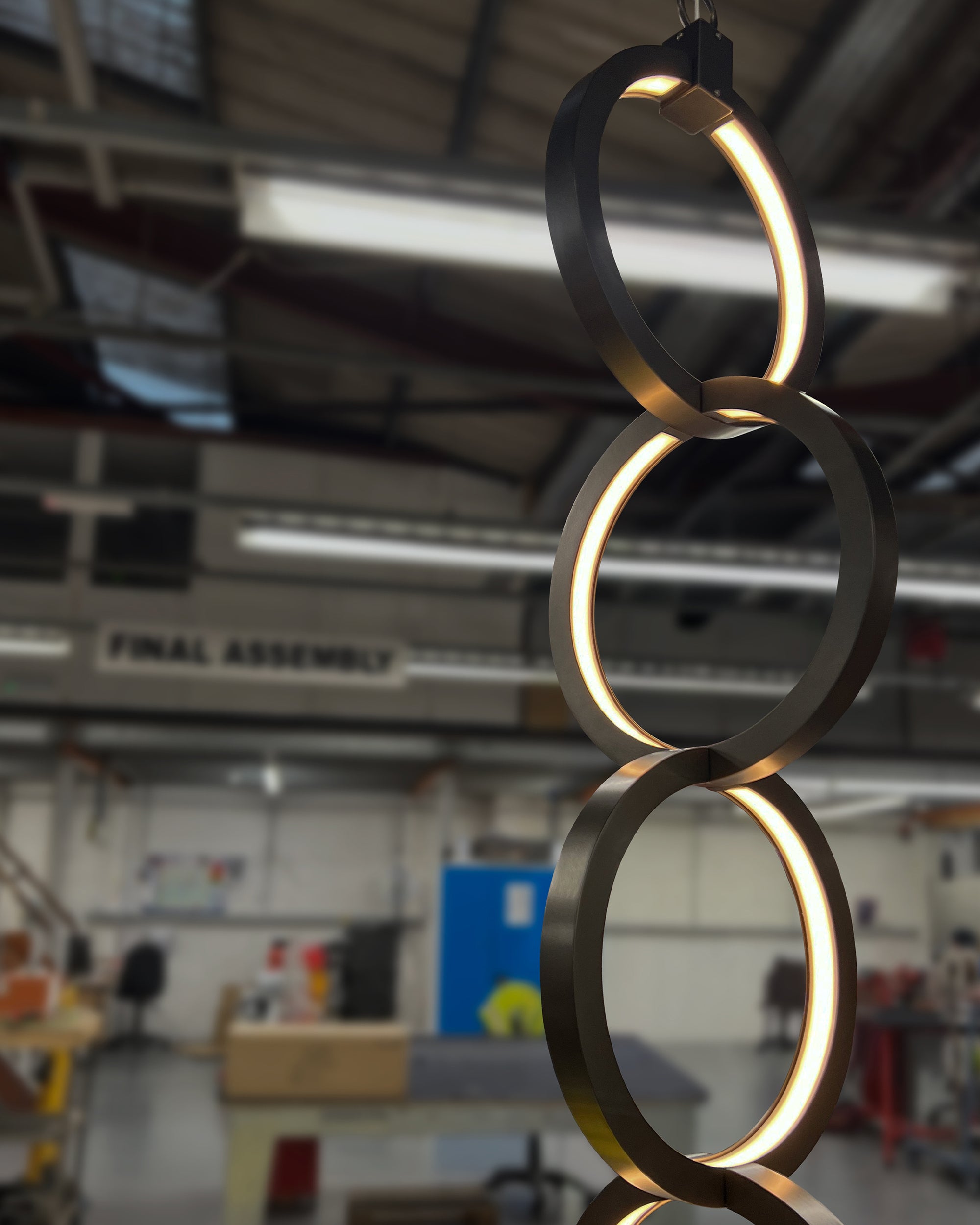 The Link pendant is formed from four metal hoops, linked together in a fluid composition. Each hoop is expertly fabricated and welded by our artisans, with discreet, integrated LED strips and opal diffusers providing warm, even illumination.