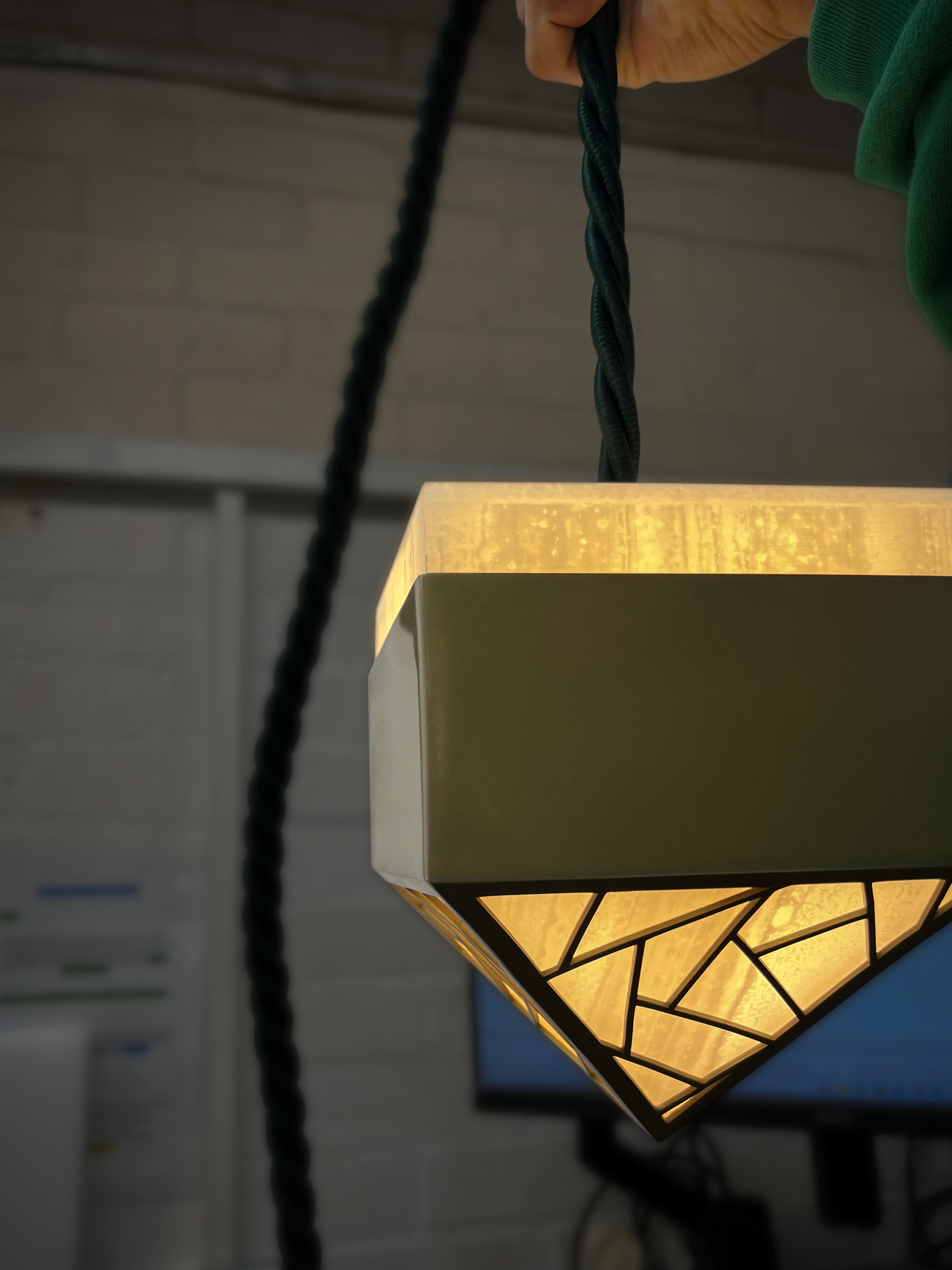 The Capsule pendant weaves subtle Middle Eastern influences with modern elegance. Its geometric form begins as a cube and transitions into an inverted pyramid, offering a dynamic sculptural presence.