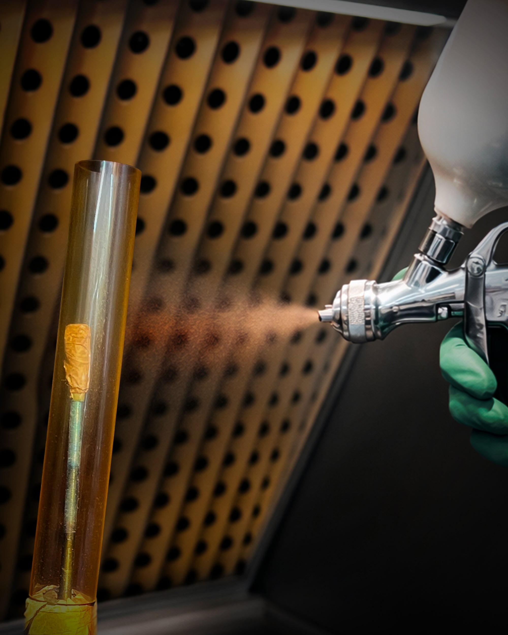 A fine spray evenly distributes pigment, preserves clarity and adds warmth to the glass tube.