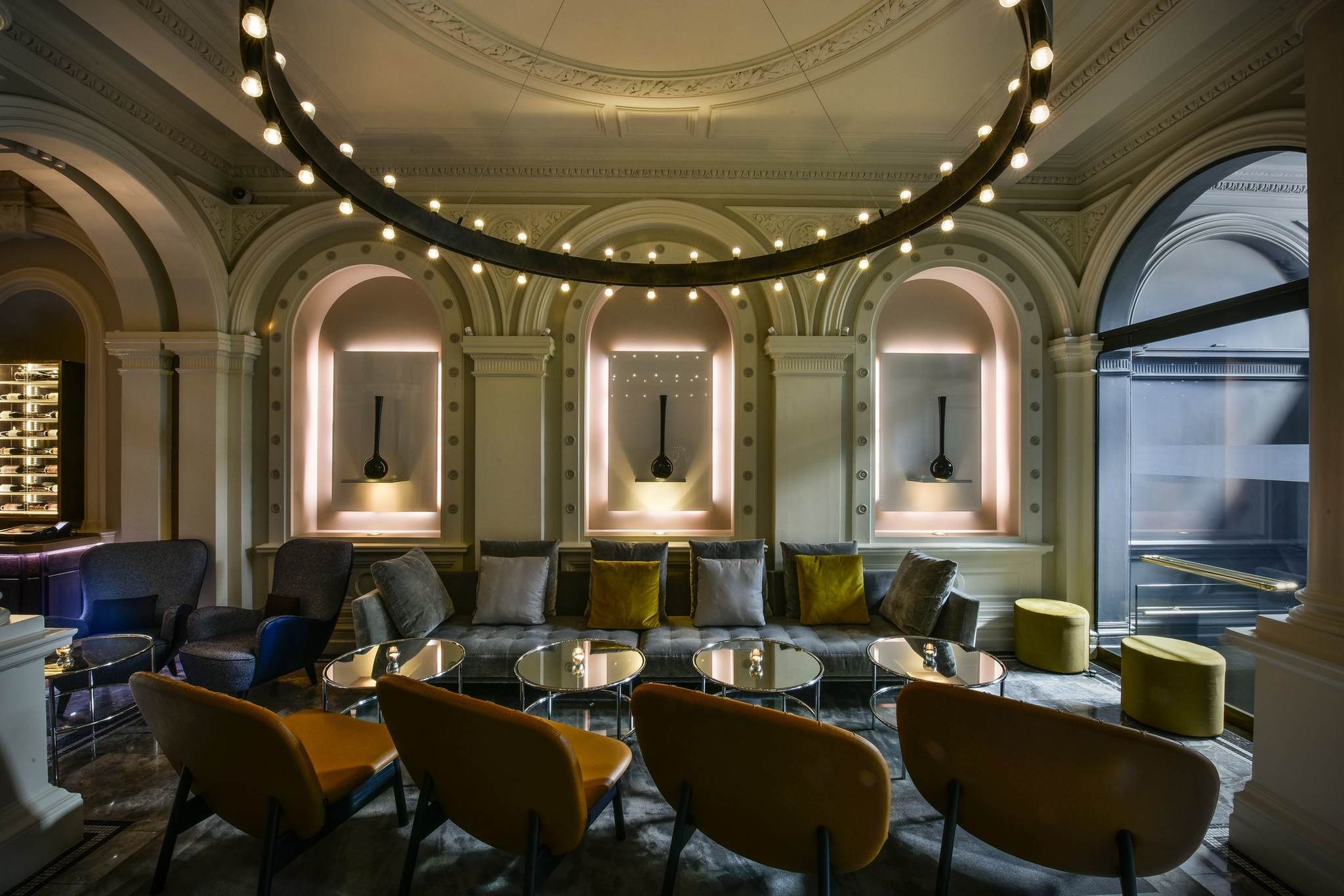 Working from ara Designs brief, Northern Lights developed two large bespoke chandeliers for both the bar and private dining areas. At 2m in diameter, the sweeping bespoke chandeliers complement the ornamental vaulted ceiling and hold their own in such a grand setting. A bespoke lighting solution was needed to match the scale of the surroundings. The rustic burnished bronze finish was also an effort to blend in with its grade two listed surroundings. It does, however, contrast sharply with the lacquered glass bar top and the velvet seating, itself an elegant mixture of grey, blue and mustard yellow.