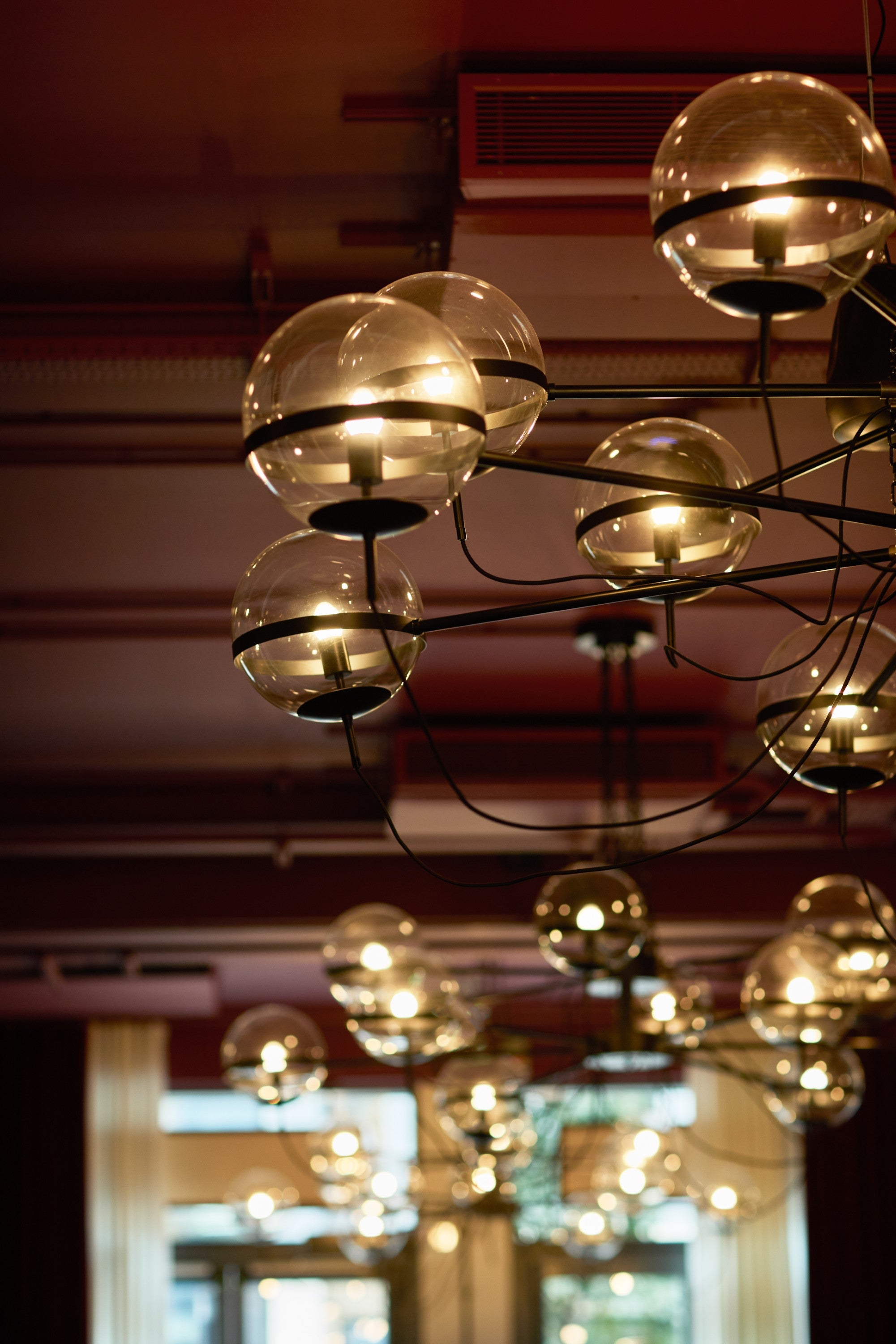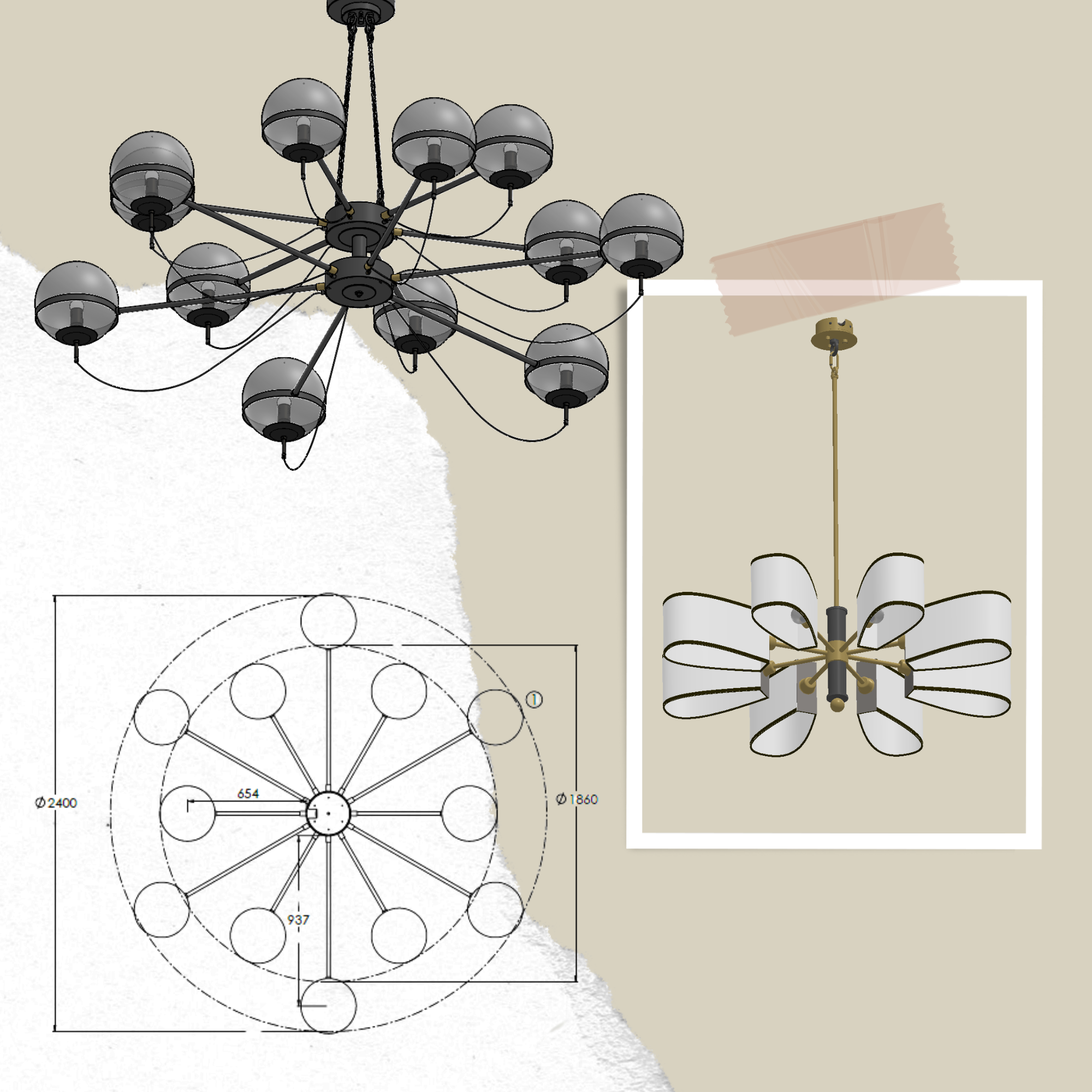 The second ceiling light design features elegant petal-shaped fabric shades that gently curve around each of the eight lamps, their contrasting trim adding a refined touch. The soft fabric balances the scheme’s industrial elements, introducing warmth and a welcoming, residential-inspired atmosphere. To ensure cohesion across the lighting scheme, the metal framework is finished in the same expertly applied tones as the chandeliers, reinforcing a sense of harmony and craftsmanship.
