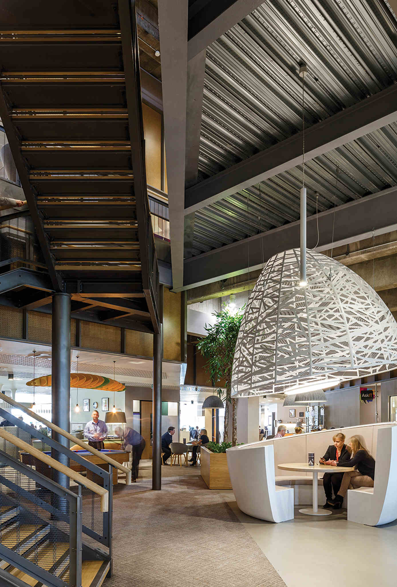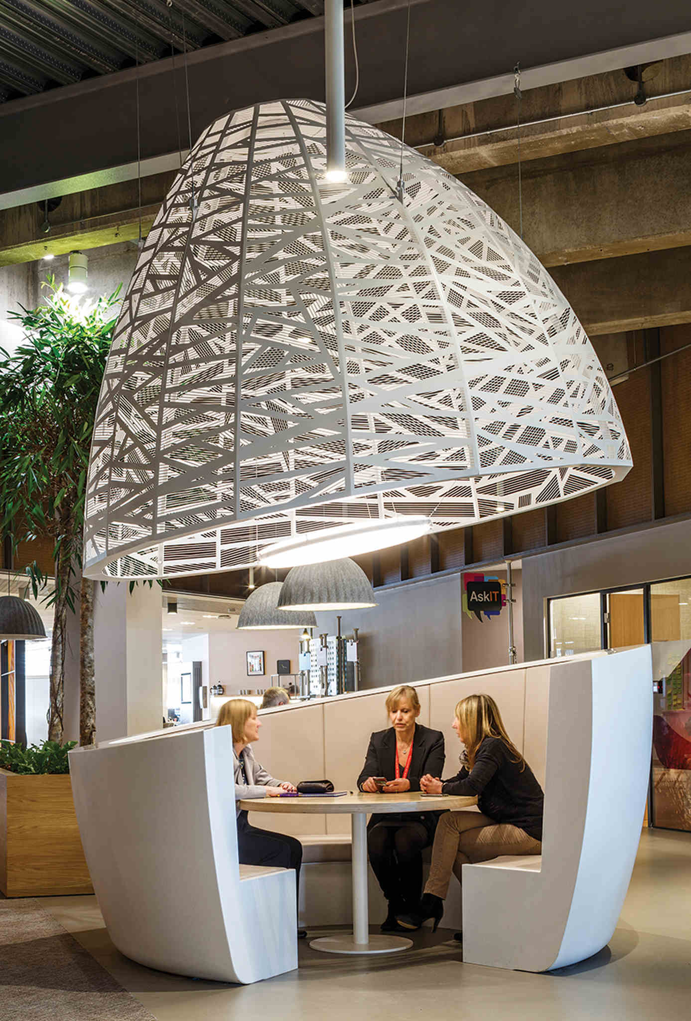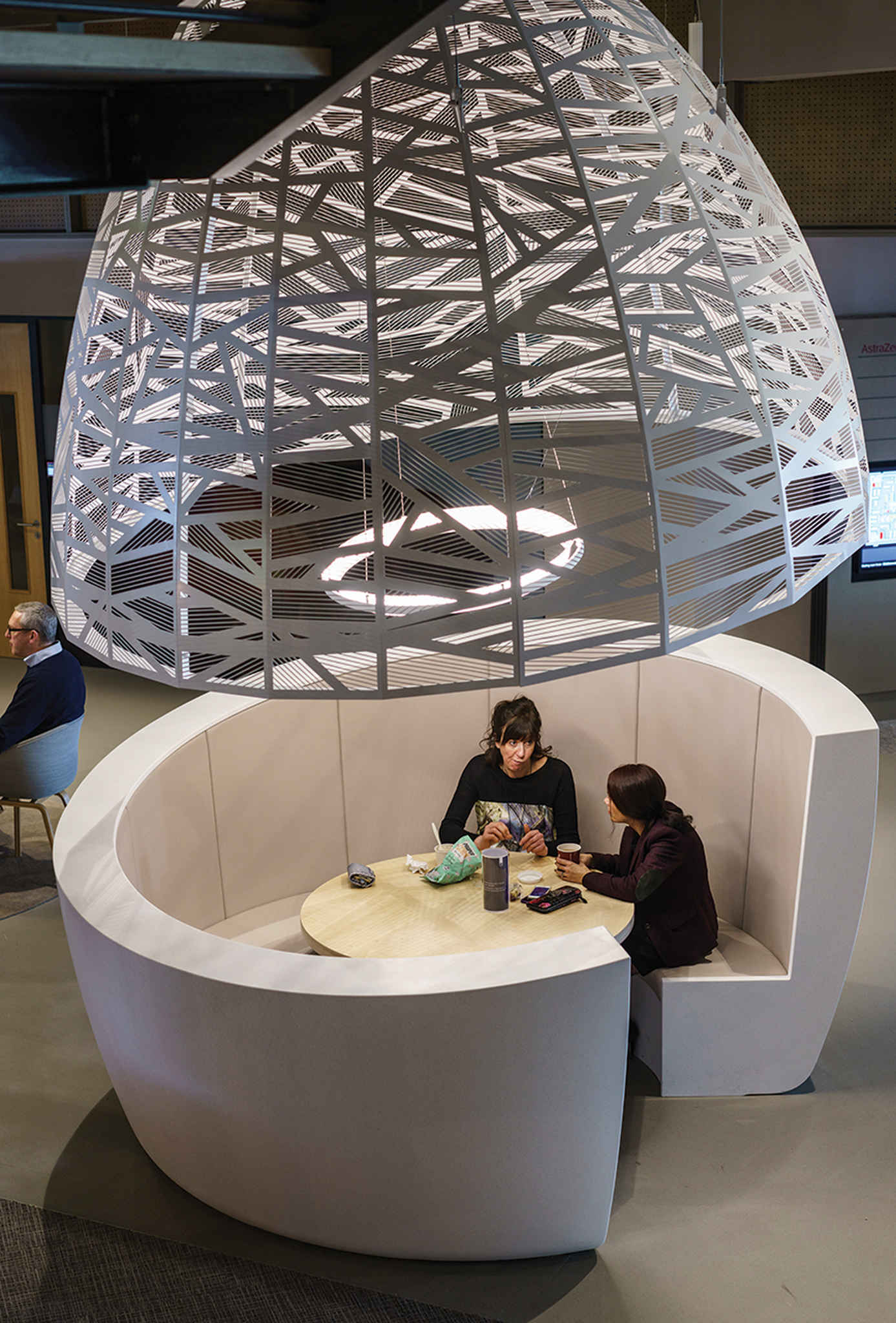 Measuring almost 3m in diameter, the bespoke chandeliers match the scale of the office. Creating a striking impact is vital in such a sizeable open-plan workplace. Together with the seating solution, the bespoke lighting forms the distinctive cocoon units that provide informal meeting places — facilitating and promoting the exchange of knowledge and ideas between colleagues.