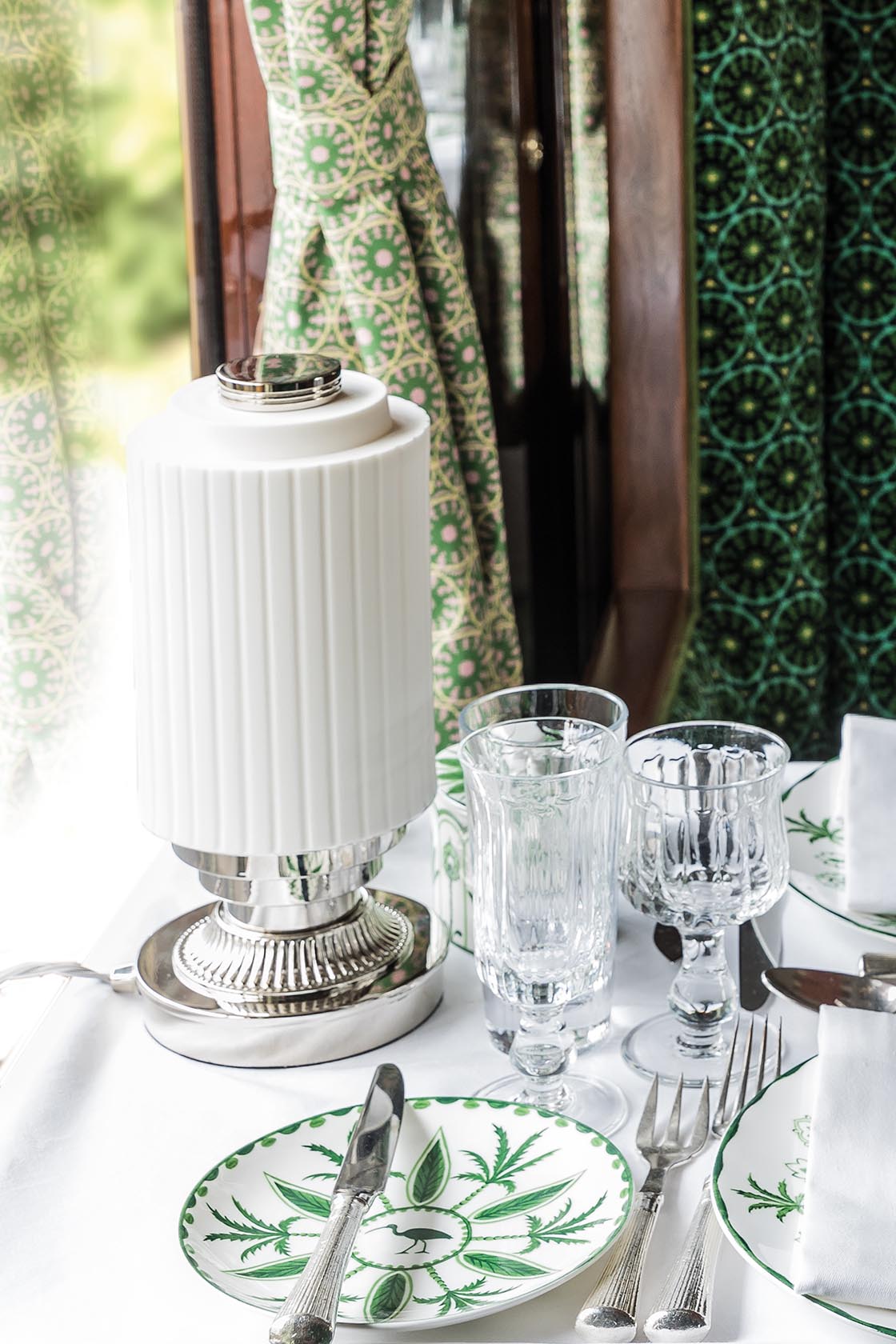 The turned parts that detail the fitting were created in our machining workshop and then electroplated with nickel as it has a softer appearance. The warm ambient light that the Porcelain shade casts is consistent with the illumination of other lamps that Belmond always specify in their luxury Pullman train carriages and creates a flattering light for diners and a warm, inviting interior.