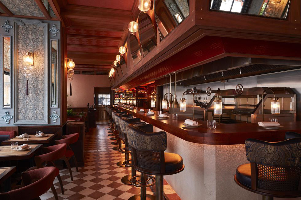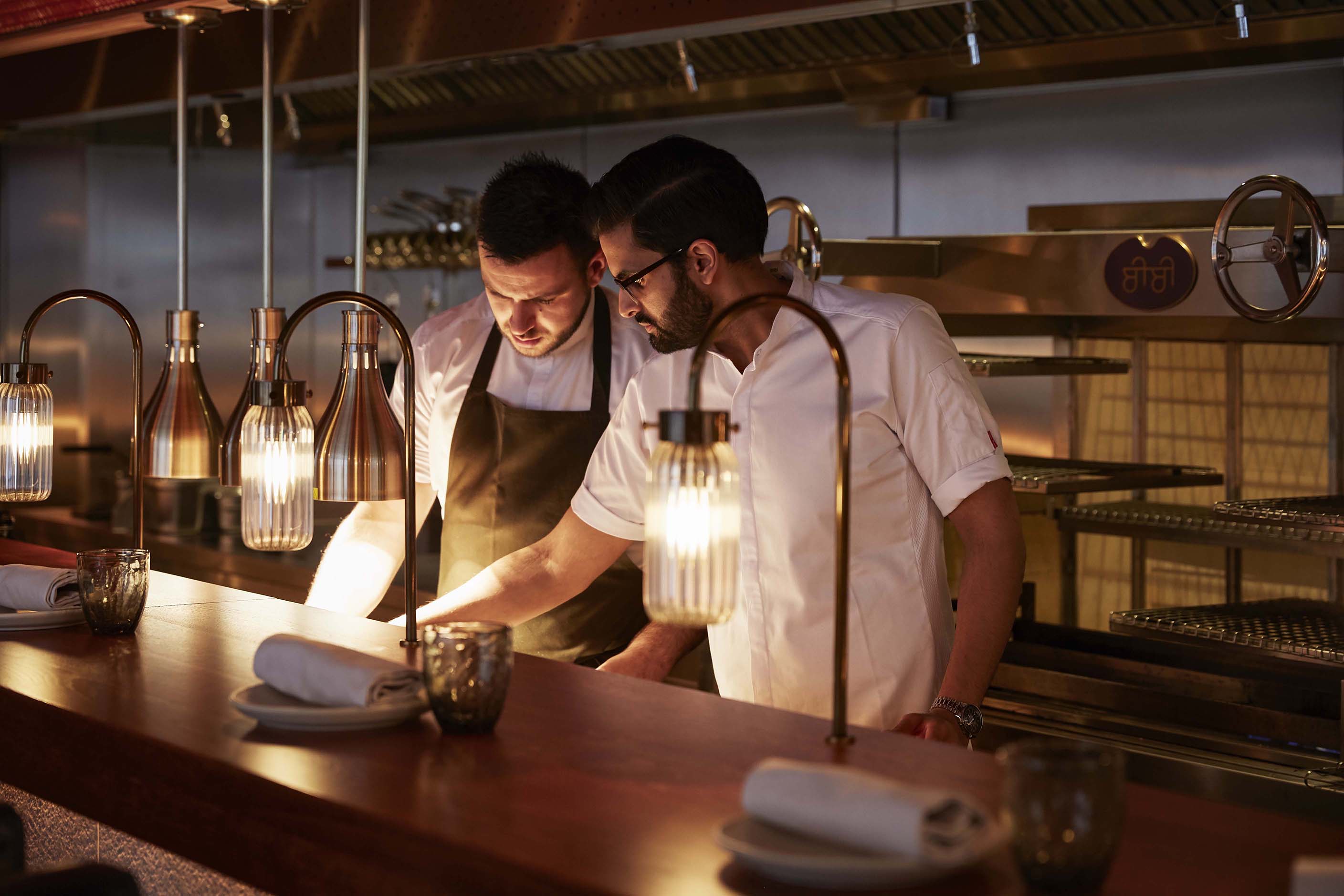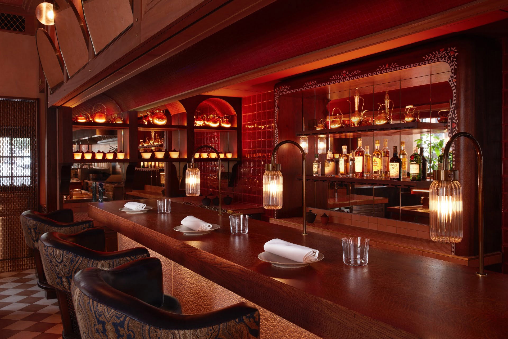 The restaurant seats 33 guests and an additional 20 on the terrace. The high-end opening is backed by the JKS group, which owns Gymkhana and numerous other well-loved restaurants like Hoppers, Lyle's, and Bao. An open kitchen and bar run from front to back, and a row of tables running adjacent, all utilised as cosy booths that make the most of the narrow space.