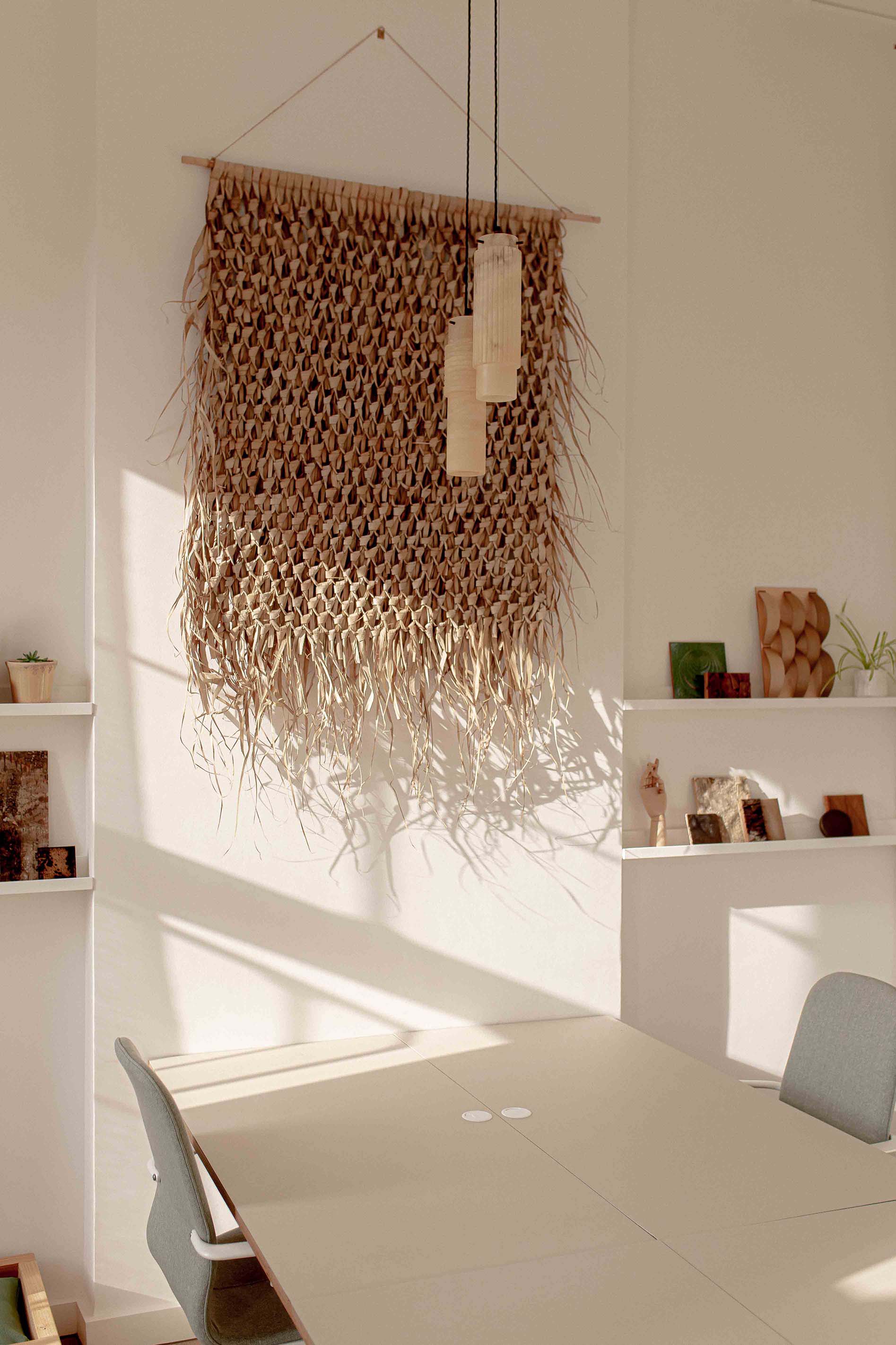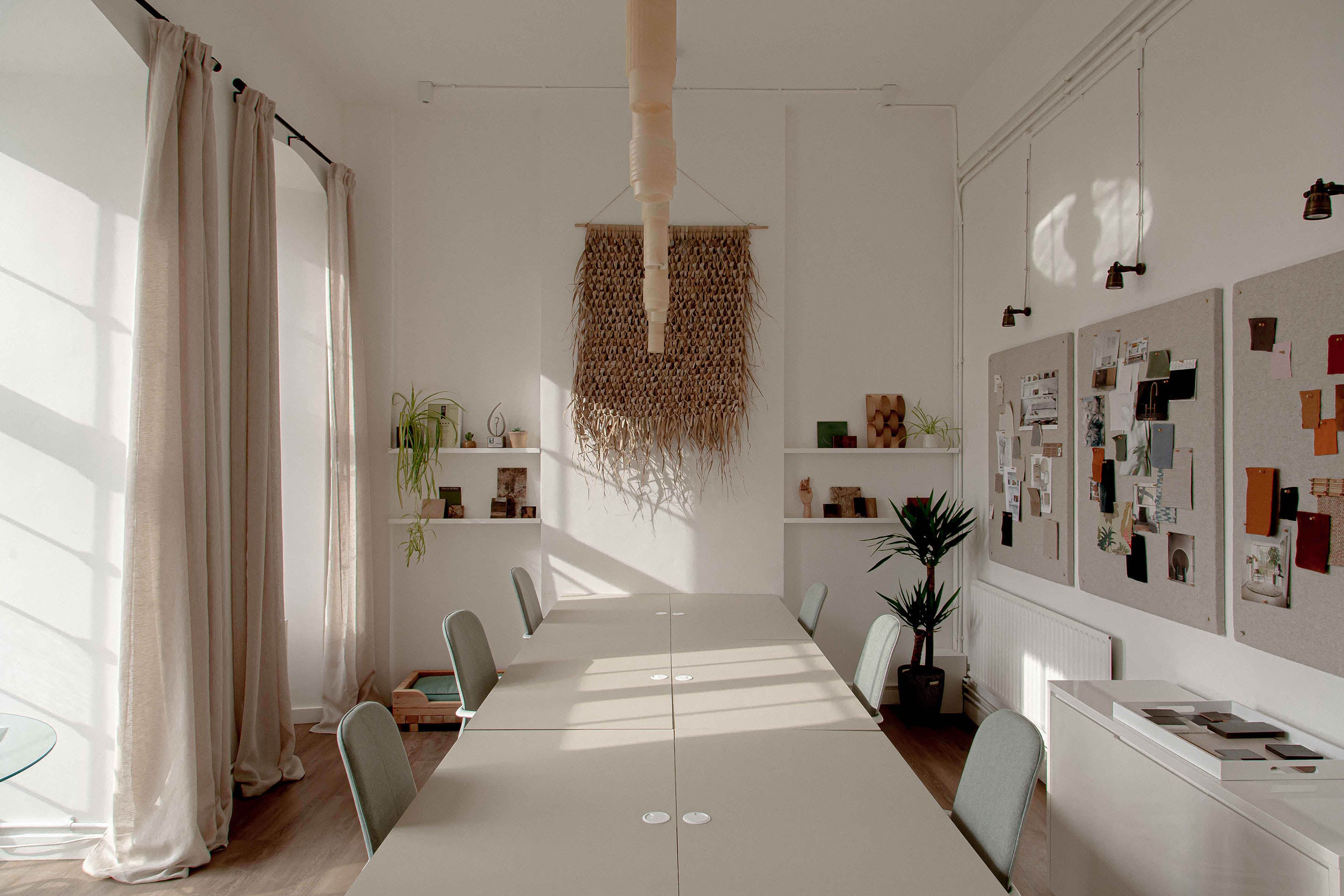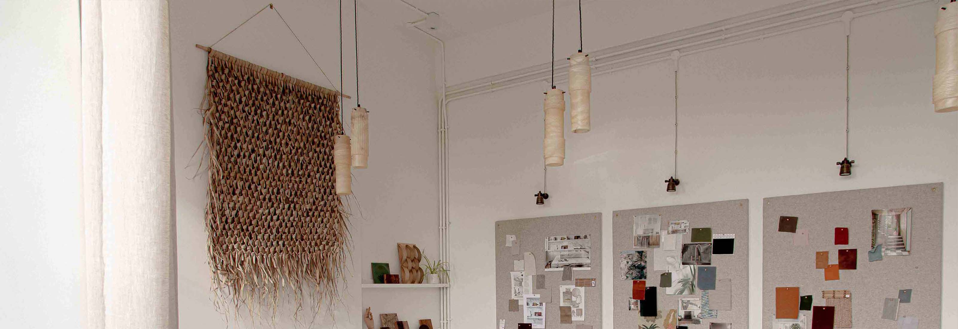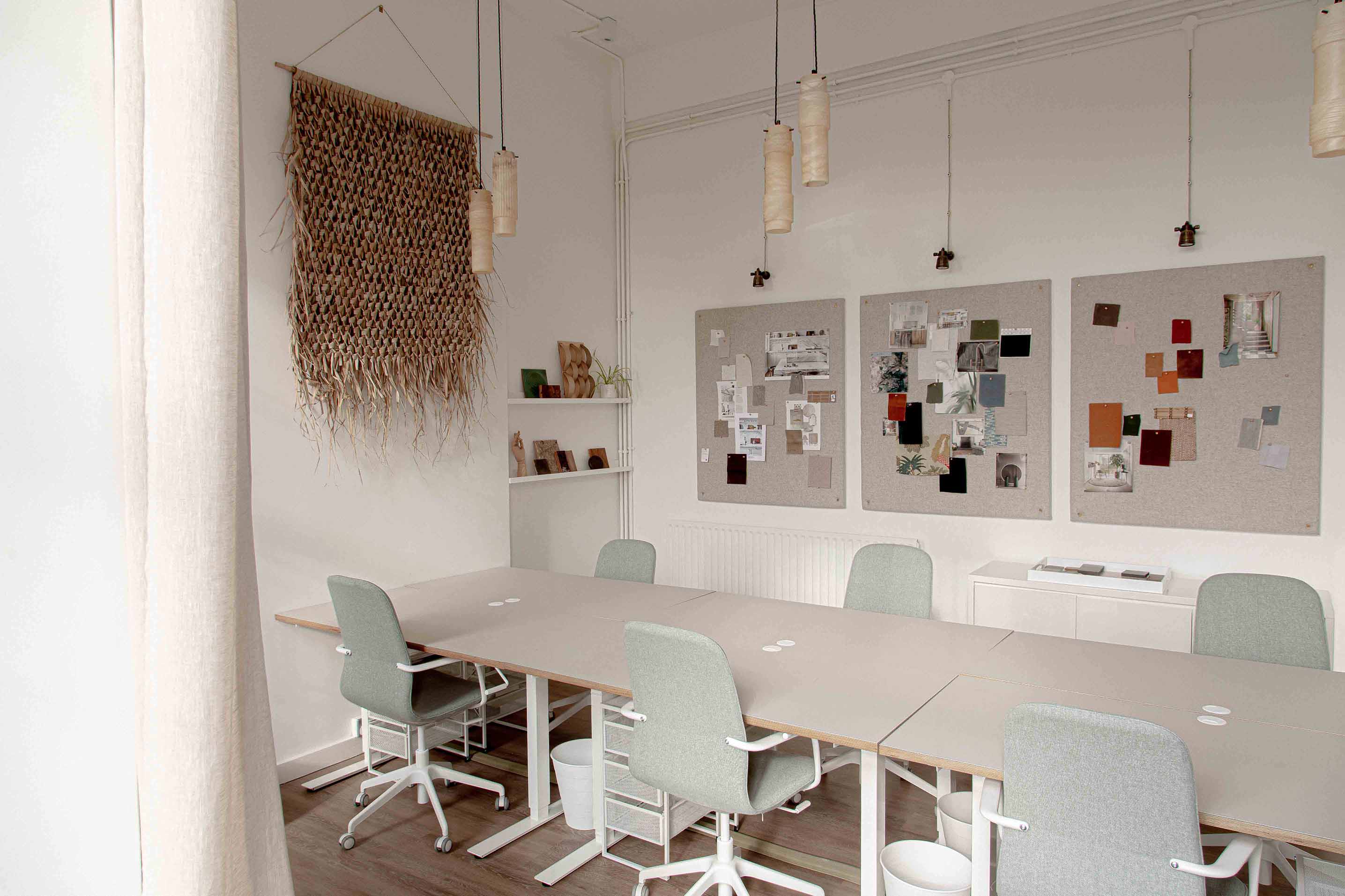 Above the studio's meeting table are three sets of our bespoke Luna pendants, which combine gorgeous hand-cut ivory alabaster with Old English Brass details. The versatility of the pendants allows for various compositions, and in this instance, they play off the well-arranged light hues displayed throughout the plan. The beautifully bright ivory veins displayed by the natural alabaster stone complement the rustic wicker wall ornament, as well as the stone-coloured mood boards that adorn the walls.