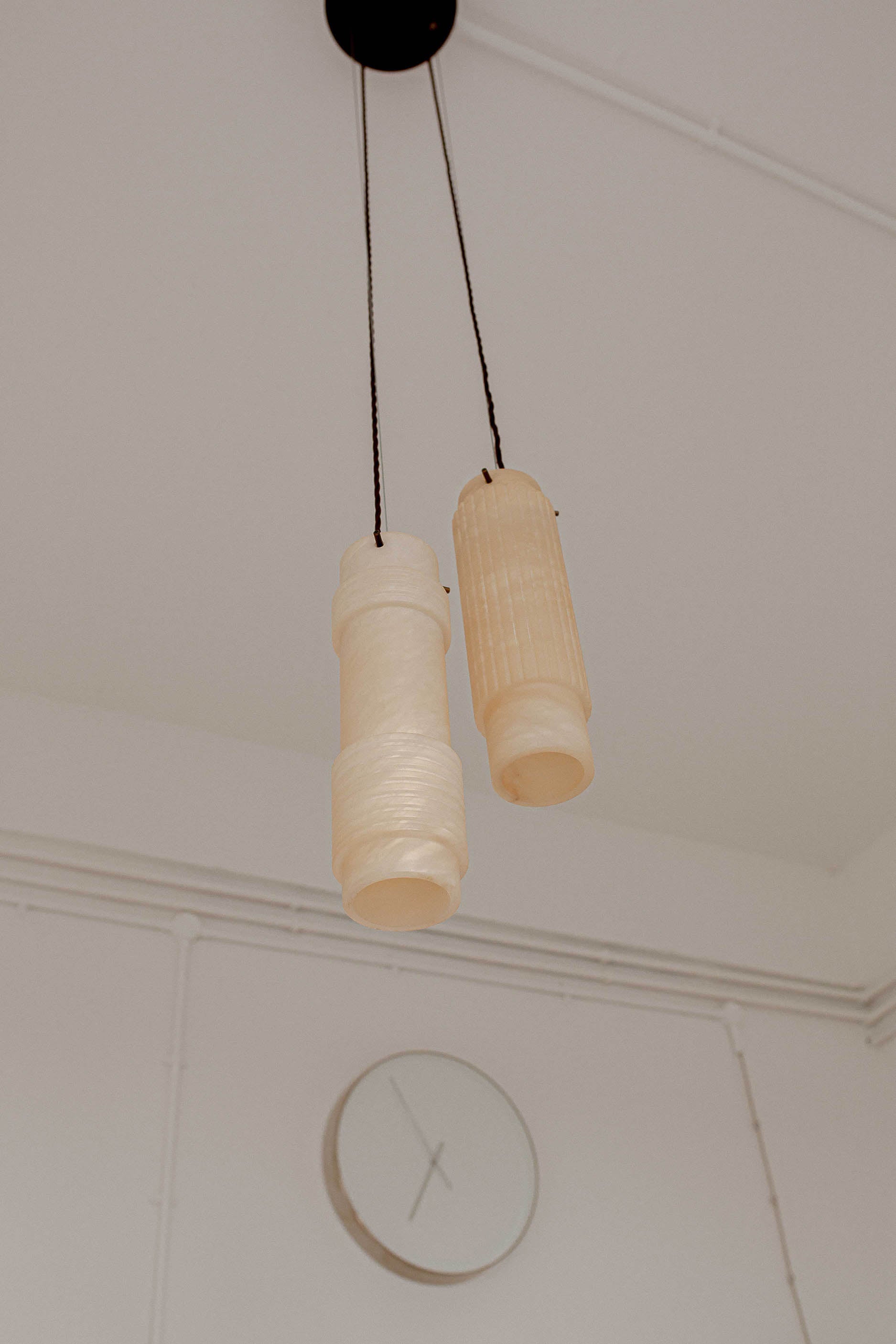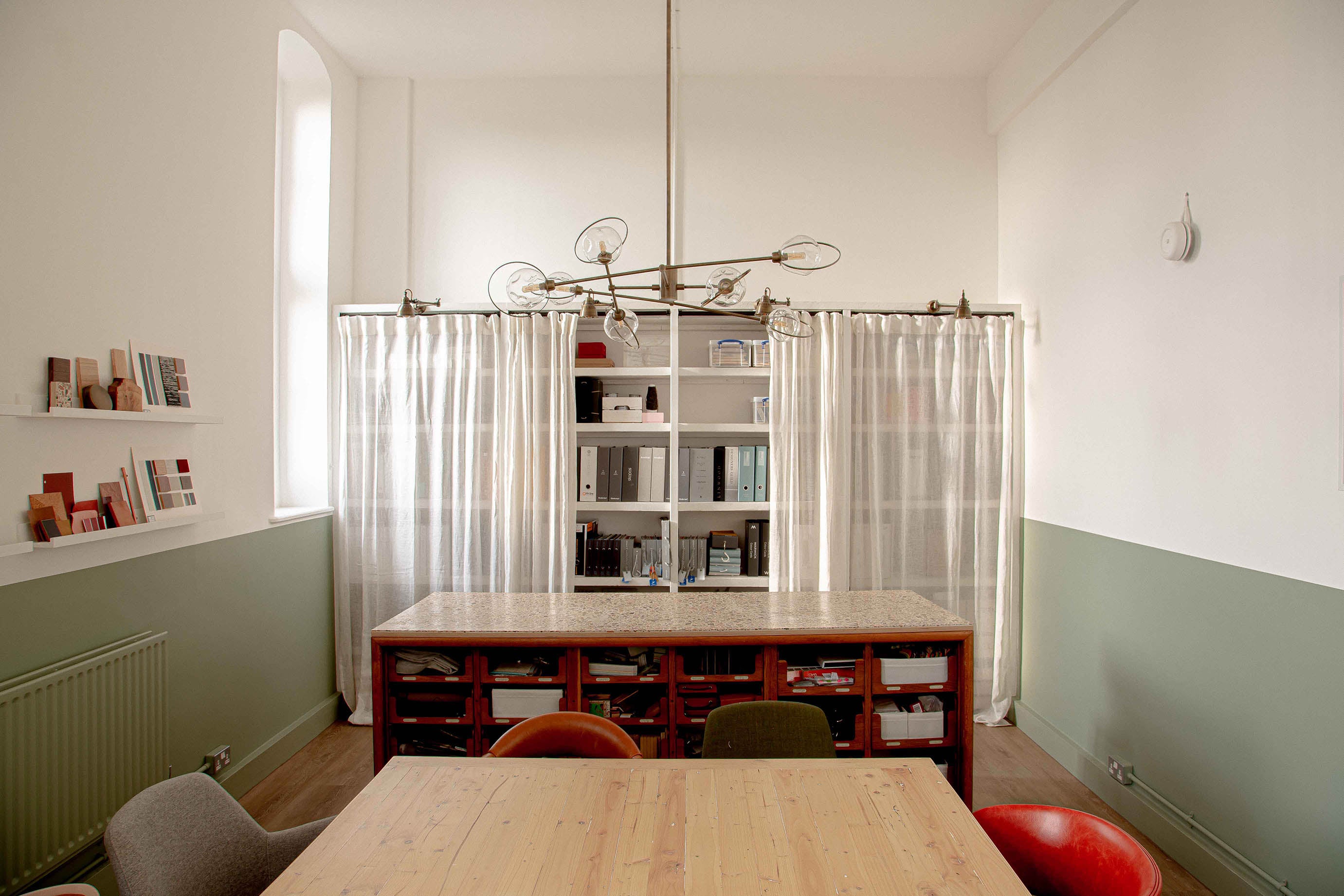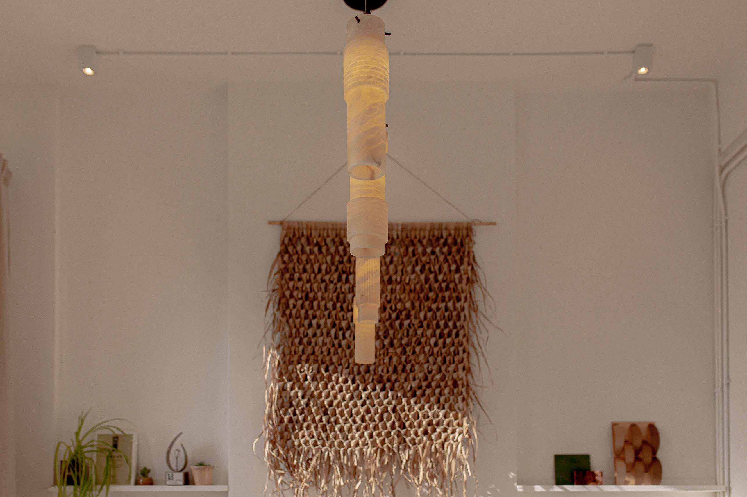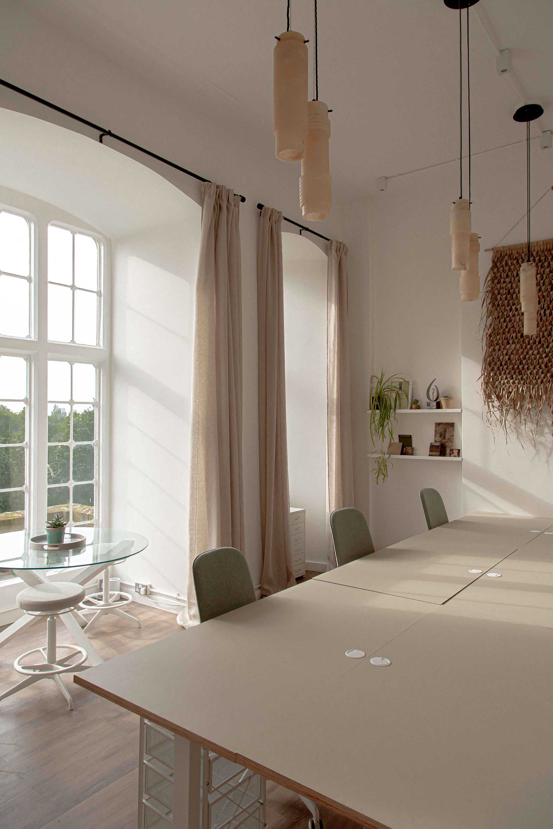 Above the studio's meeting table are three sets of our bespoke Luna pendants, which combine gorgeous hand-cut ivory alabaster with Old English Brass details. The versatility of the pendants allows for various compositions, and in this instance, they play off the well-arranged light hues displayed throughout the plan. The beautifully bright ivory veins displayed by the natural alabaster stone complement the rustic wicker wall ornament, as well as the stone-coloured mood boards that adorn the walls.