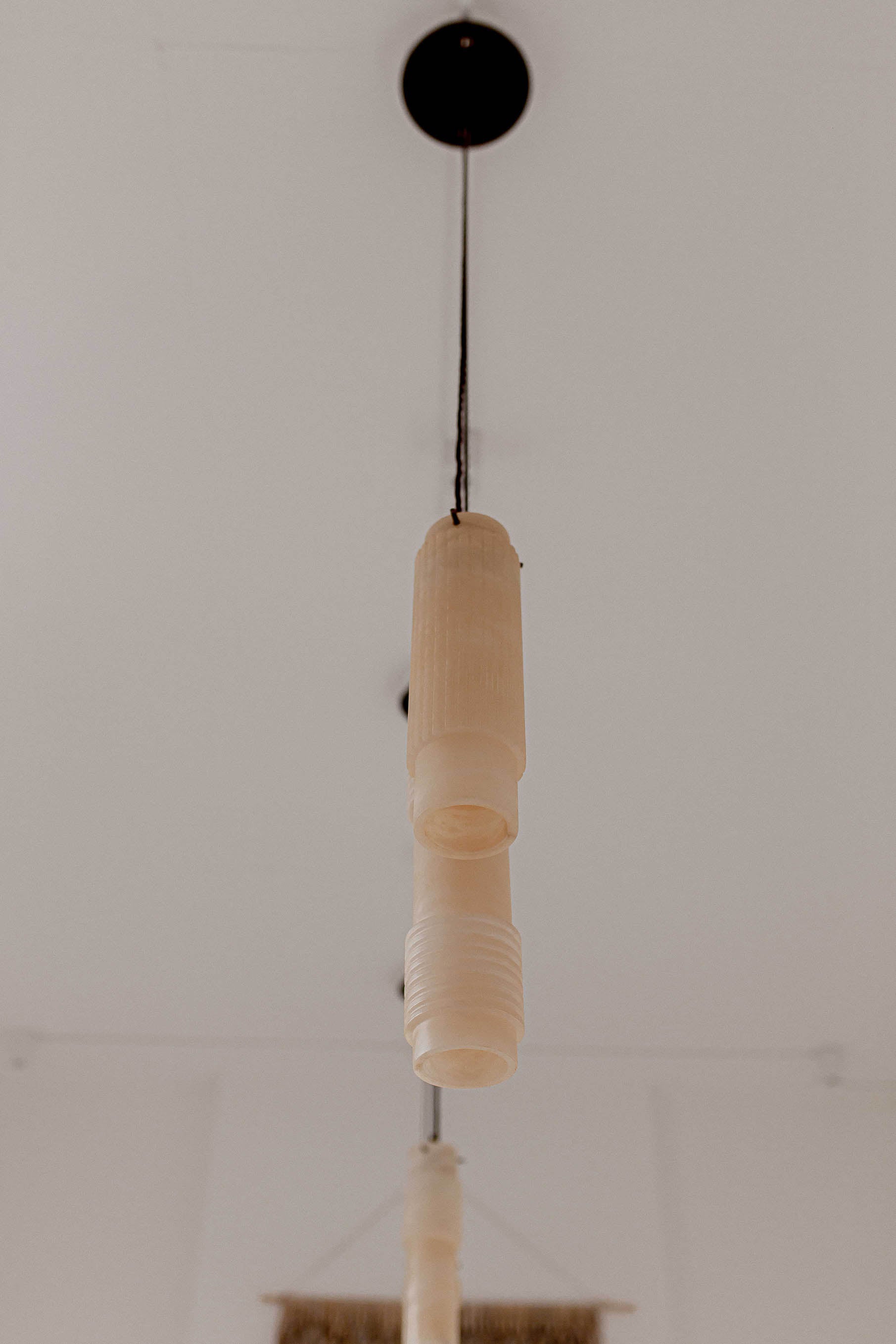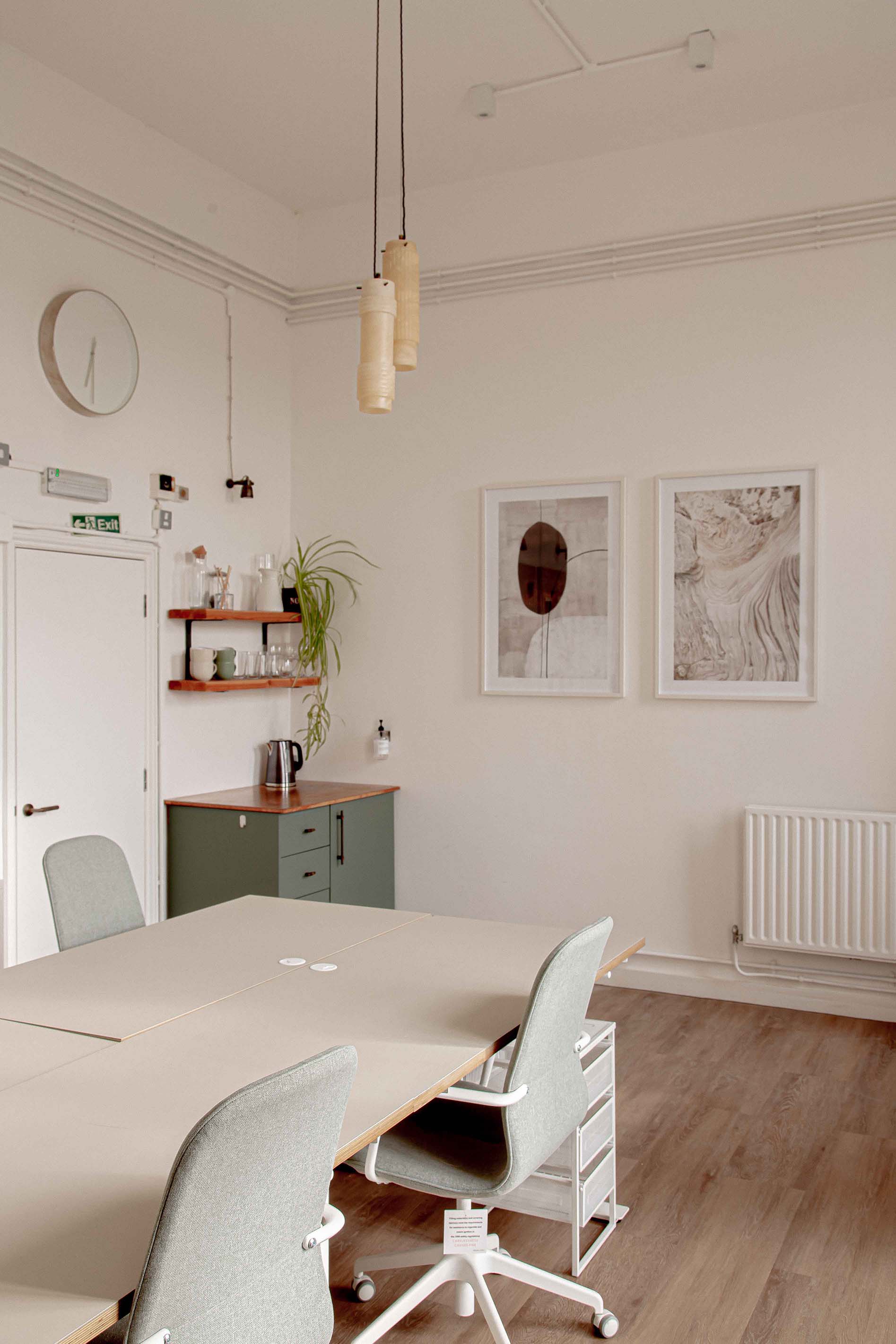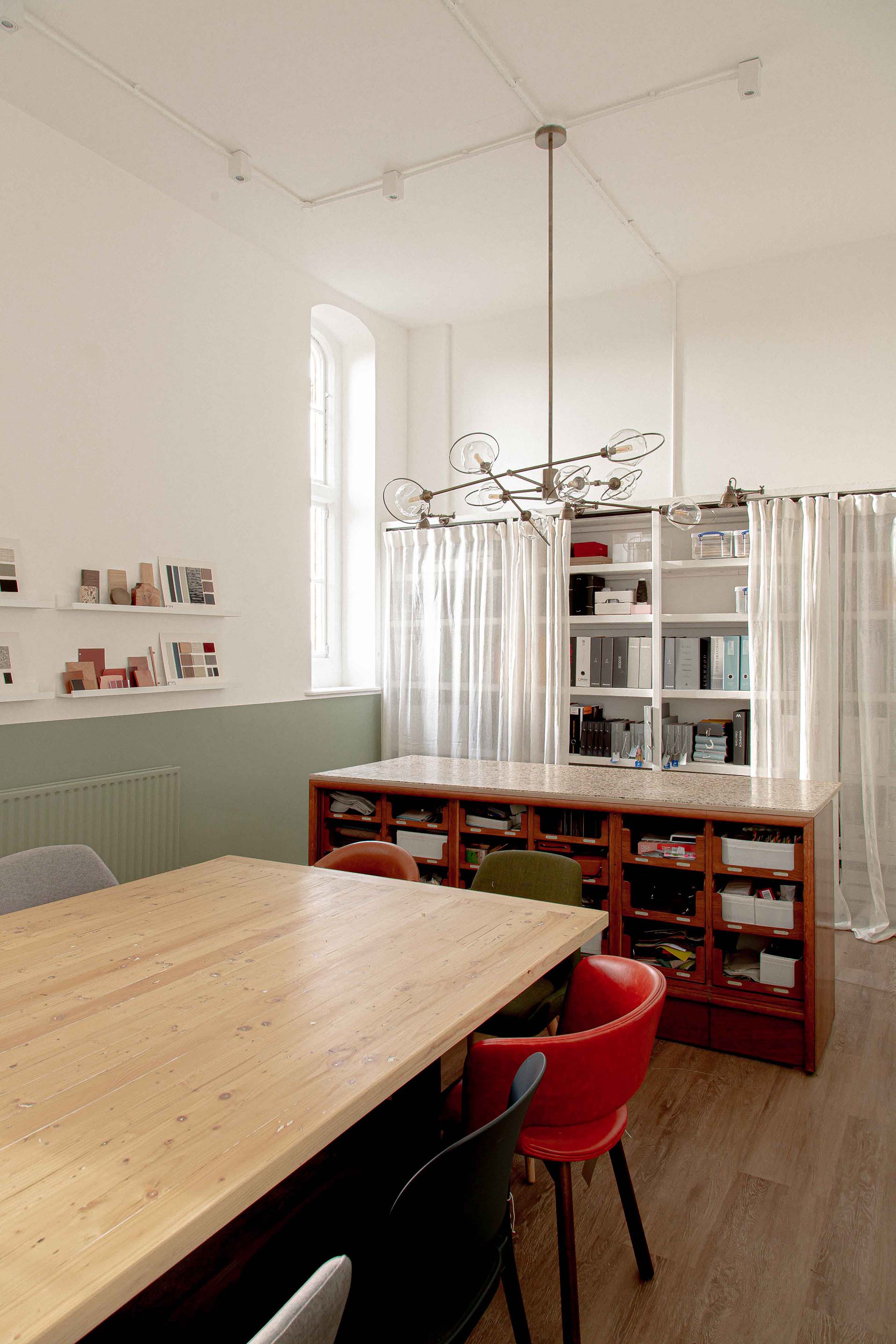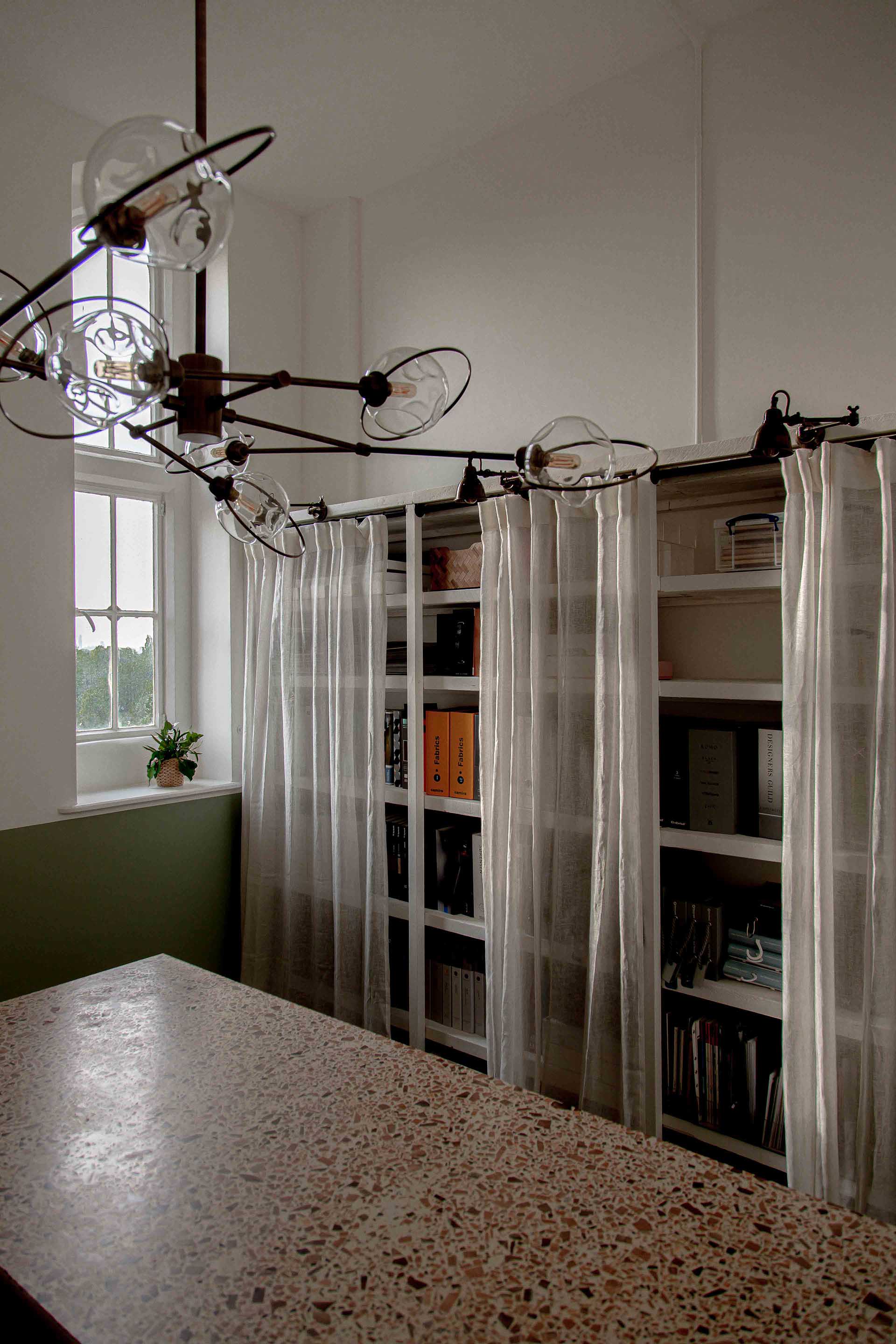 Above the studio's meeting table are three sets of our bespoke Luna pendants, which combine gorgeous hand-cut ivory alabaster with Old English Brass details. The versatility of the pendants allows for various compositions, and in this instance, they play off the well-arranged light hues displayed throughout the plan. The beautifully bright ivory veins displayed by the natural alabaster stone complement the rustic wicker wall ornament, as well as the stone-coloured mood boards that adorn the walls.
