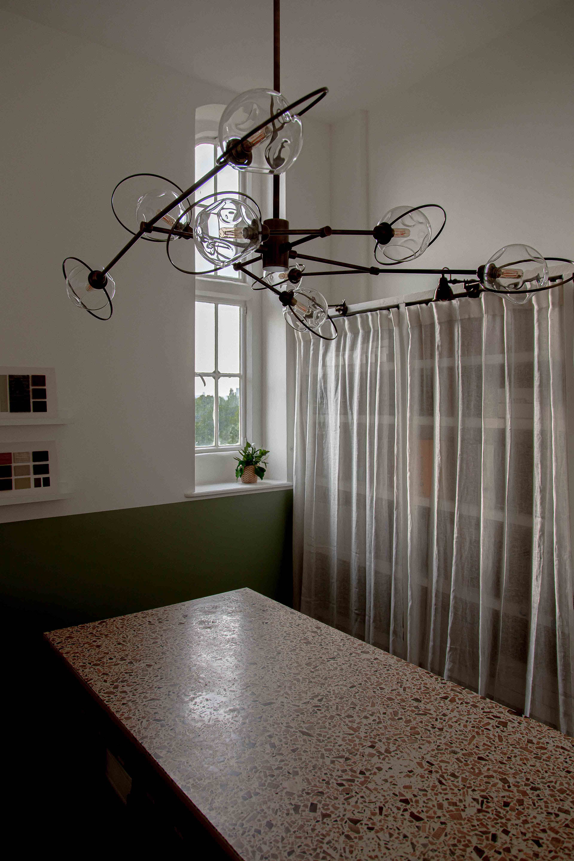 Elsewhere, our spectacular Celeste chandelier acts as a focal point above a stunning marble table. The hand-finished Georgian Brass stems are crowned by intricately blown glass orbs, all of which are haloed by precisely-shaped brass rings. The contemporary design of our Celeste chandelier adds further character to this charming section of the office space without turning attention away from the delicately applied details, courtesy of Hayward Construction.