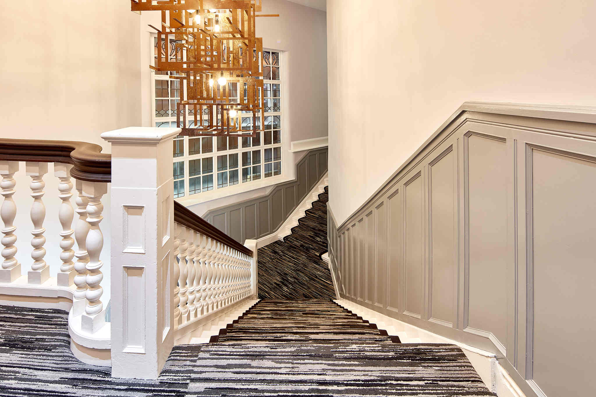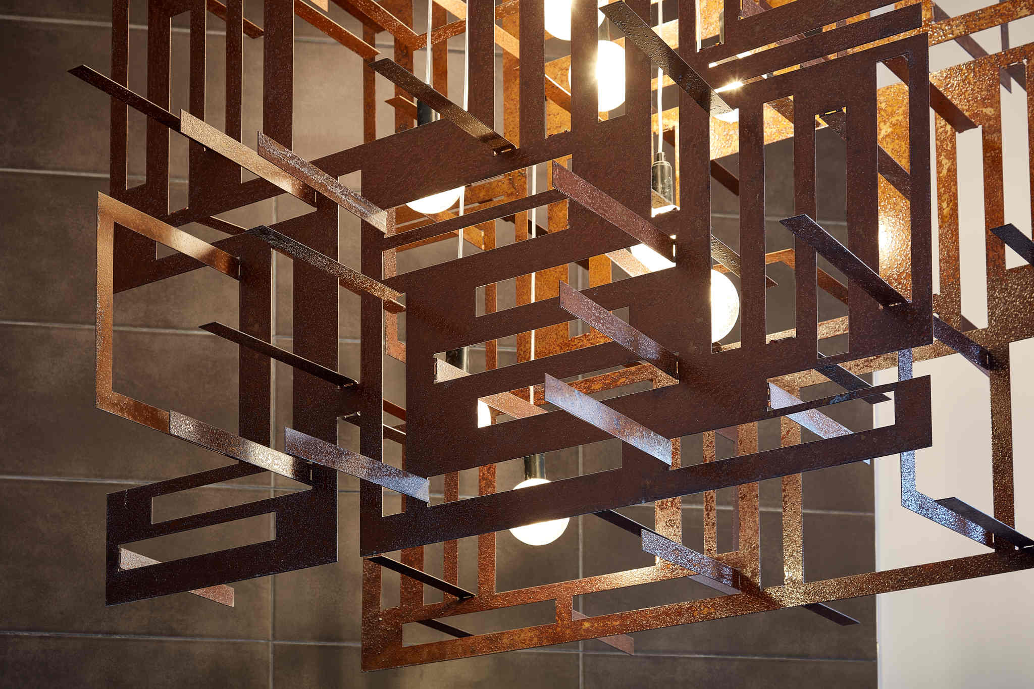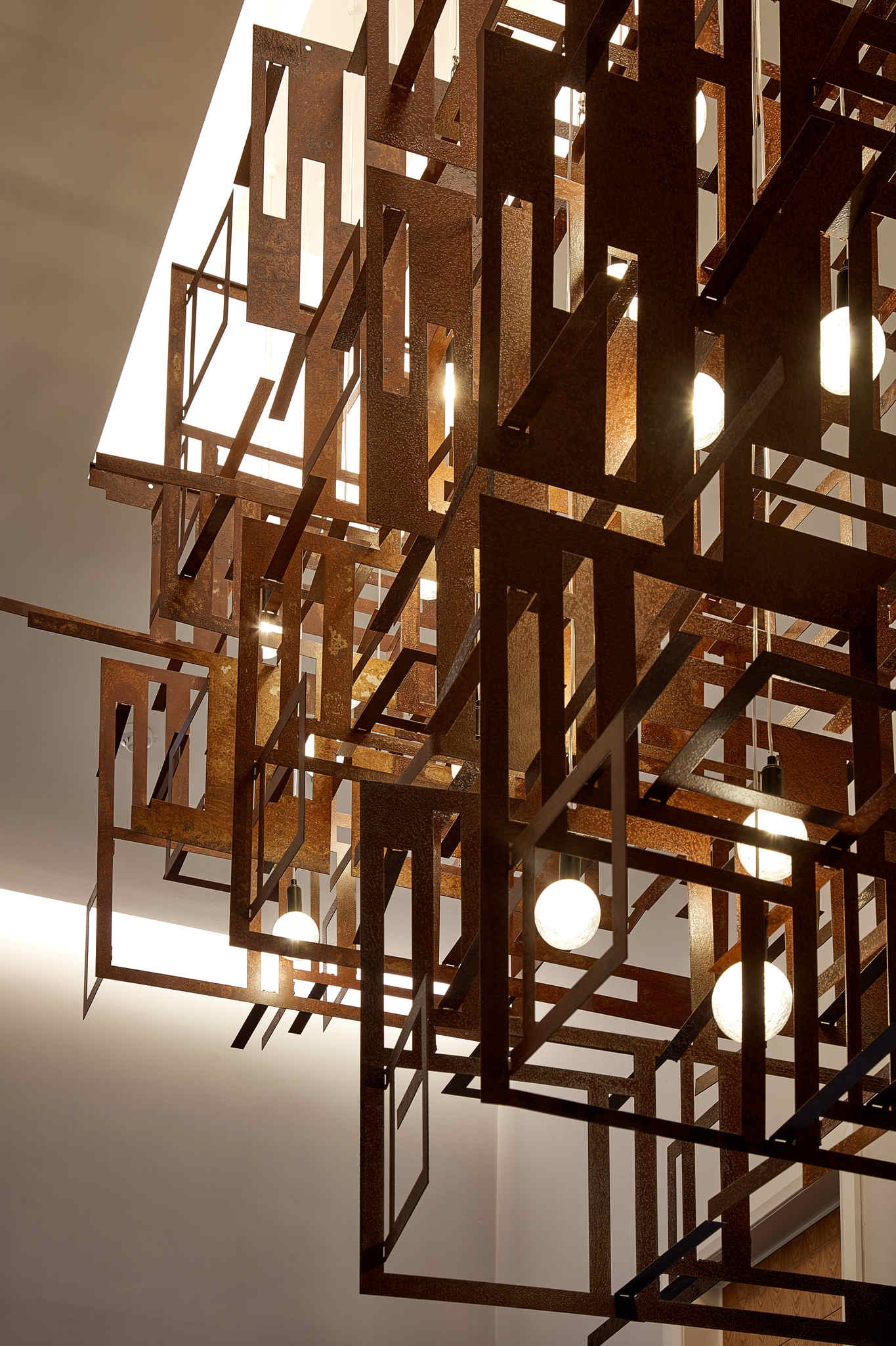 The bespoke chandeliers measure more than four metres wide, with the largest bespoke chandelier comprising of five panels. The smaller custom chandeliers above the staircase are 1.5 metres wide with two panels. The linear geometric patterns have a modern post-industrial aesthetic while the rusted finish is a nod to the unique maritime heritage of the building.