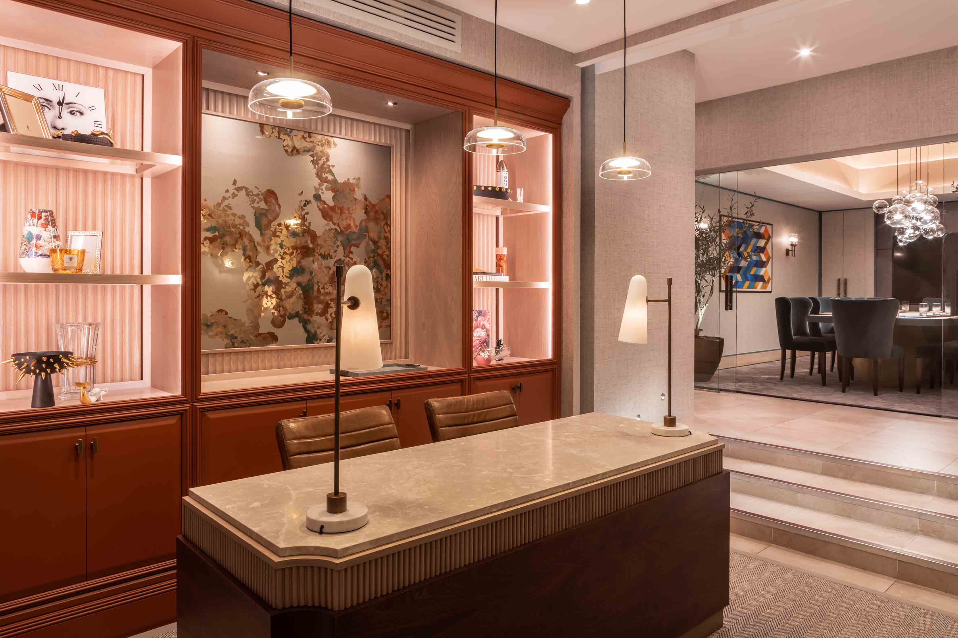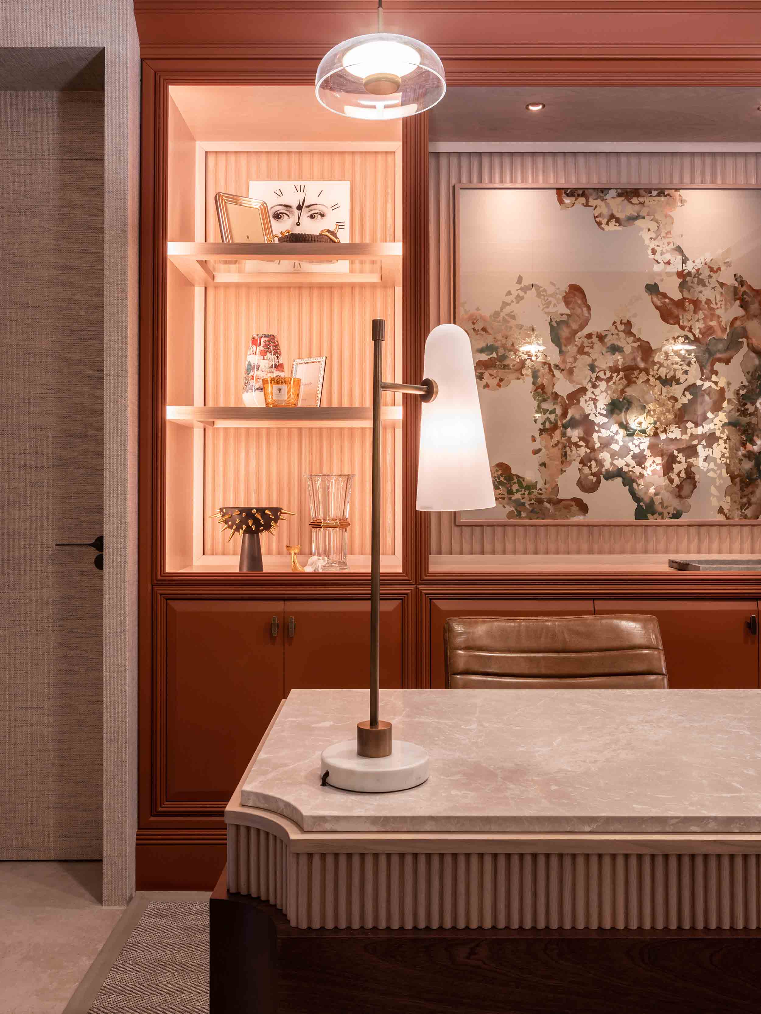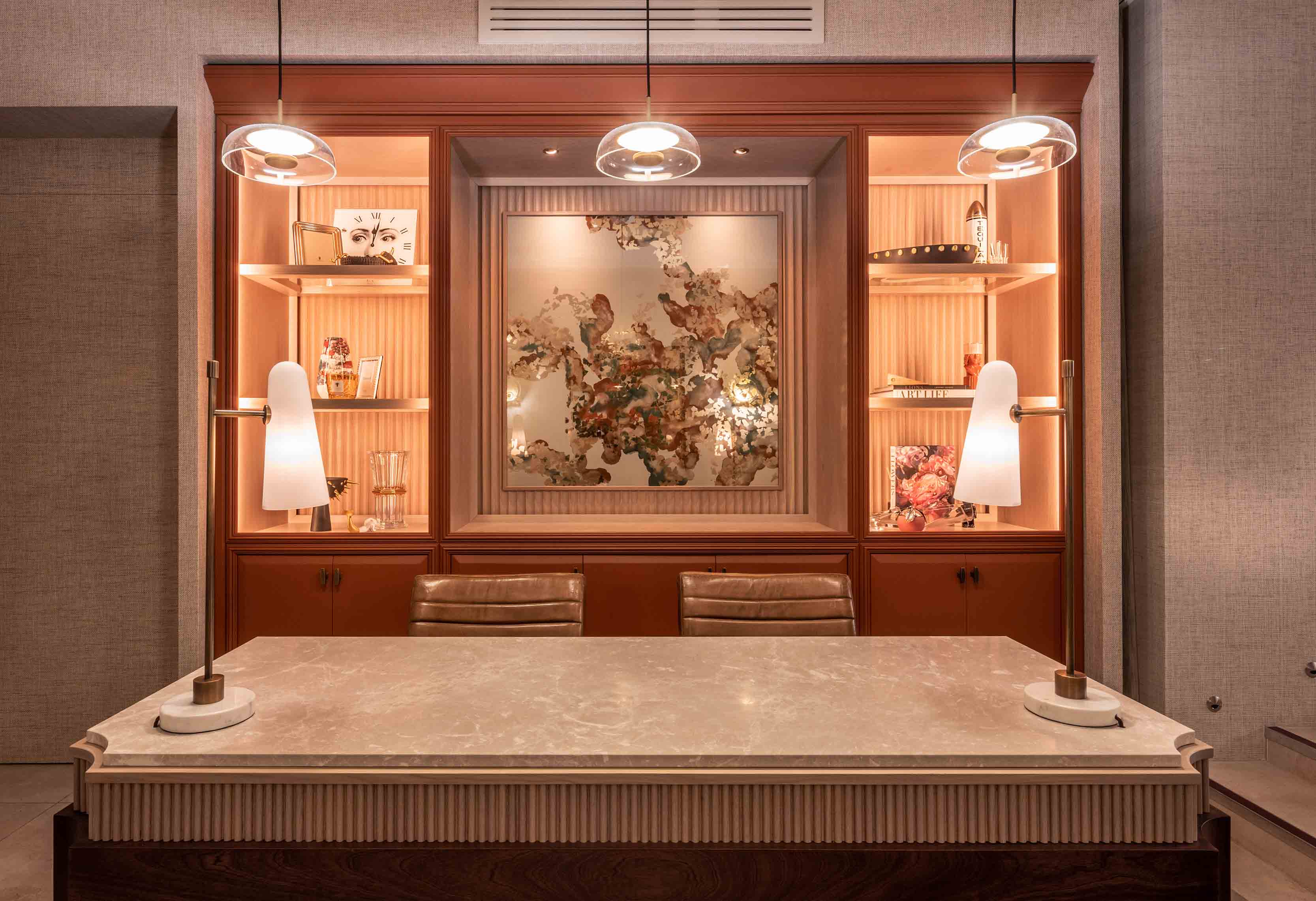 The impressively designed client waiting room features a stunning desk comprising radiant white marble and delicately carved timber fins, joined by London Cabinet Makers. Sitting flush to the top of the desk are two of our chic Brandt table lamps, which have been specially modified to be anchored into the table to conceal the wiring. Contemporary and elegant with a striking rich bronze finish, our sleek Brandt table lamp has a conical matt glass opal shade that directs a warm light onto its heavy marble base.