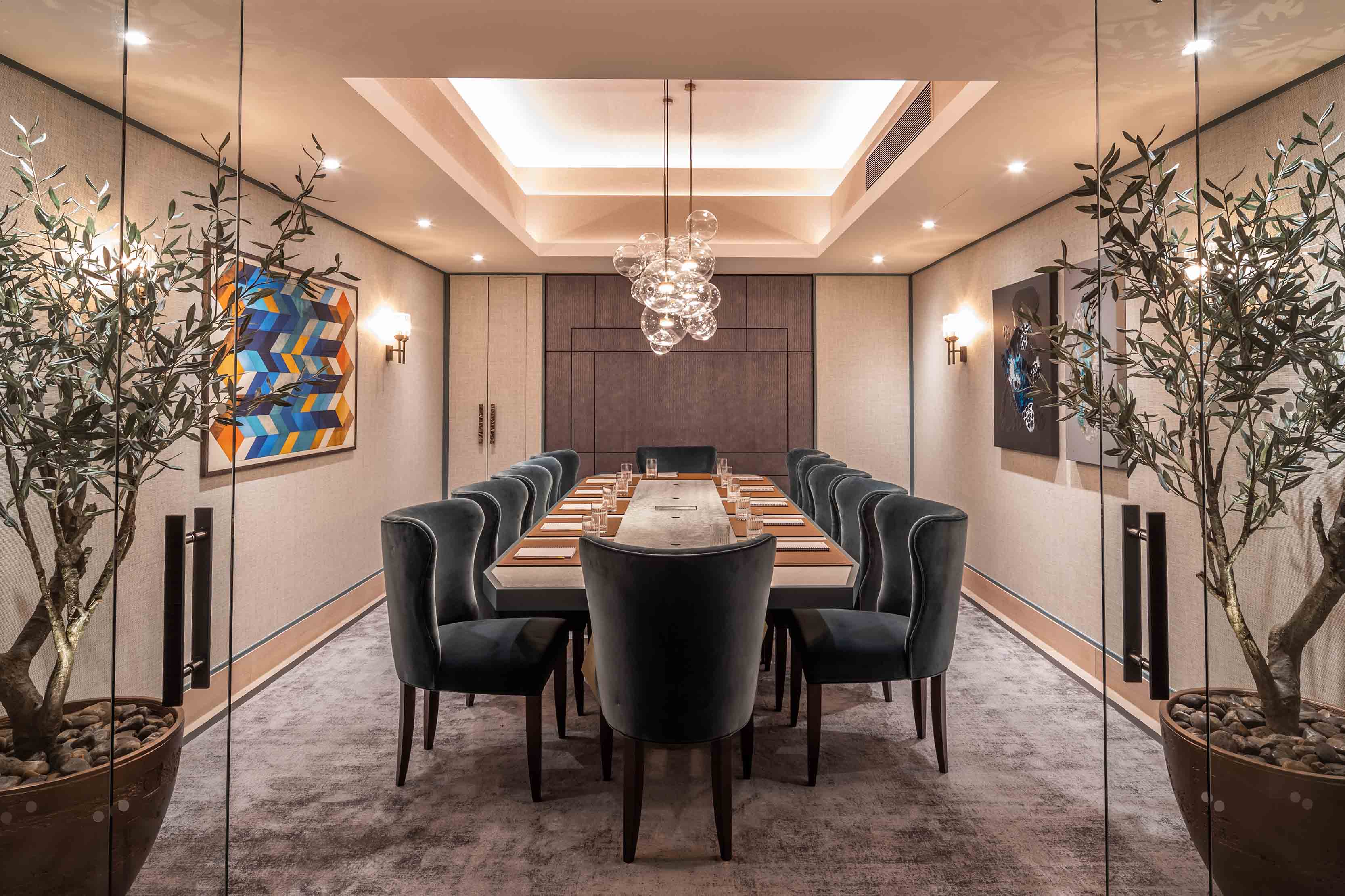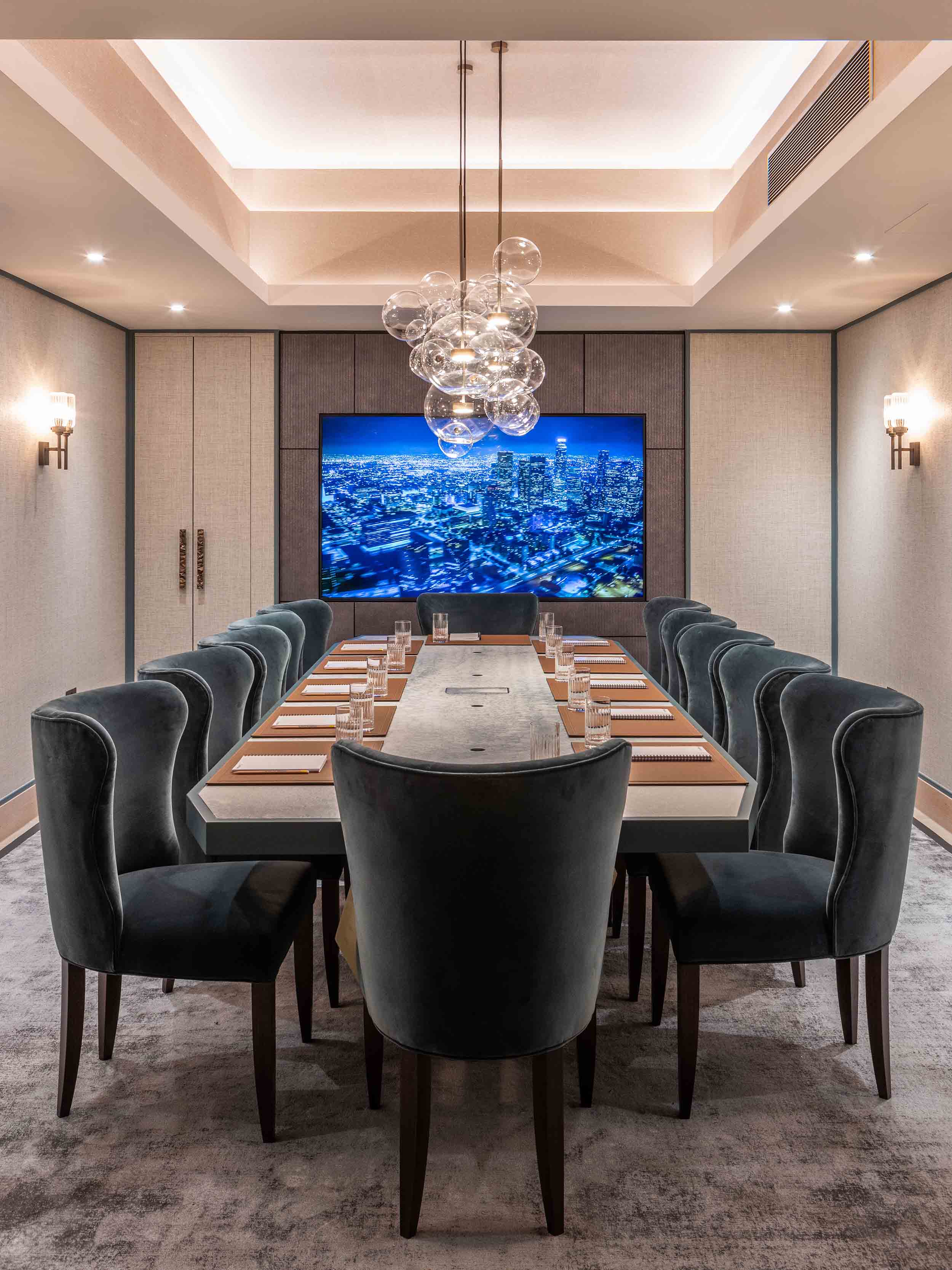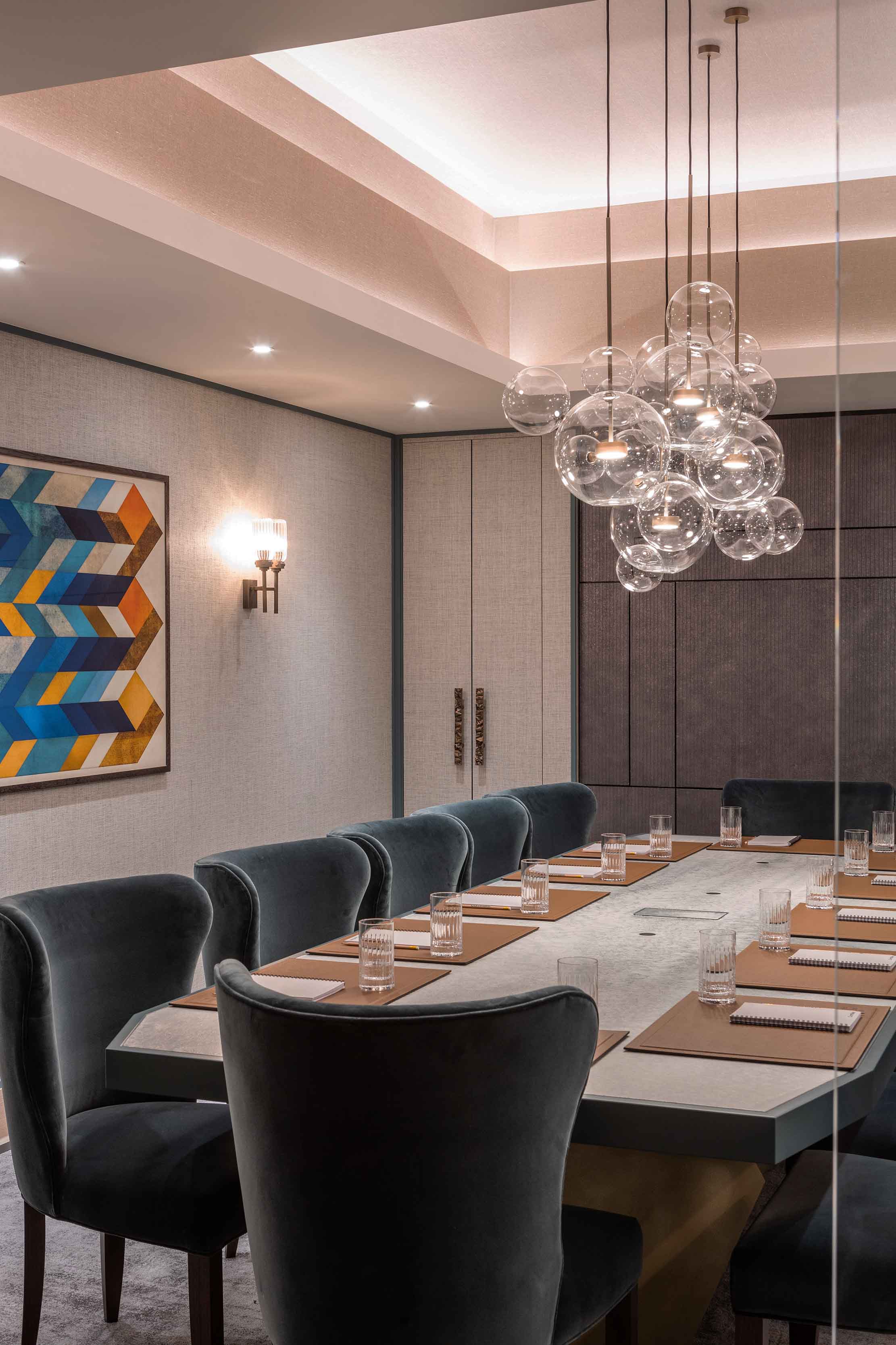 Stephenson Wright has utilised four Solti Twin wall lights to significant effect in the exceptionally decorated meeting room. Solti embodies everything we strive for – considered and unique designs and high-quality finishes. It is one of our most popular decorative fixtures. Due to its popularity, it has birthed its own collection; two variations of wall lights and chandeliers are also available. Georgian brass meets beautifully crafted clear fluted glass to create a subtle yet impactful design that can work in a variety of interiors but is especially effective in Cornflake's scheme due to the abundance of extravagant woods, marbles and brasses.