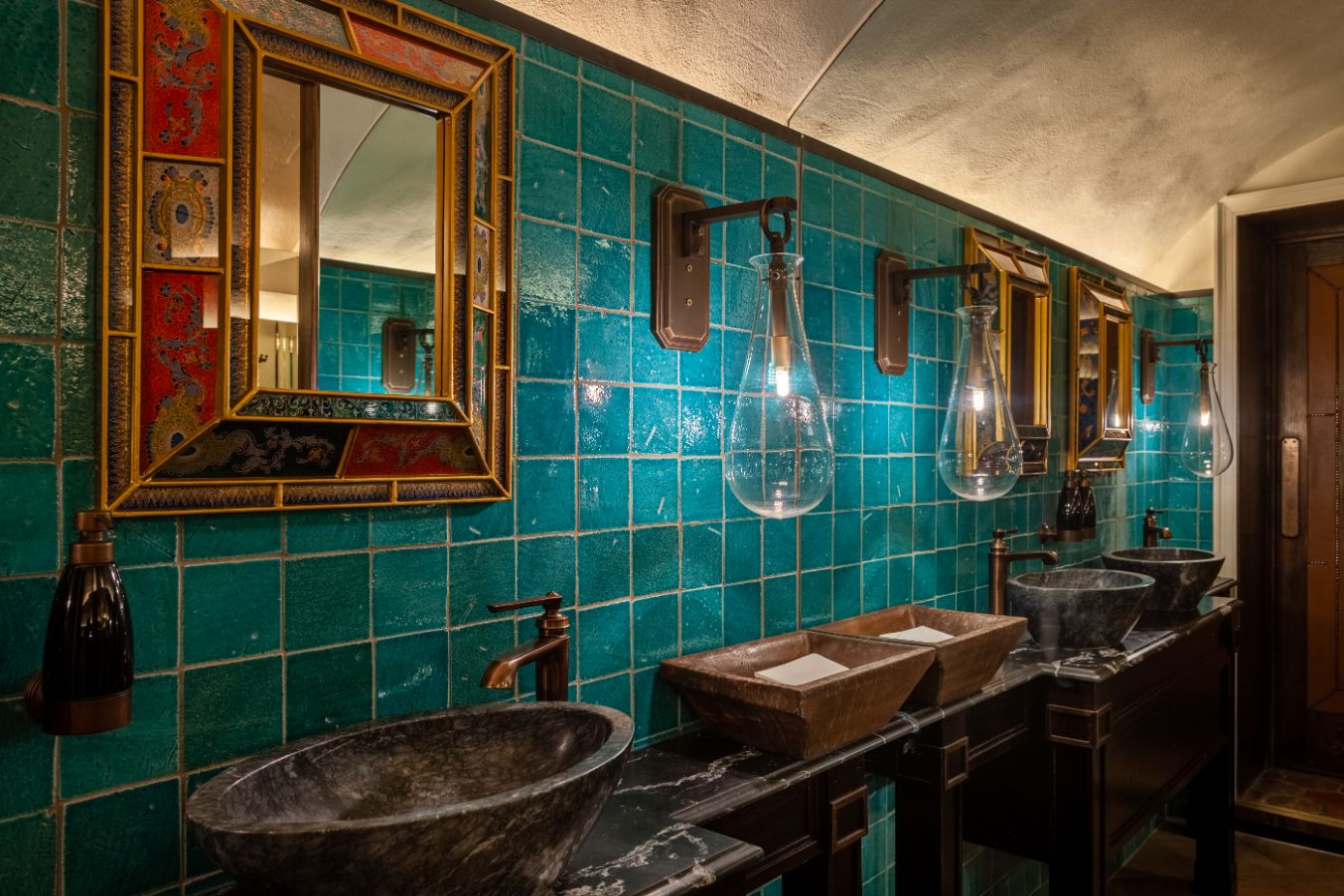 We also supplied bespoke wall lights featuring a single fluted tear-drop glass with a brass backplate in an antique finish to the equally opulent restrooms. The elegant shape and impeccable finish have shown how simple shapes can make a substantial impact on quirky areas.