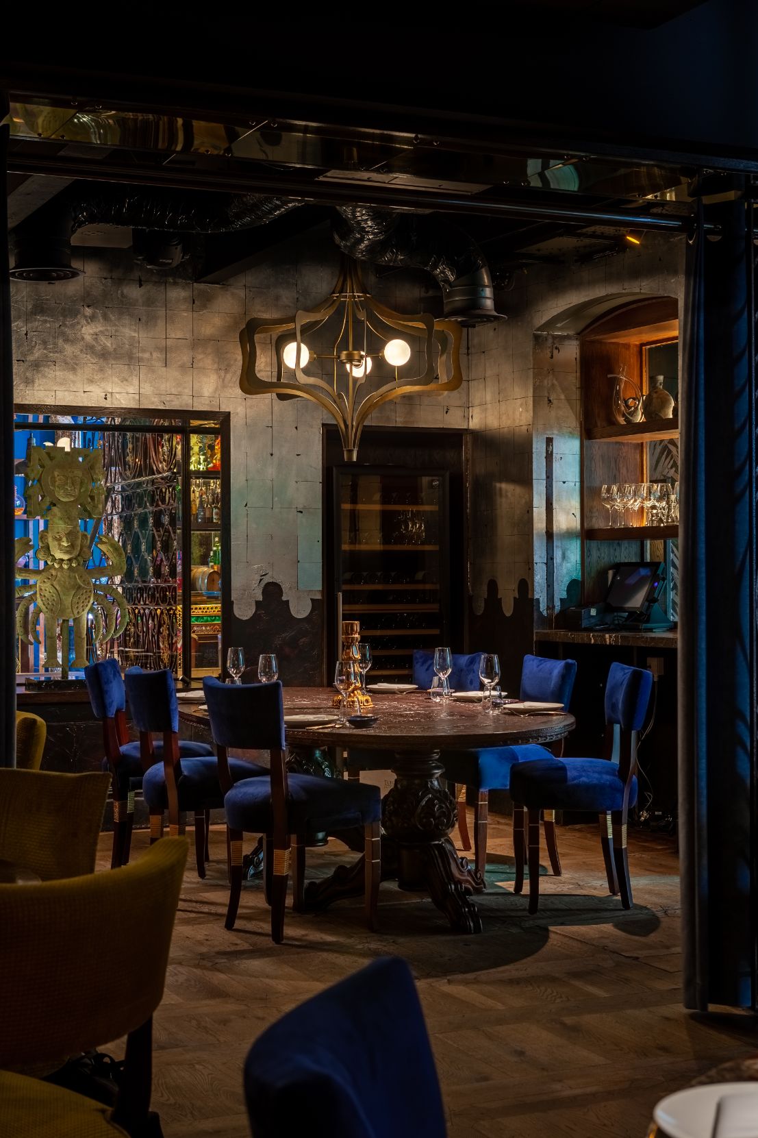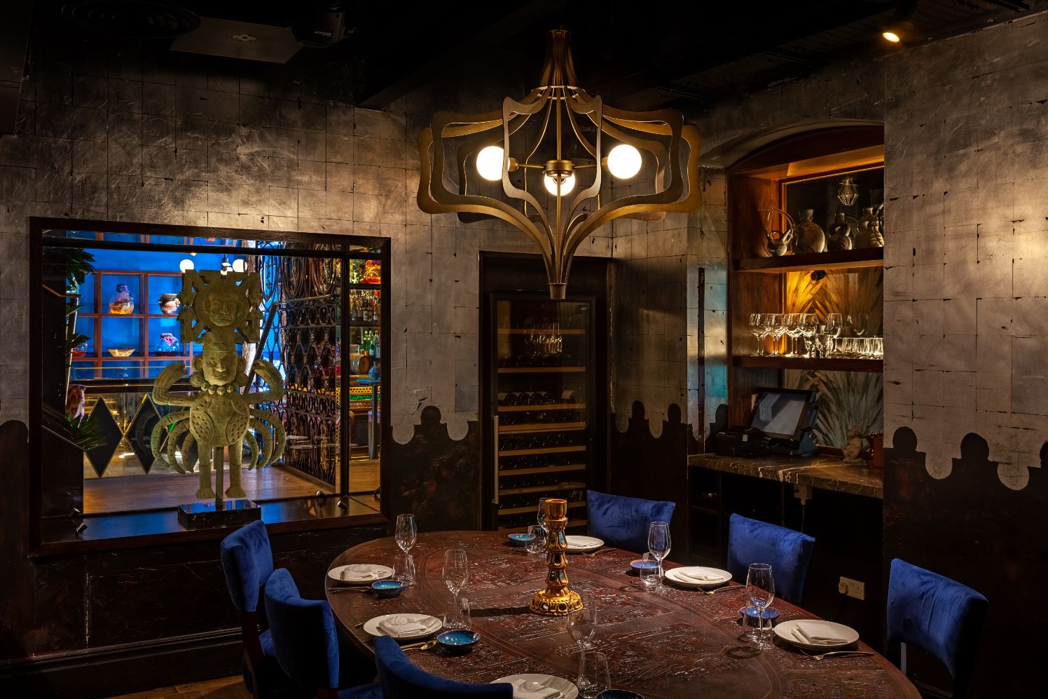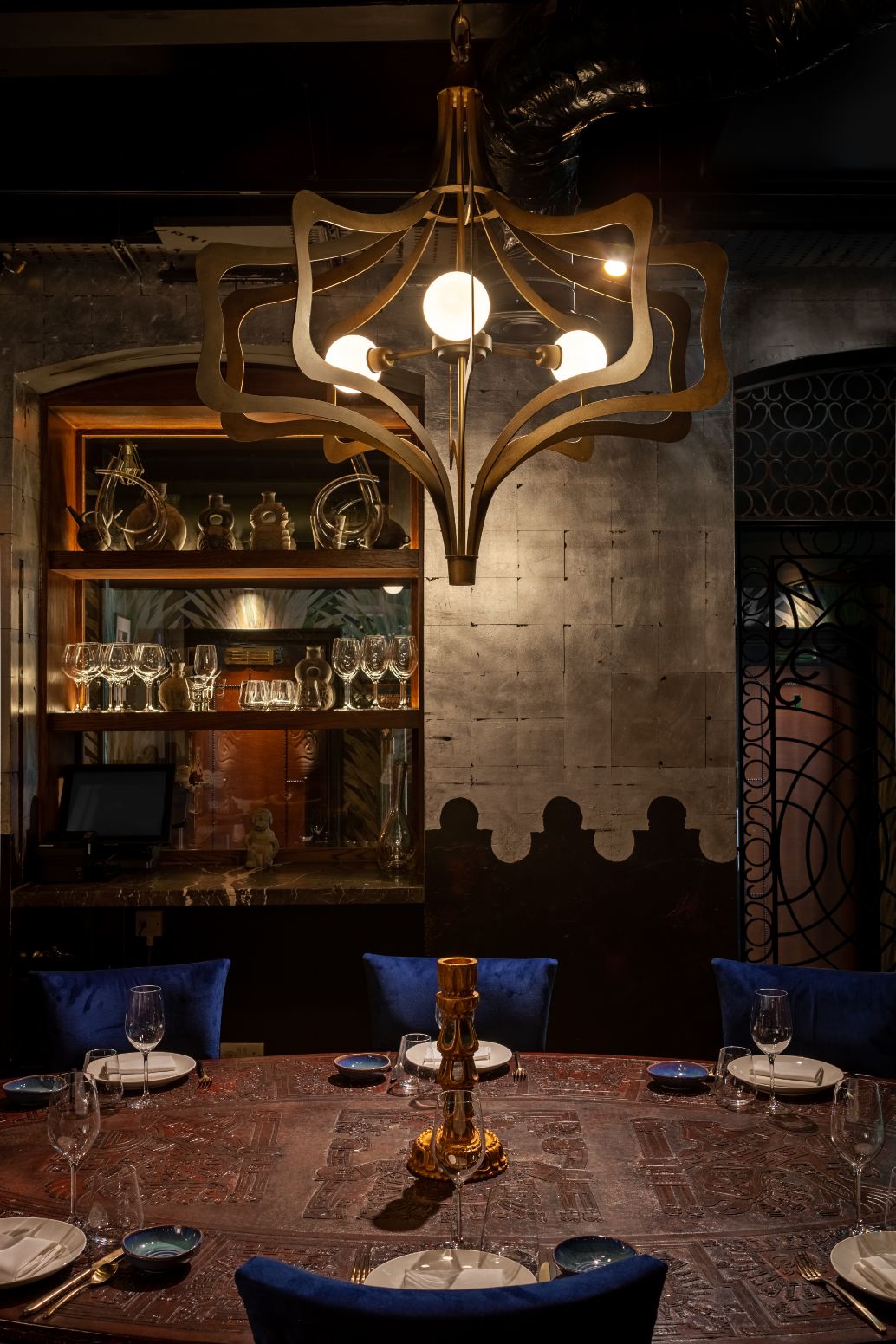 Elsewhere, our iconic Aurelia pendants appear as a focal mainstay to marry with the rustic textures of the restaurant. The Aurelia pendants and wall lights have become a signature feature of COYA restaurants, striking in their finish and location. Utilised over private dining areas the rich gold distressed patina of the Aurelia complements the lush jewel colours and striking furniture used within the scheme.
