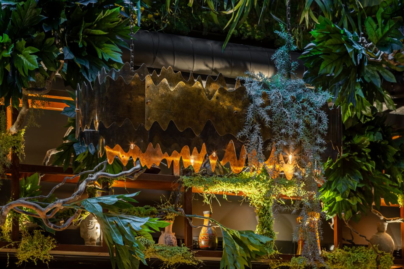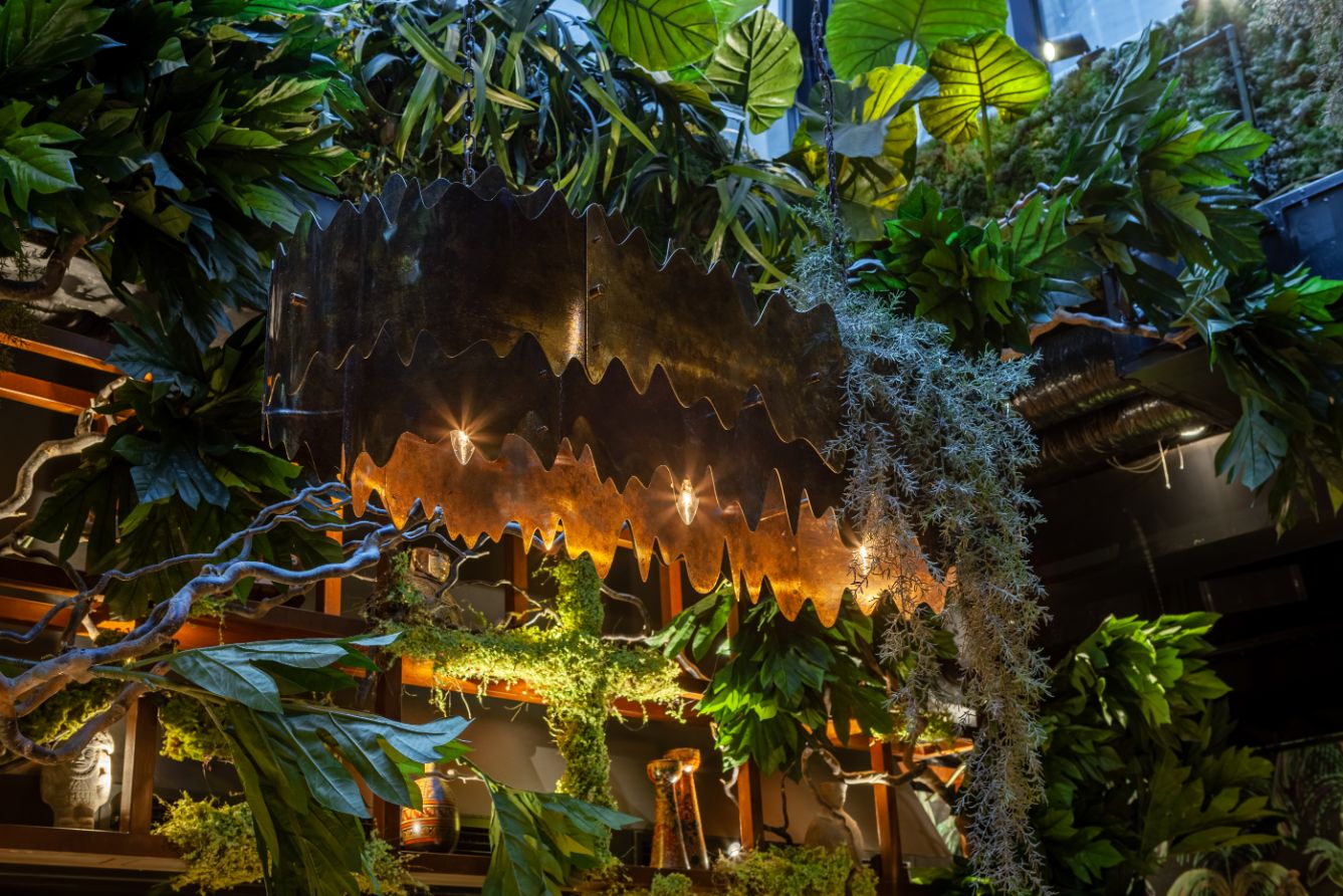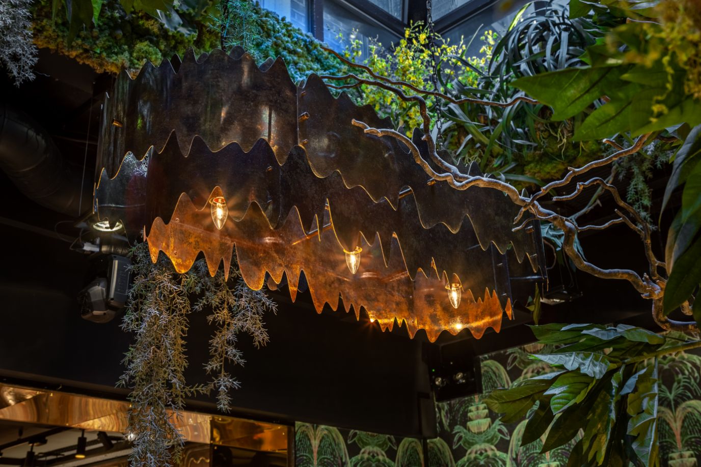 Northern Lights realised the unique brief set out by Sagrada by creating design concepts that would utilise every area of production within our Derbyshire facility. The Mayfair branch of COYA comprises of many Peruvian elements, including lush greenery that evokes the aesthetic of a rainforest. Bespoke multi-level laser-cut tarnished brass pendants lie amongst the newly introduced foliage. The intricately designed statement fixtures benefit from a reflective interior that emits a warming light source from its three light sources. Suspended by chains, the opulent chandeliers provide a stunning focal point amongst a delicately applied composition of intelligent and sympathetic interior design. This organic wave pendant has been used in various designs in several of the COYA schemes as the form with its waves, and undulating lines work well with the rich interiors and draping foliage.