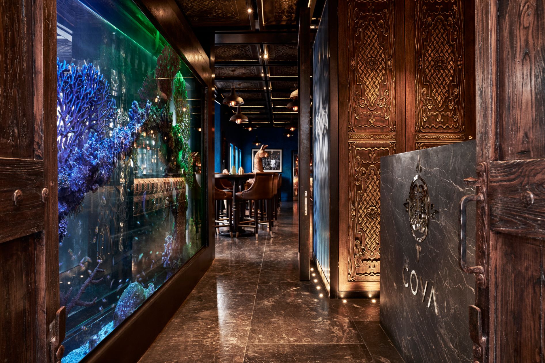 Northern Lights were once again enticed by the opportunity to work with Sagrada on realising their brief for this stunning location. Our Aurelia chandeliers were again utilised in many of the dining spaces and areas. The flowing lines of Aurelia complement perfectly the elegant hard-carved furniture with attendant royal blue velvet accents. This warm ambient light is further enhanced by the tinted smoke glass balls, adding a subtle feeling of romance to the beautifully presented dishes and drinks. To make this bespoke lighting genuinely unique, an antique finish was developed by our creative team specifically to suit the interior scheme.