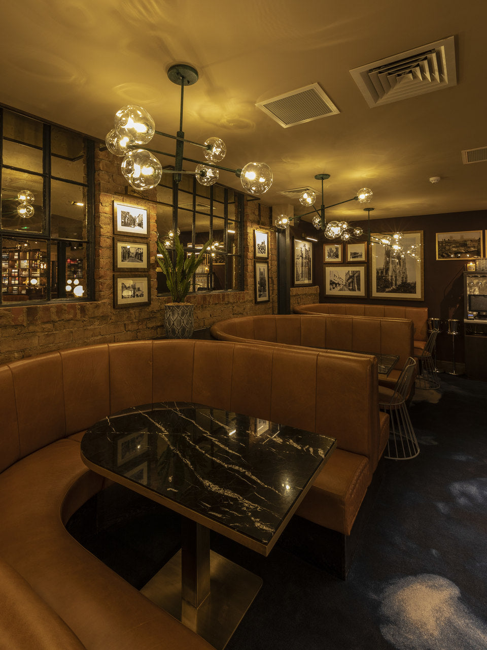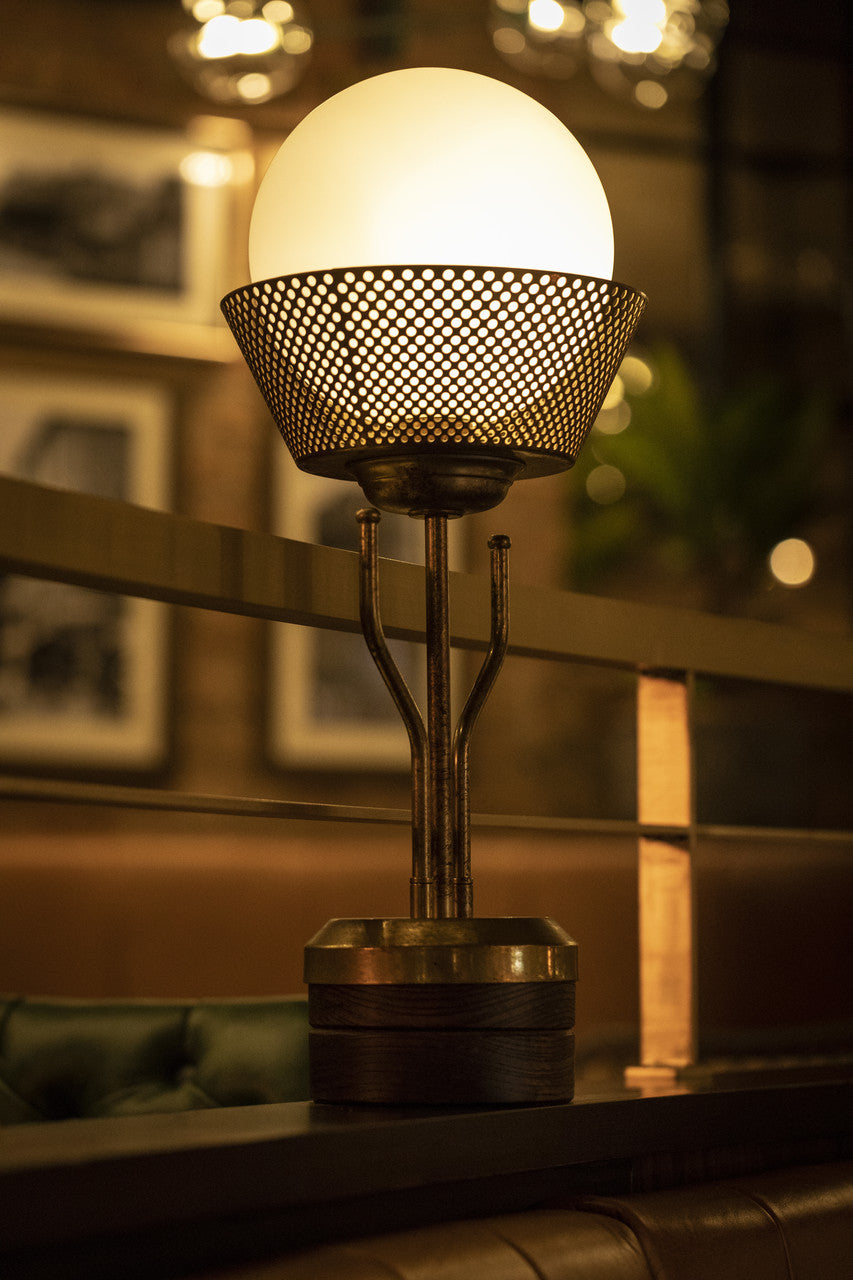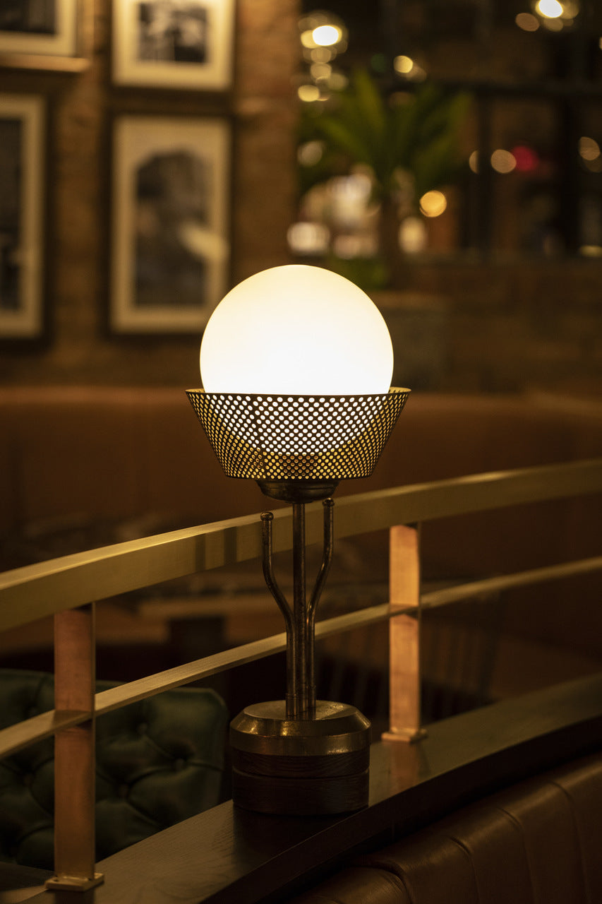 The bespoke lights that are fitted into walnut and panelled screens to separate various dining areas are Art Deco-inspired and also finished in patinated gold. Opal Matt glass sphere shades are framed by laser-cut perforated cones which soften the light.
