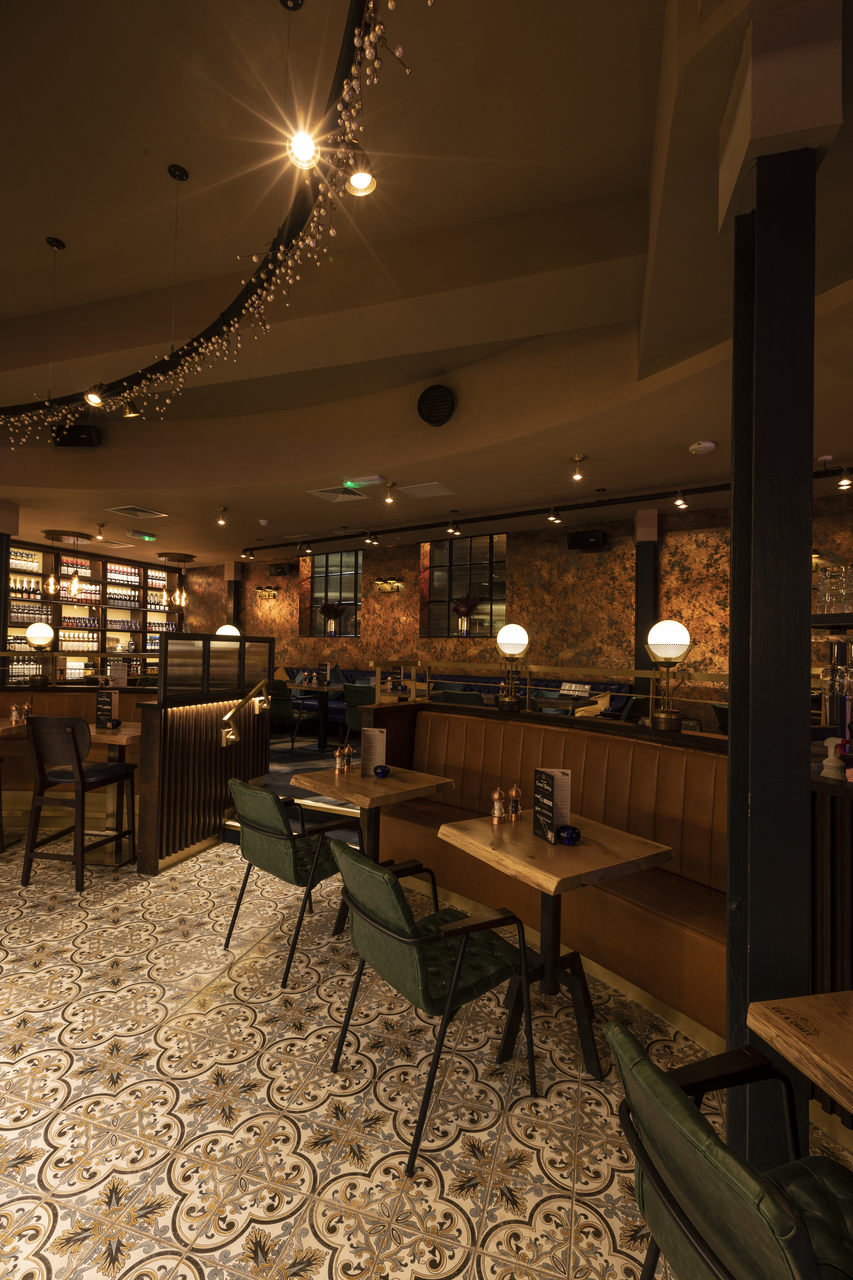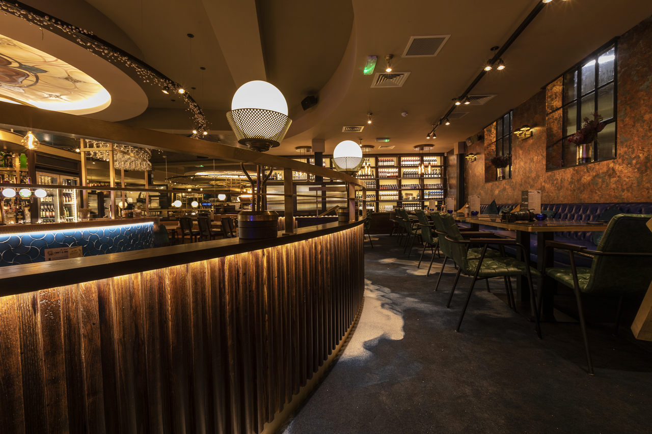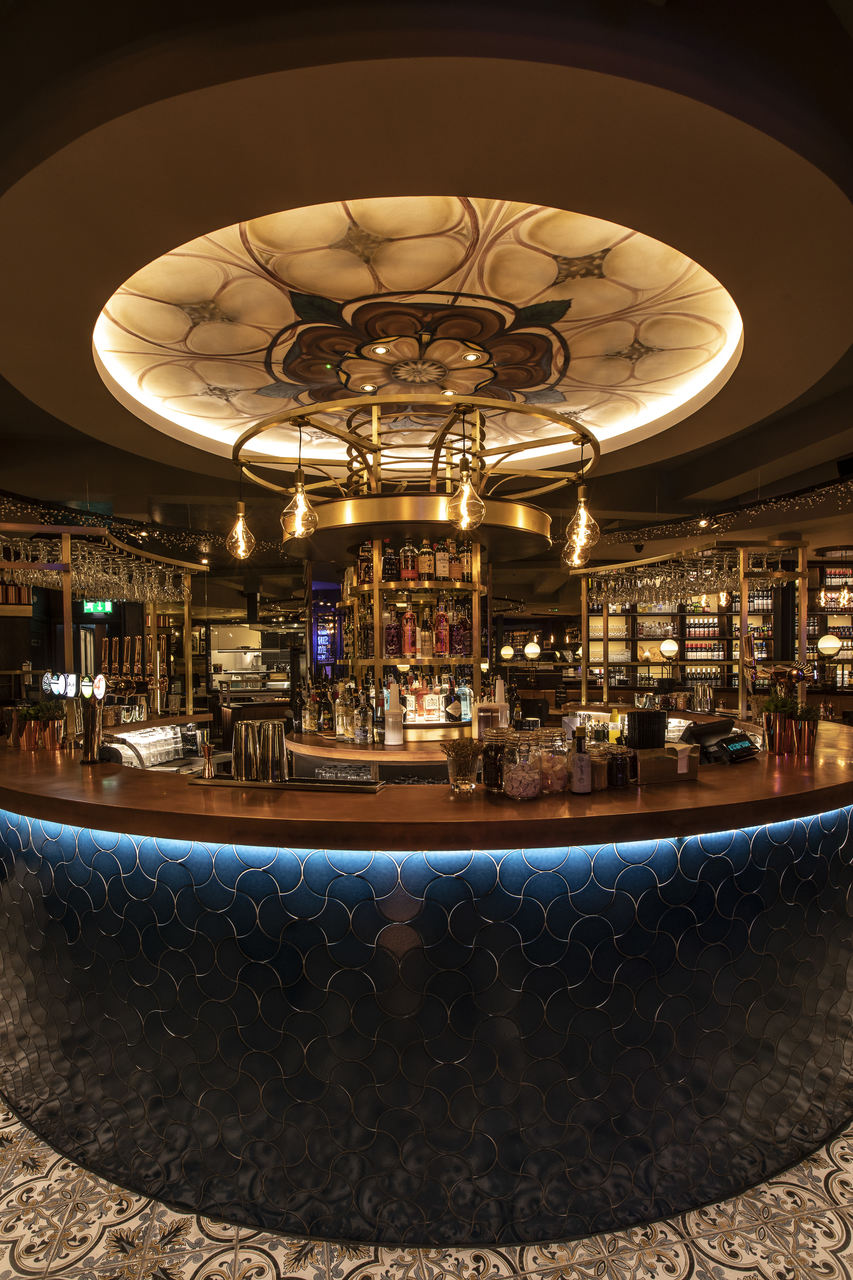 The bespoke lights that are fitted into walnut and panelled screens to separate various dining areas are Art Deco-inspired and also finished in patinated gold. Opal Matt glass sphere shades are framed by laser-cut perforated cones which soften the light.