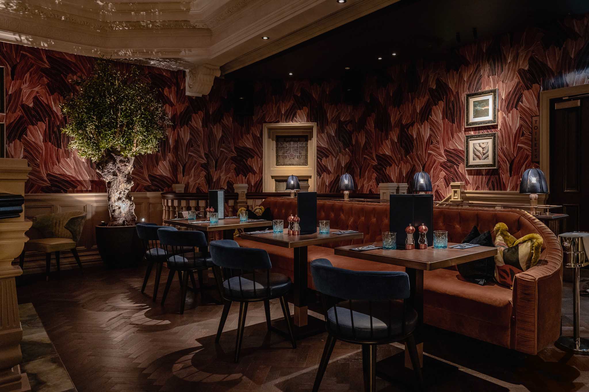 Jewelled tones are seen throughout to create style and substance to the steakhouse offering. Veneered timbers are paired with illuminated natural stones for a sense of masculinity, whilst delicate glazing and curvaceous booth seating create a feminine balance.