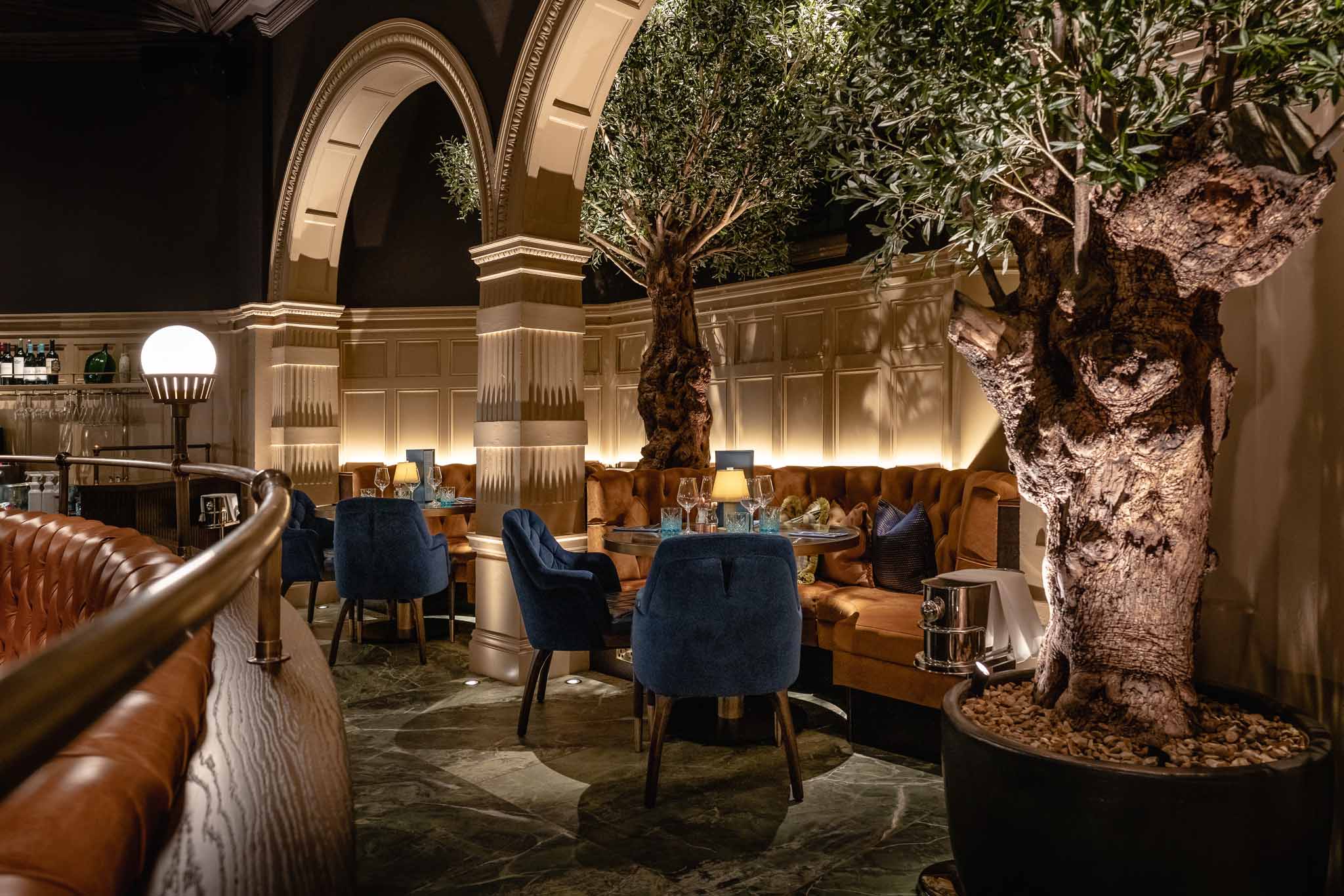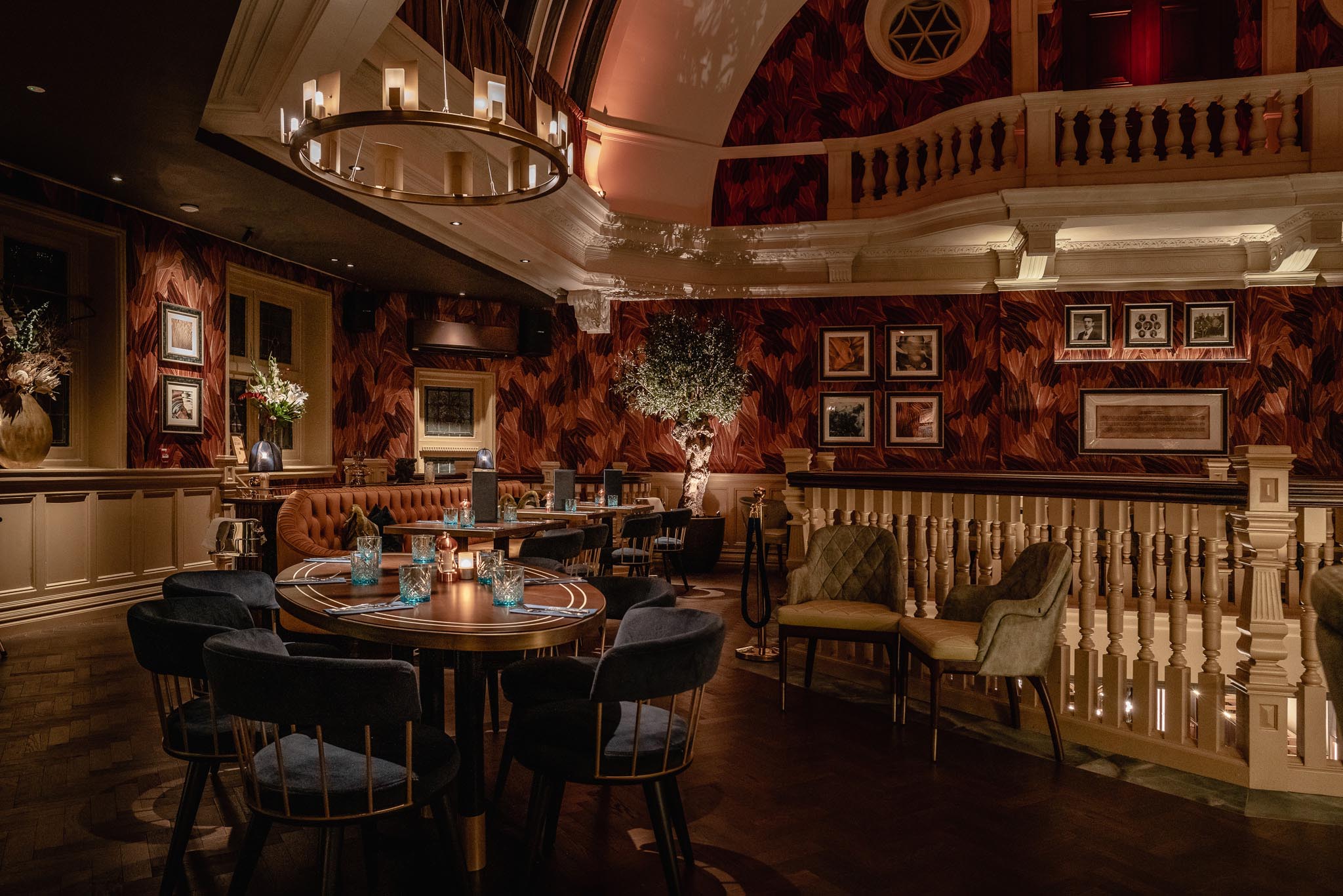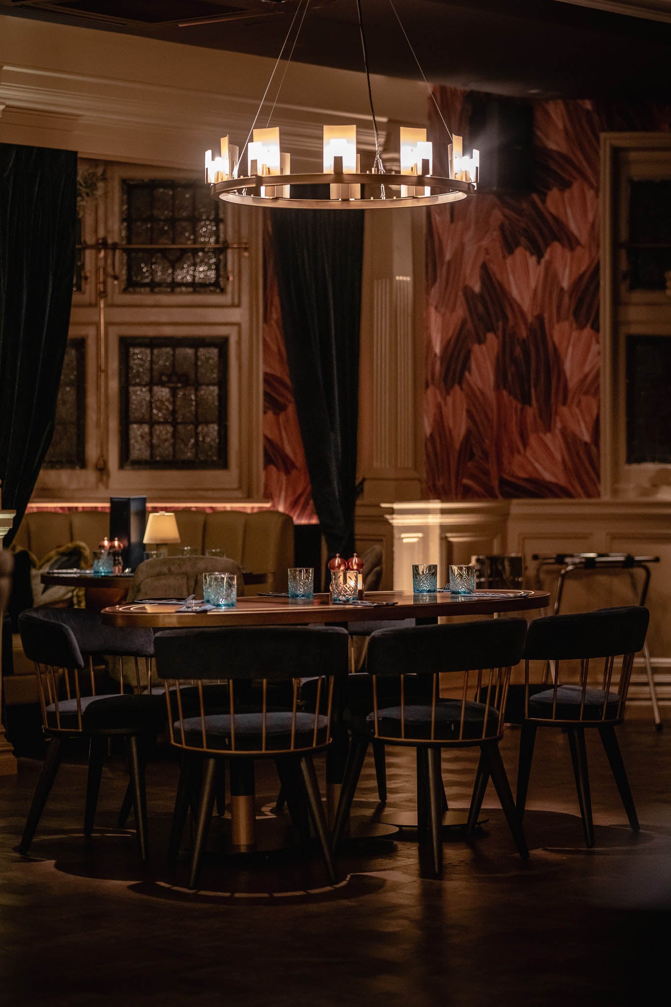 The multi-arm bespoke chandeliers are the showstoppers of the custom lighting specified on the scheme by Mistry Lighting and Studio Two. Finished in satin brass to complement the accents of the warm and rich palette shown throughout, the fixtures are completed with opulent matt opal globes that diffuse the light perfectly. The hand-finished chandeliers are applied to the wooden beams in the centre of the dining hall.