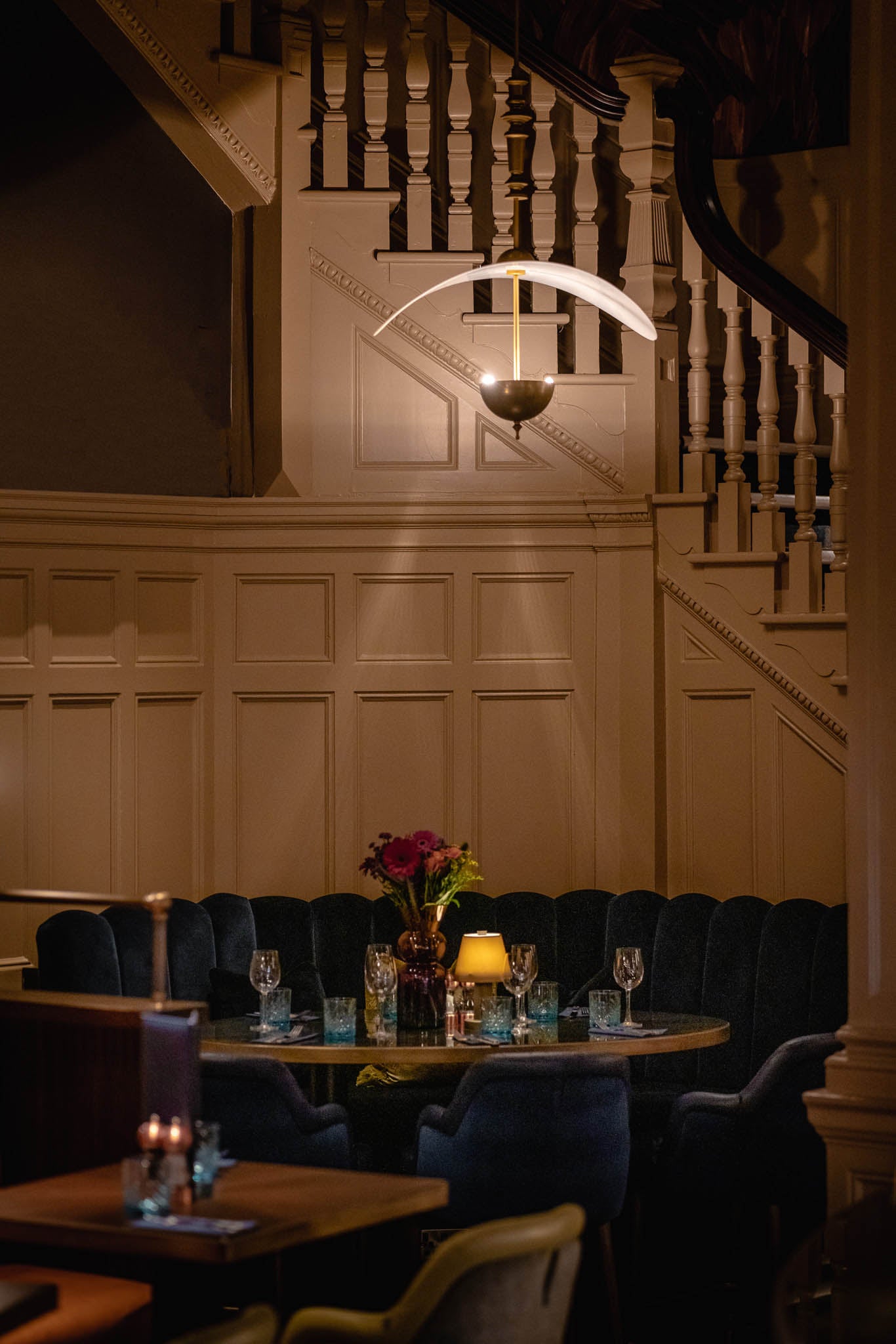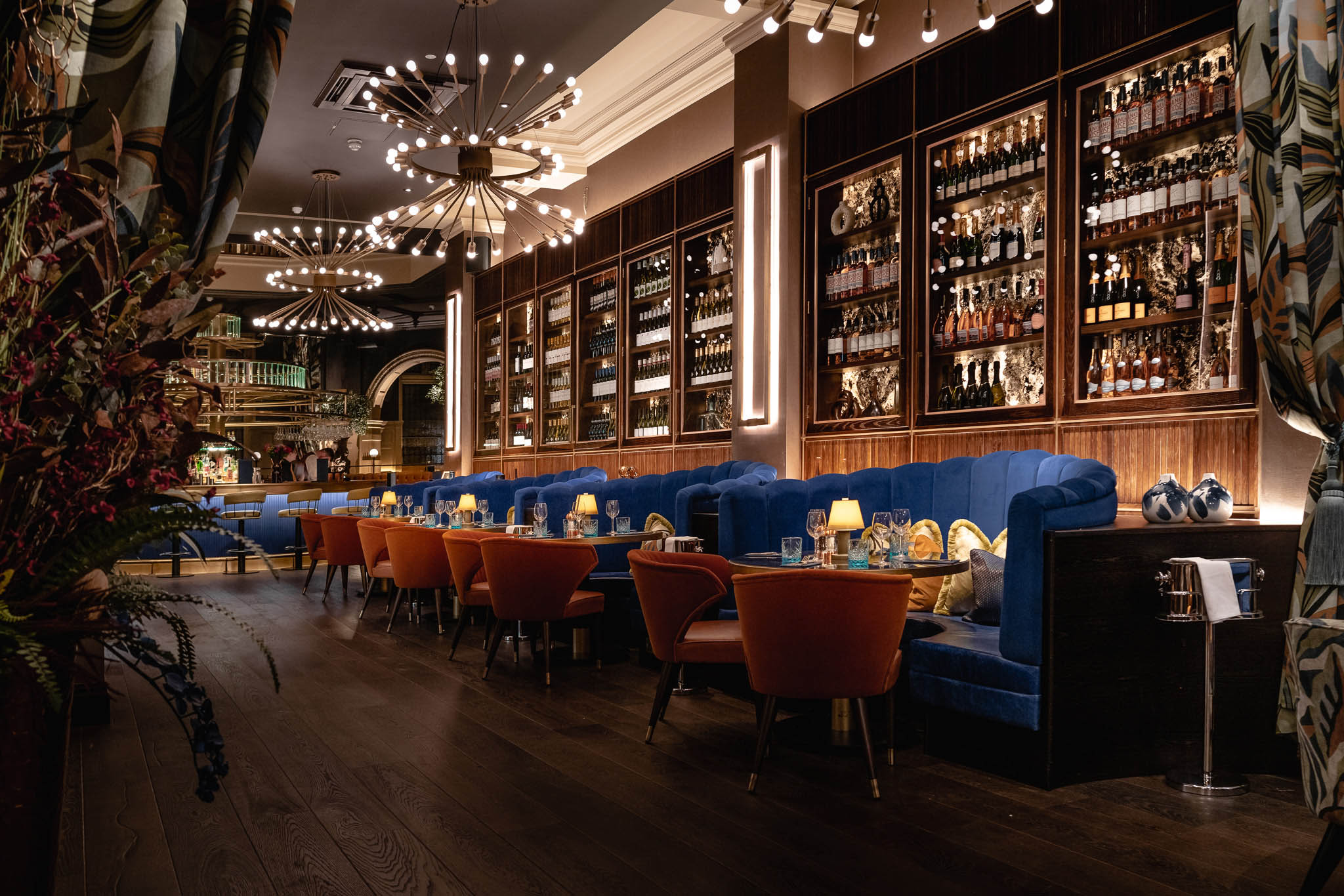 Situated closely to the beautifully restored staircase, our satin brass rod pendants illuminate cosy seating booths. The hand-applied shades are crafted using moulded acrylic that mimics the form of waves, taking on a natural appearance with a nod to the oceanic theme running throughout the venue.