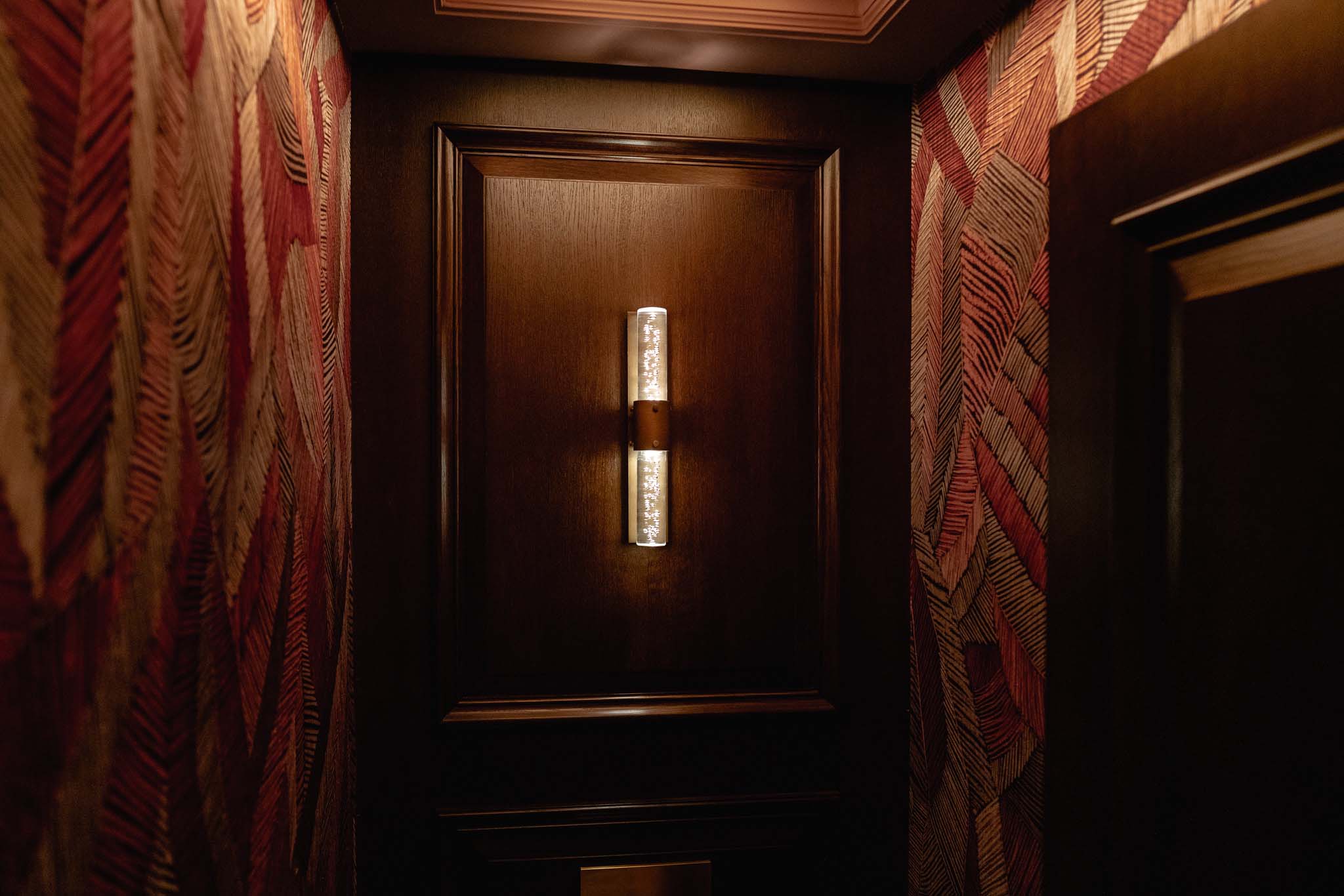 In the bathroom corridors, our contemporary wall sconces take on the form of mid-century candle holders but benefit greatly from hand-applied antique brass finishing. The candle holder-style application is fitted to an accompanying antique brass wall plate. The fixtures are complemented by bidirectional antique brass wall sconces that use a 'crackle' effect throughout the glass.