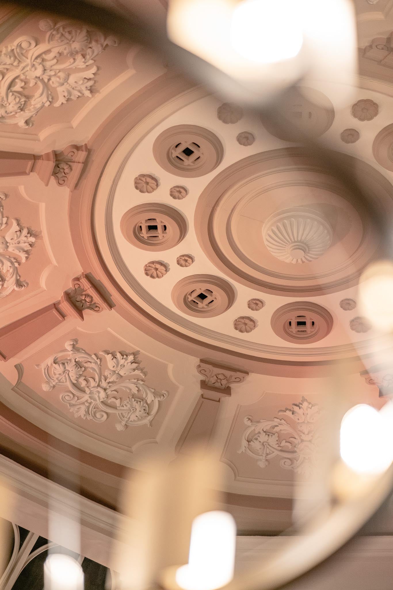 On the ground floor, each of the venue's astonishing original columns has been fitted with our large bespoke satin brass wall lights. At over two metres in length, each of these ambitious wall lights was crafted by hand in our Derbyshire premises, using the enormous facilities our artisans have at their disposal.