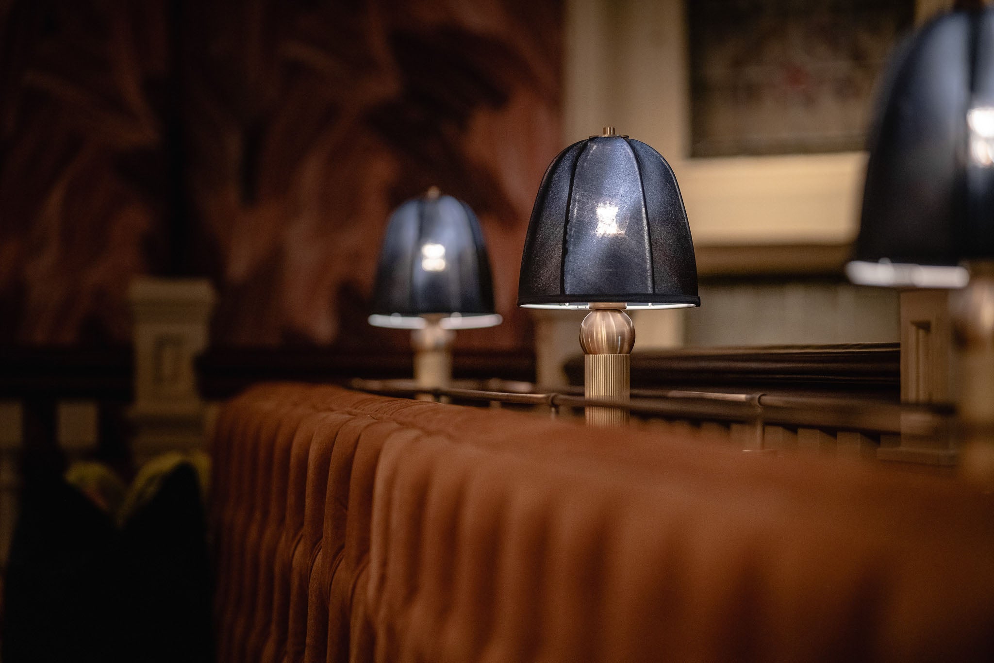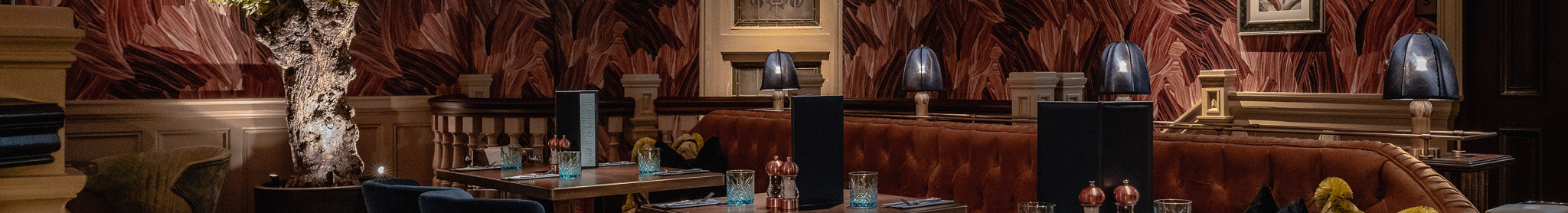 In the drinking lounge, the autumnal hues of the tan-leather booth seating are accentuated using a series of our decorative satin brass fixed table lamps. The bespoke fixtures are wired into a curved screen, delicately perforated using our state-of-the-art laser-cutting machine. The perforations softly diffuse the warming matt opal glass globes.