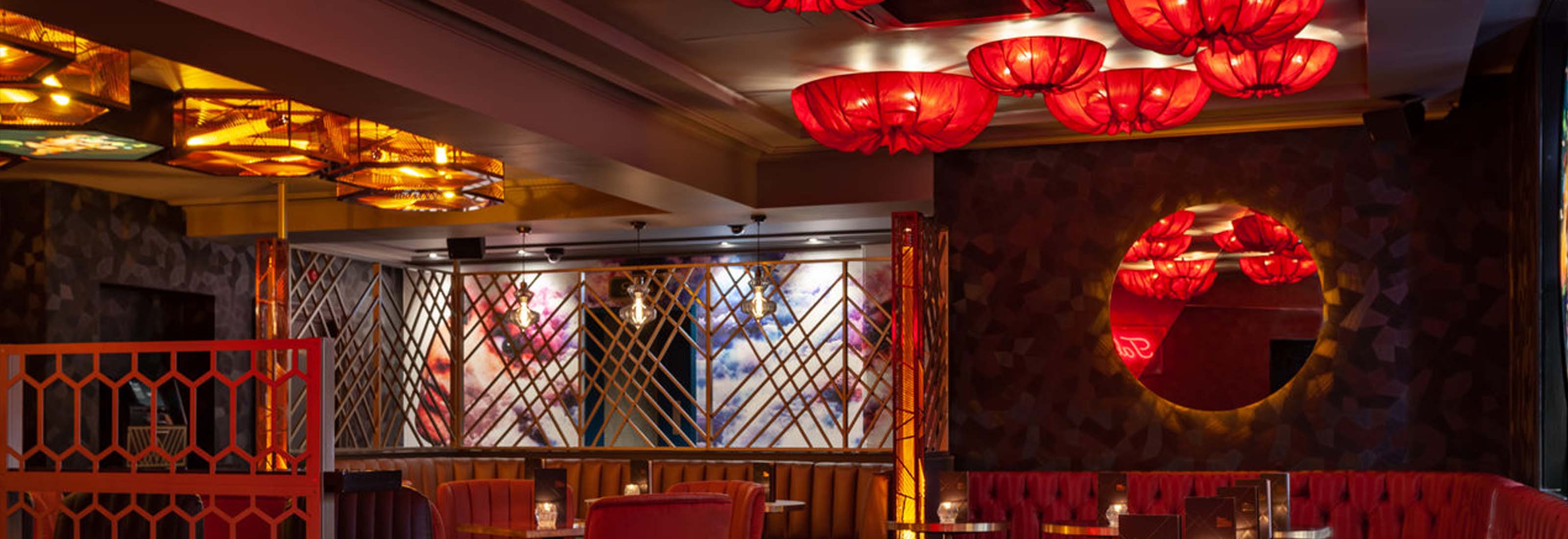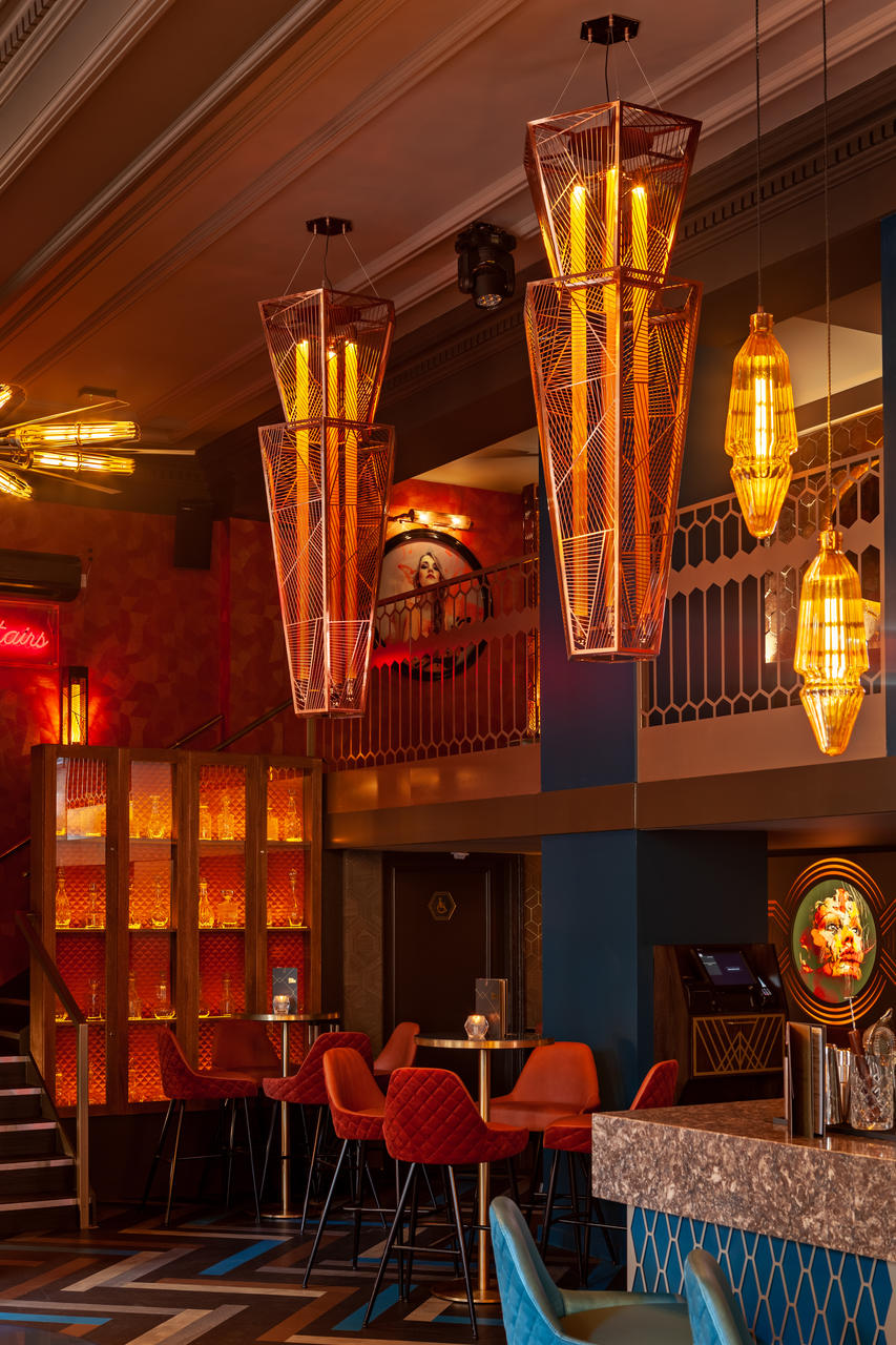 The now-iconic laser-cut fretwork is given a new spin alongside tall, blown glass pendants that cast an inviting golden light. In quieter corners of the bar, the hard lines and exposed lamps give way to the softer more subdued mood from scarlet pleated pendants.