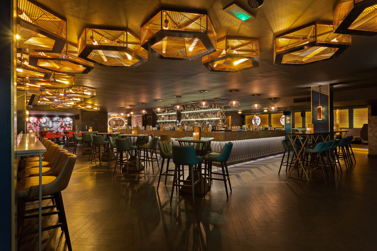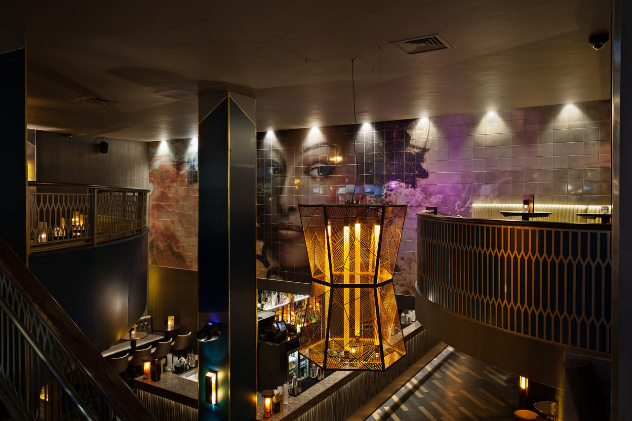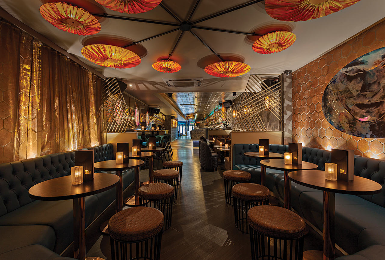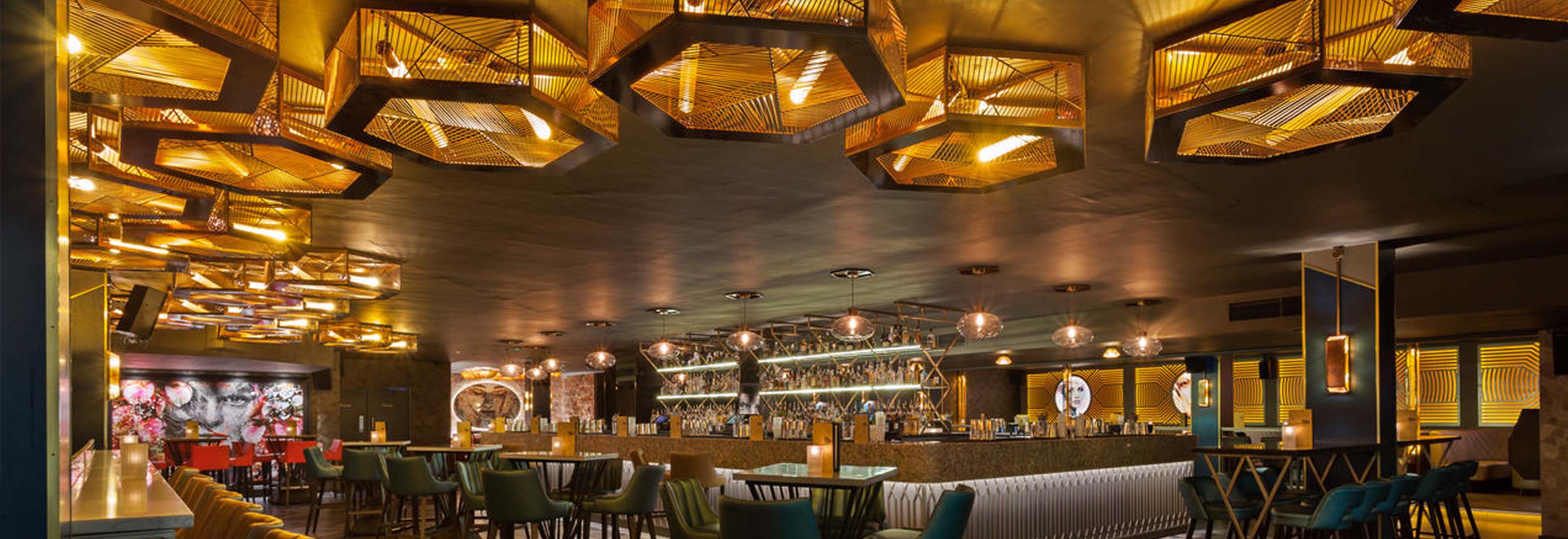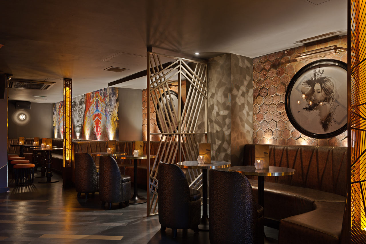 The flush mount bespoke chandeliers feature the iconic fretwork design, synonymous with the brand, and when applied on this scale, create a unique light show of shadows on the ceiling. The amber light is also used in various formats to help create the warm ambience ‘Dirty Martini’ prides itself on. The warmth is also reflected on the eight pleated fabric bespoke pendants, the delicate material and beautiful, vibrant colour, further enhancing the opulent and luxurious setting.