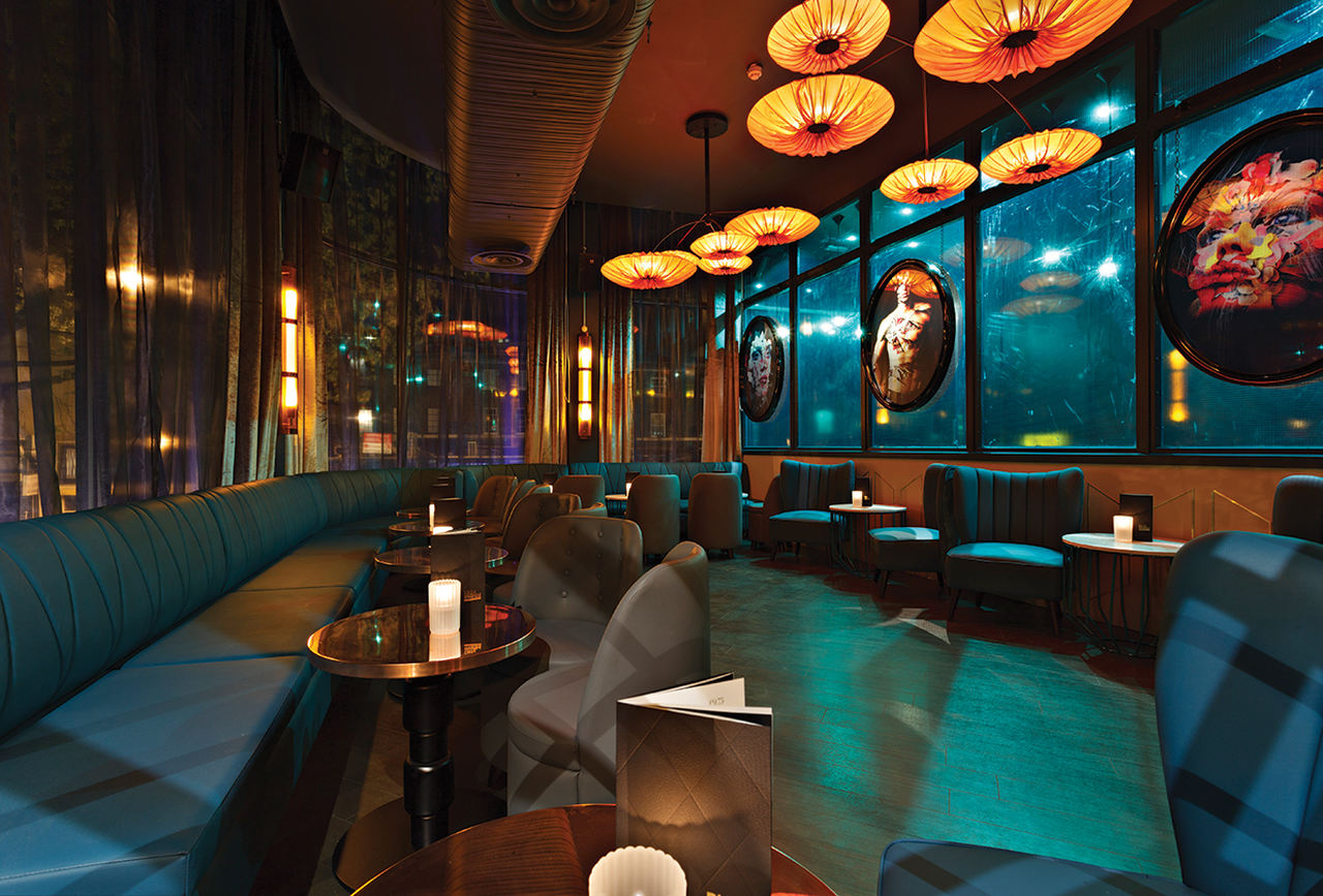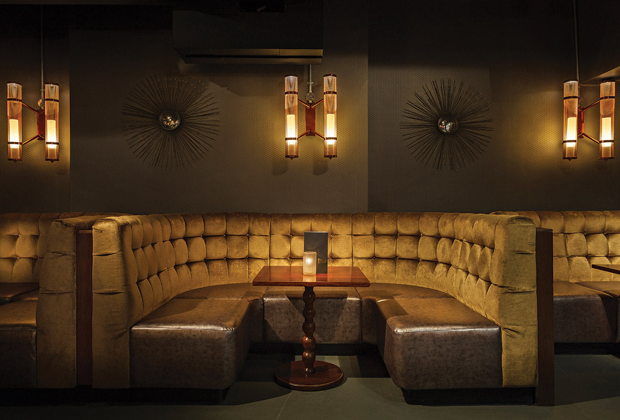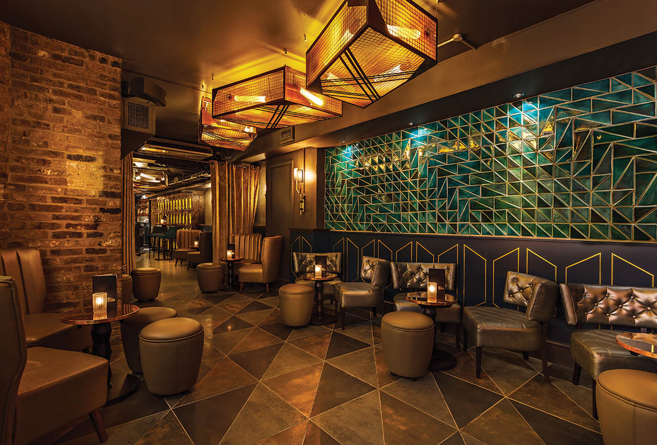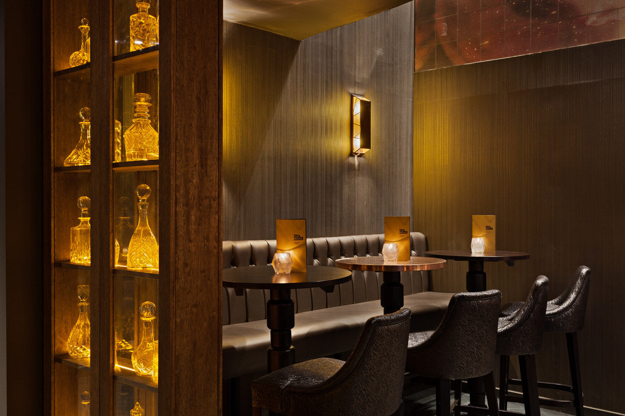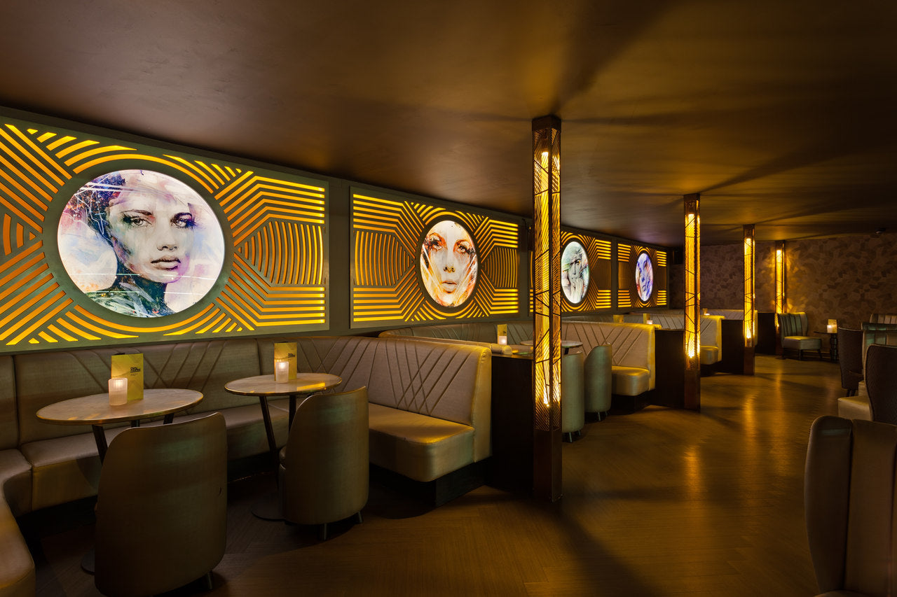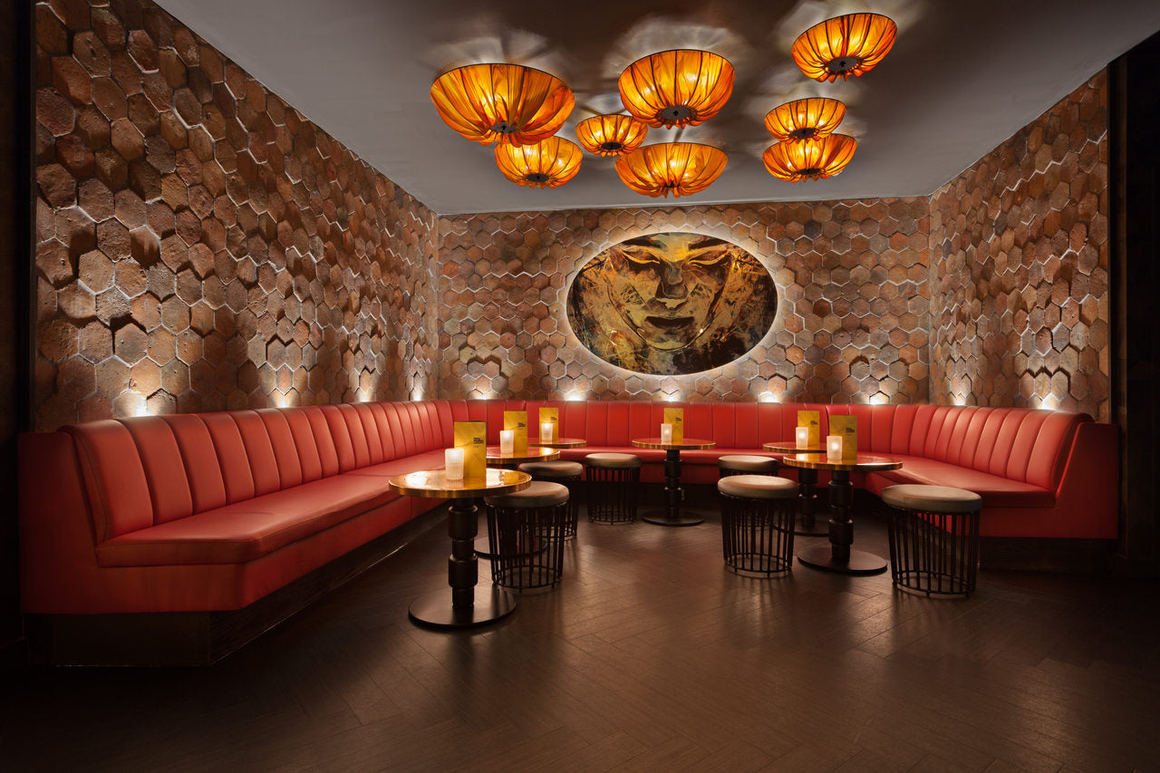 The flush mount bespoke chandeliers feature the iconic fretwork design, synonymous with the brand, and when applied on this scale, create a unique light show of shadows on the ceiling. The amber light is also used in various formats to help create the warm ambience ‘Dirty Martini’ prides itself on. The warmth is also reflected on the eight pleated fabric bespoke pendants, the delicate material and beautiful, vibrant colour, further enhancing the opulent and luxurious setting.