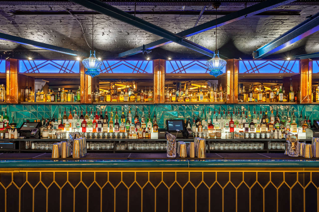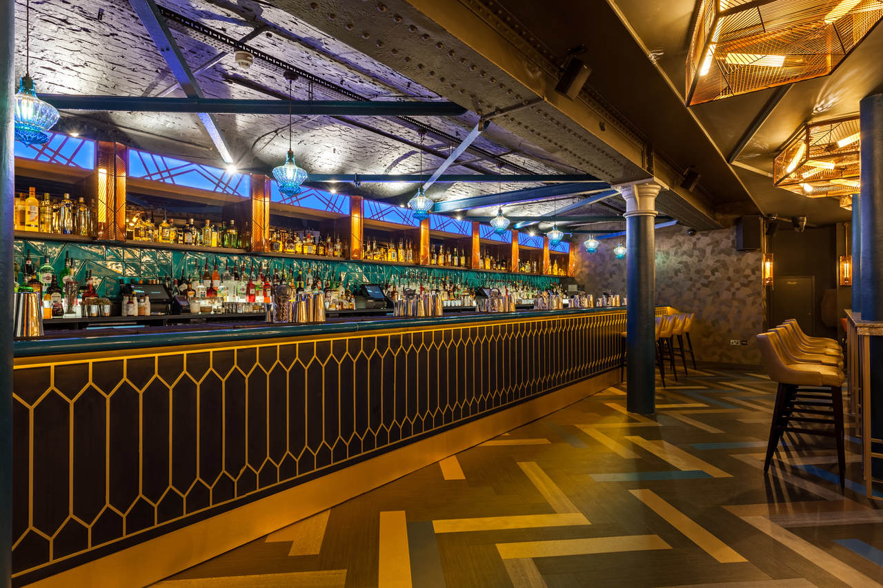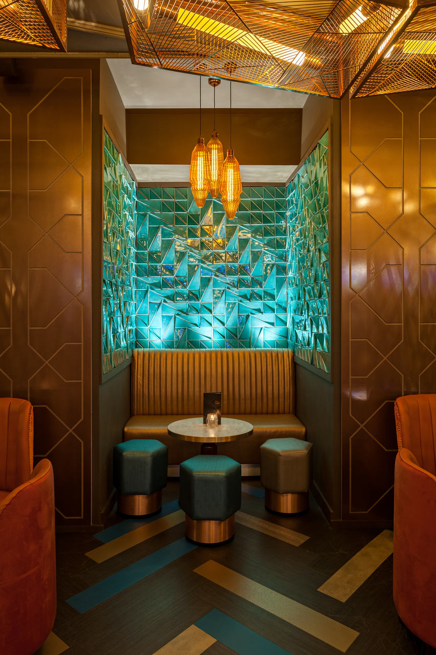 Our Milo glass pendants were chosen for their bright teal colours to help cut through the warmth of the proposed colour scheme. In order to accompany these, our glassmakers created handmade reeded amber glass pendants that make this restaurant and bar lighting genuinely exclusive.