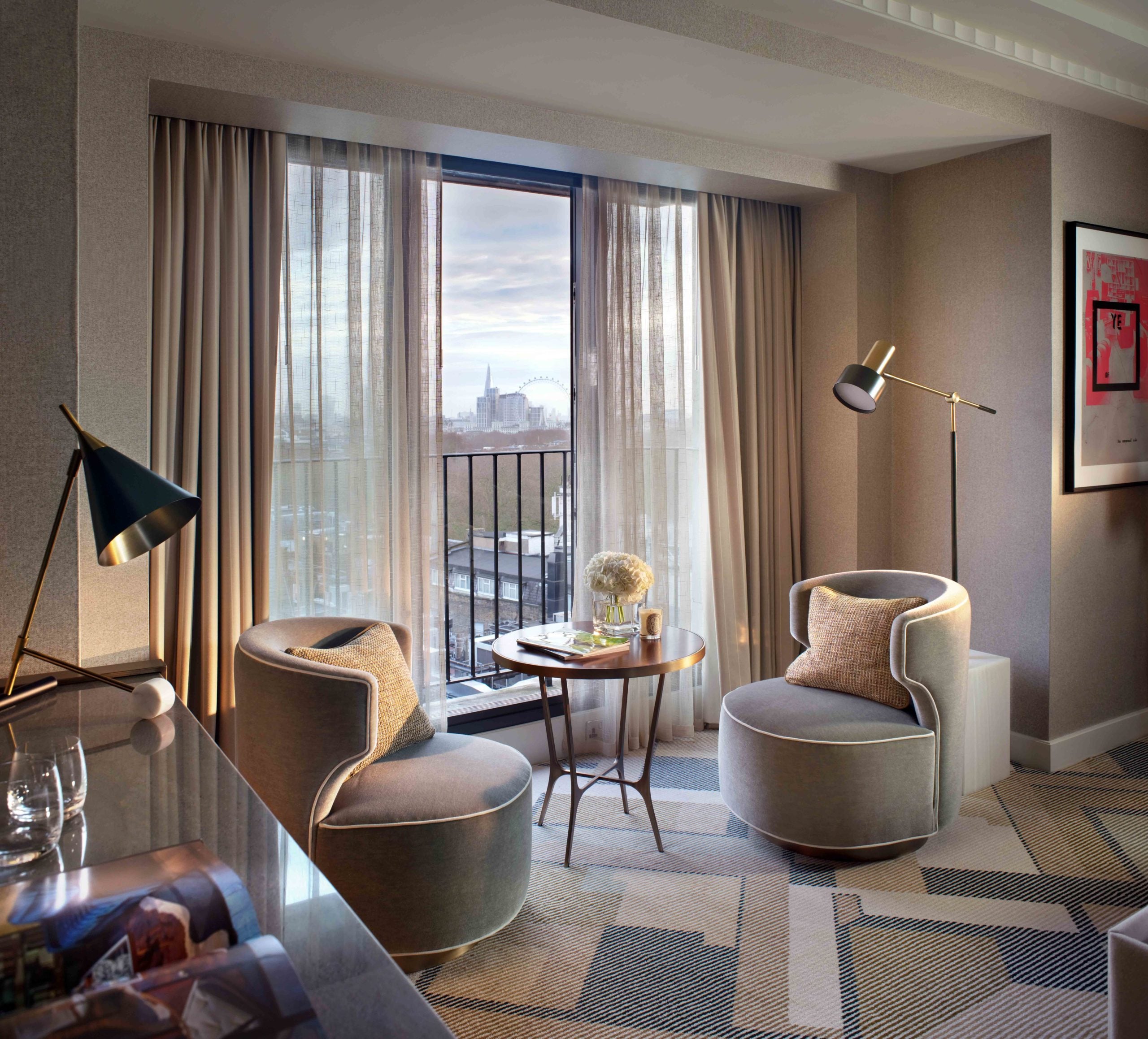 Complementing the scheme, floor lamps bring presence and opulence through a marble-effect base, fabricated in alabaster resin to balance luxury with practical needs and budgets. The metalwork combines medium brass with a powder-coated hunter green finish, introducing a subtle heritage note. The design seamlessly integrates function within form, with the chunky base discreetly housing sockets and USB ports to meet modern hospitality needs while maintaining refined visual harmony.
