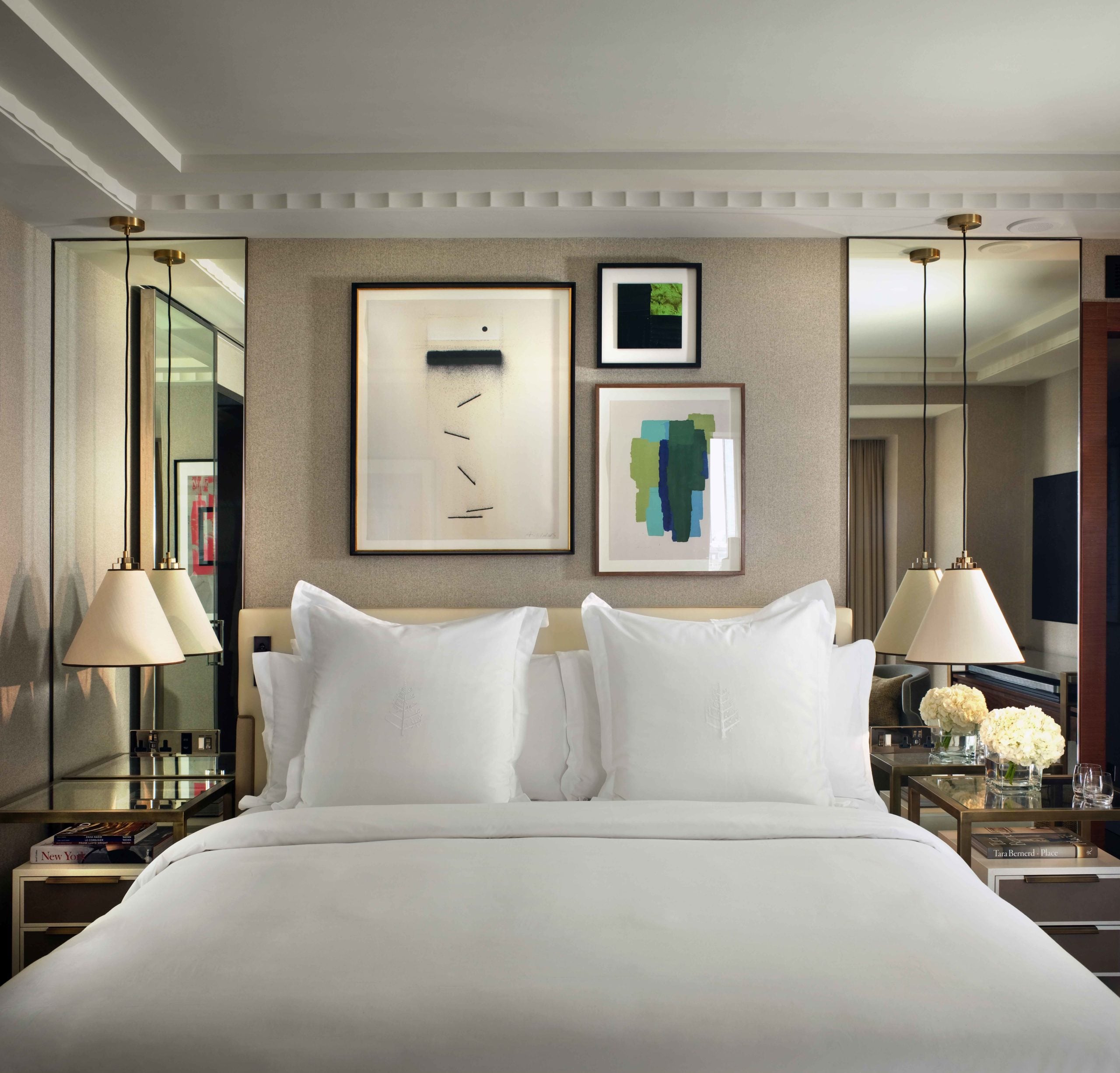 At the bedsides, statement wall lights extend elegantly from a long wall plate, featuring a curved brass suspension rod in antique brass and matte black powder coat. The refined drum shades are formed from clear glass tubes arranged within a spun brass framework, evoking the glamour of fluted crystal. Each is finished with an acrylic base diffuser and fine brass mesh top panel for a soft, ambient glow that embodies the Four Seasons aesthetic.