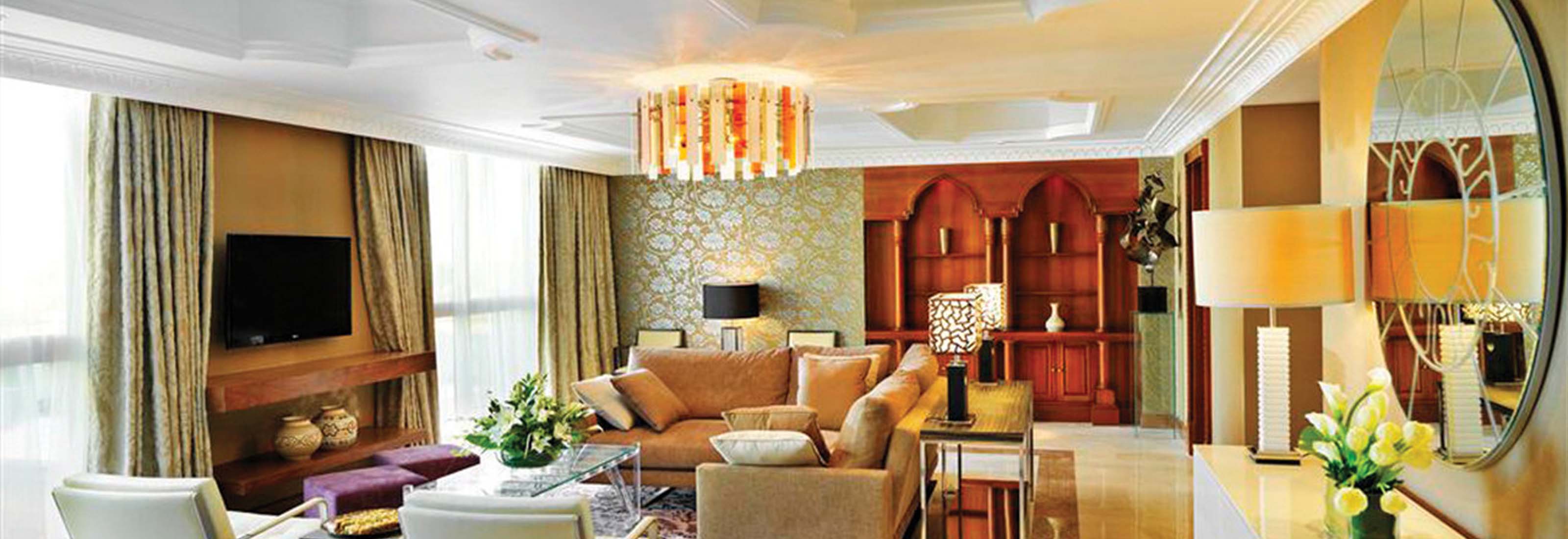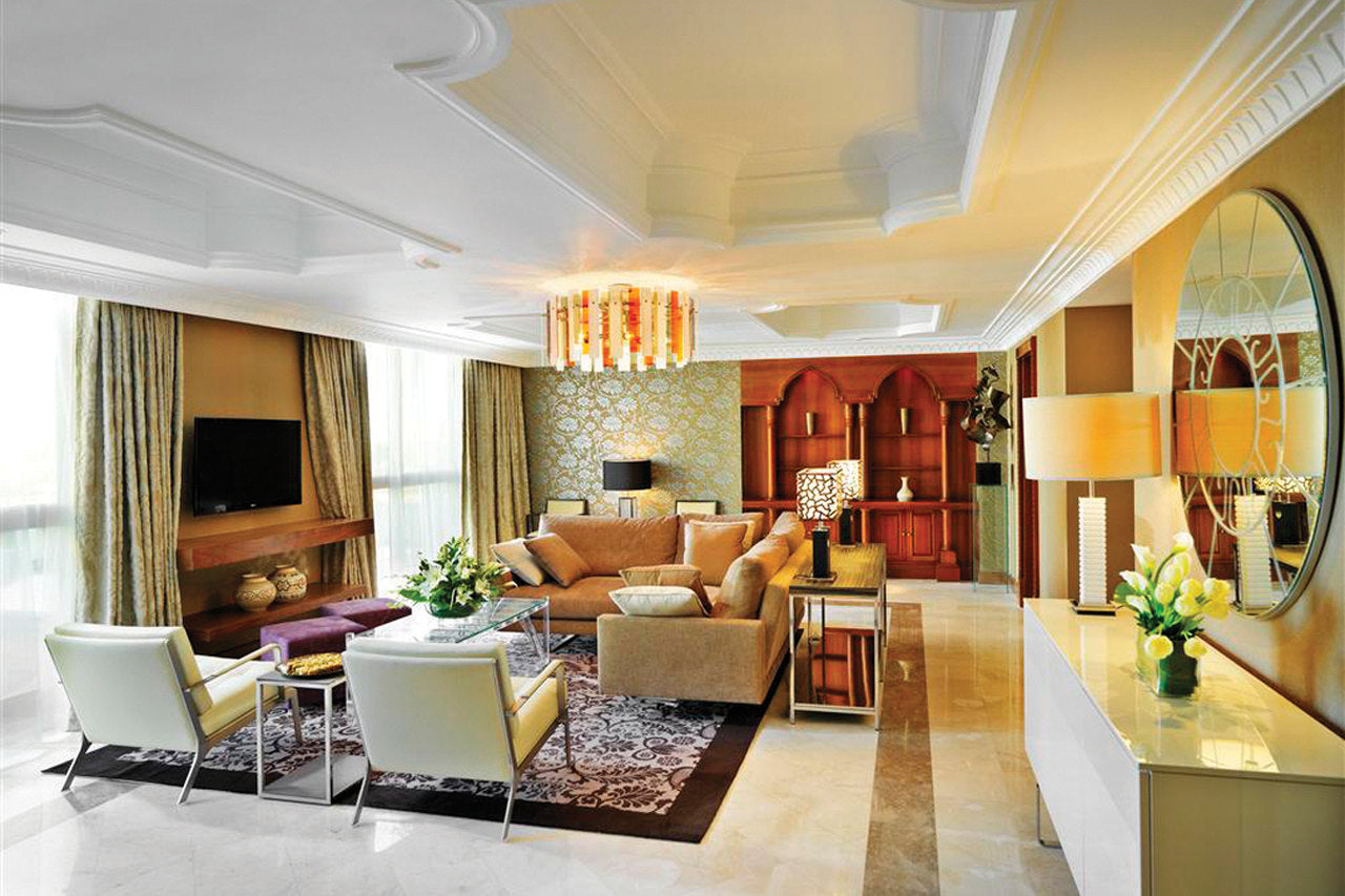 At 382 sq metres, it is the most extensive suite in the hotel and offers spacious living, dining and conference areas. One of the central lighting features is the glass hook chandelier over the dining table. It provides glamour and luxury without being too overpowering. The glass hook chains also help deflect the direct light away from the diners.
