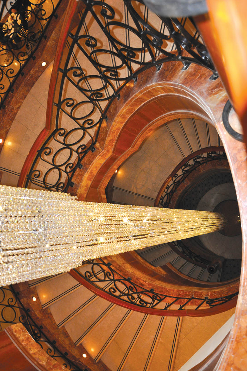 Table and floor lamps have the requisite amount of subtle detailing, encompassing brass and textured glass inlay, hand-blown glass pieces and expertly crafted metalwork. The feature chandelier to the stairwell consists of four segments Northern Lights manufactured and designed for ease of transport and install. Covered in crimson silk and embellished with thousands of cut crystal on linear drops this stunning pendant cascades through the ornate marble stairwell illuminating each floor as the facets of the crystal bounce off the many lights.