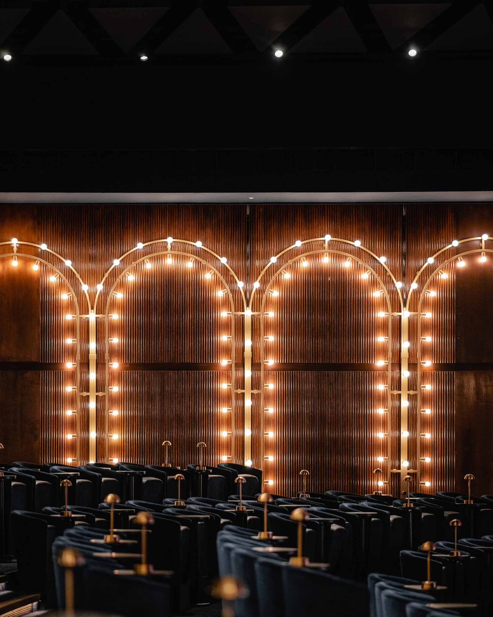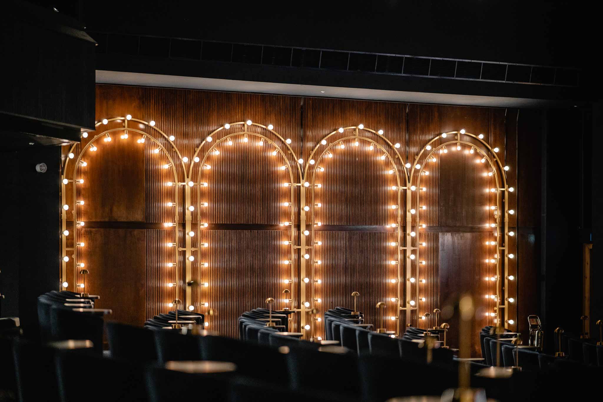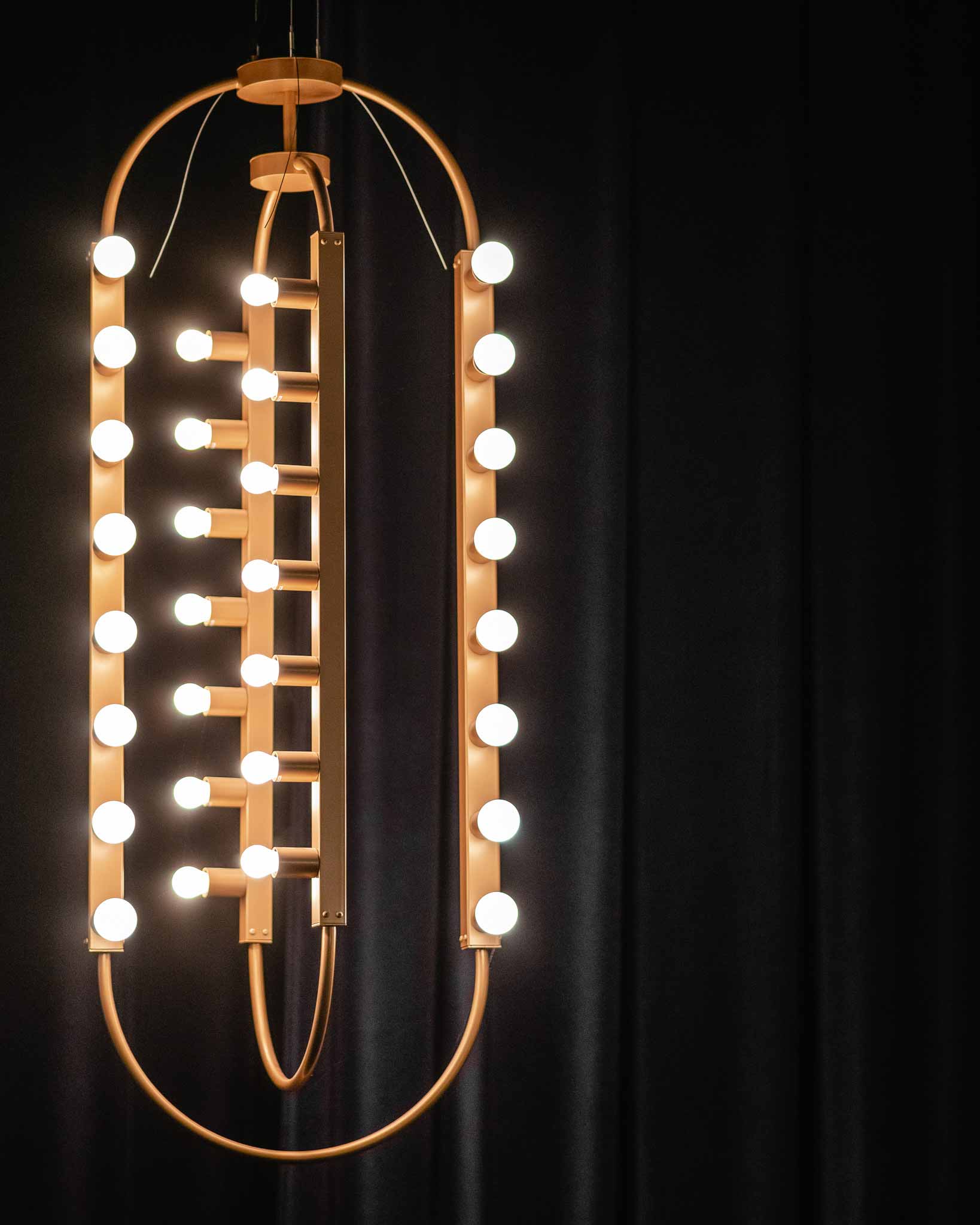 The atmospheric space is brought to life with dazzling arched lights that emit a warm glow throughout the room, whilst the enormous main theatre pendant brings the entire room together. The immersive 4.4 metre-wide fixture comprises over one hundred individual bulbs housed on eighteen arms. Our satin gold oval pendant rounds off the range of bespoke lighting in the theatre. At an impressive 4.4 metres in height, the pendant complements the other fixtures using thirty individual bulbs to bring a sparkle of showbiz to its surroundings.