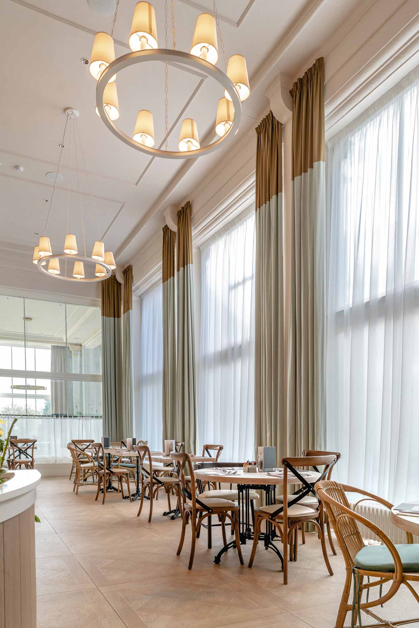 Past the Market Kitchen is The Orangery, a beautifully-considered tearoom for guests to socialise and take in some of the stunning views surrounding the venue. Stunning pastel furniture and elegantly tiled floors are brightened by a series of our feature ring pendants that span the room's length. The gold satin fixtures comprise a handcrafted outer ring that houses an integrated LED strip and a central dish that discreetly hides a single uplight.