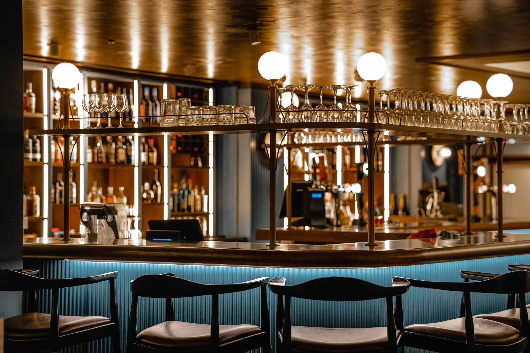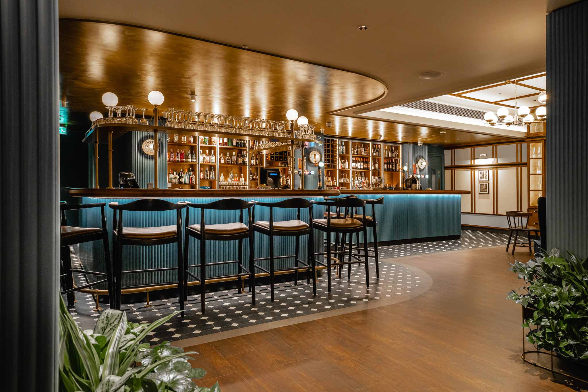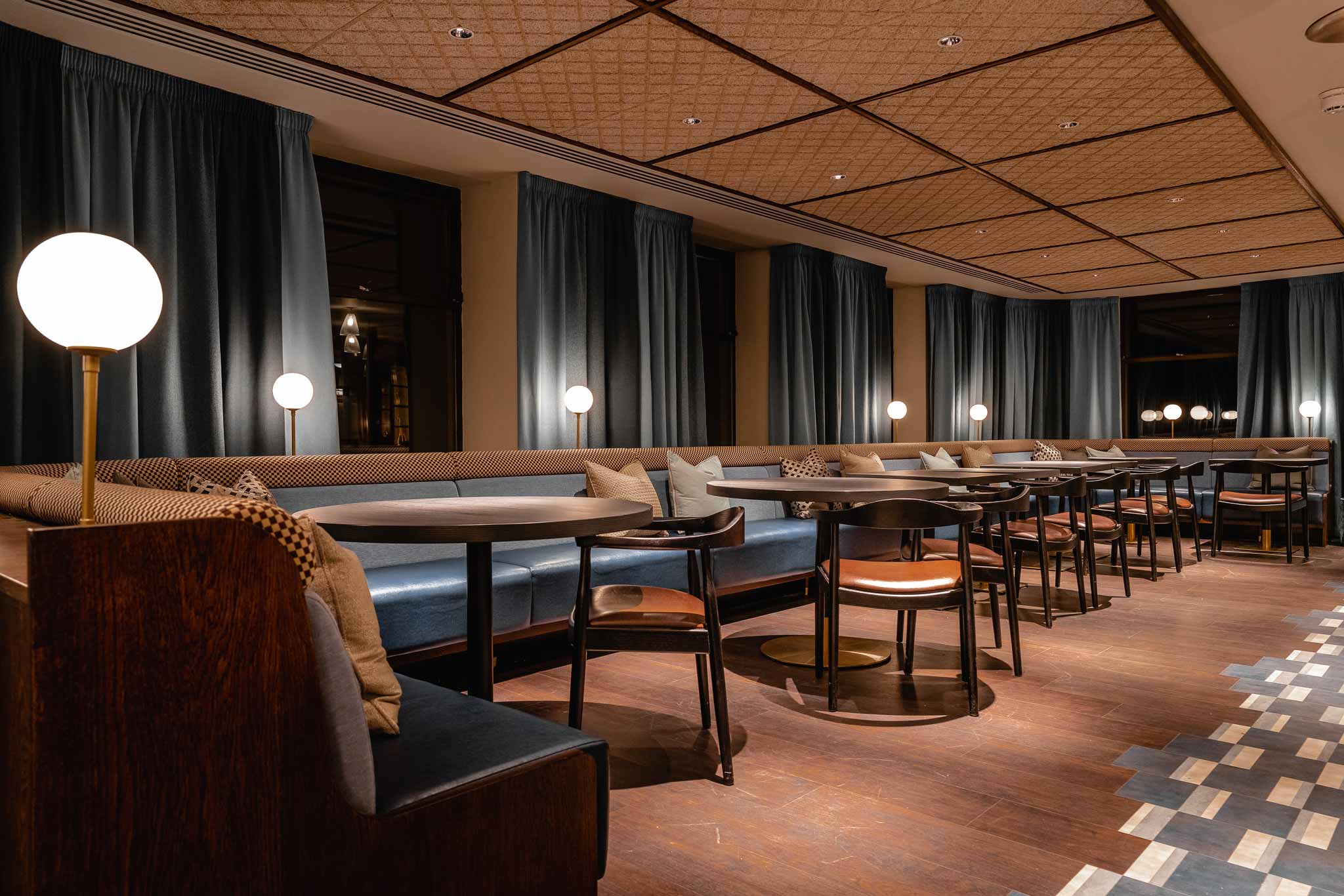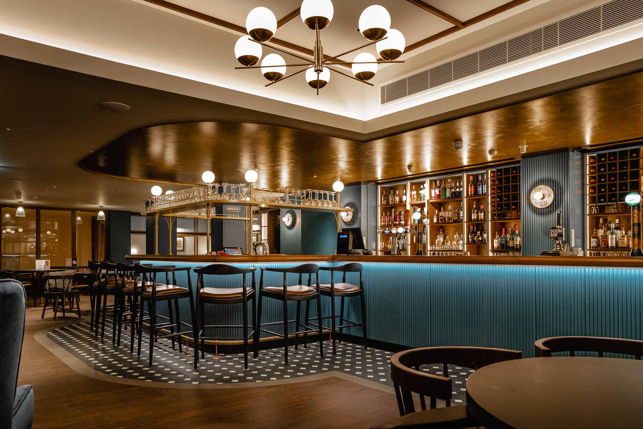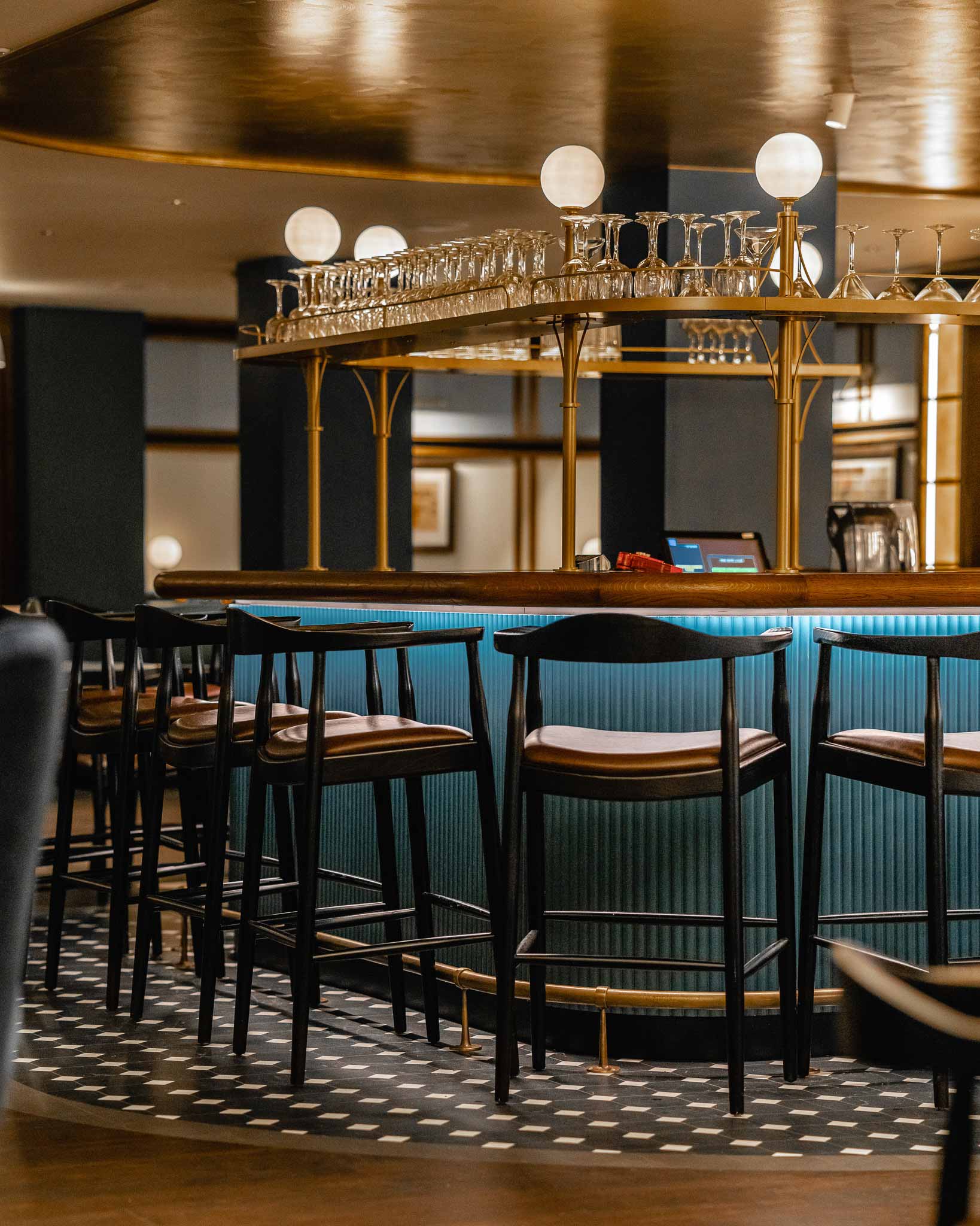 The Brassey Bar, named after the original owner Thomas Brassey, is a contemporary take on a bar with rustic walnut furniture, sumptuous booth seating and complementary tiling. Our immersive gantry bar is the star of the show in this part of the venue. Fixed satin gold & matt opal lamps sit atop an impressive 2.5 metre-wide handcrafted gantry created by our skilled artisans in Derbyshire. The booth seating is delicately illuminated by several matching lamps that complement the gantry bar opposite. The fixtures provide a delicate glow to guests using soft glass diffusion.