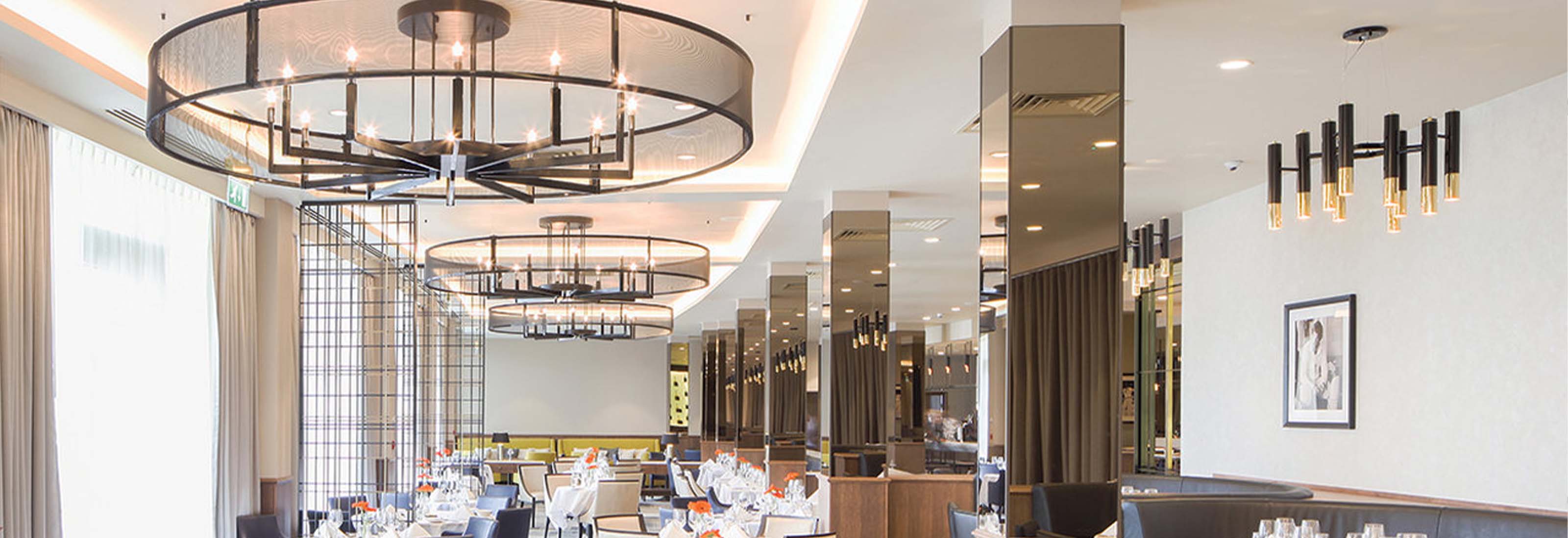 Northern Lights worked closely with the interior designers to develop a diverse range of bespoke hospitality lighting required for the entire hotel. As a UK lighting manufacturer, Northern Lights were able to manufacture the bespoke lighting for the lobby, restaurant and sports bar as well as the conference room, spa and 174 guest rooms.