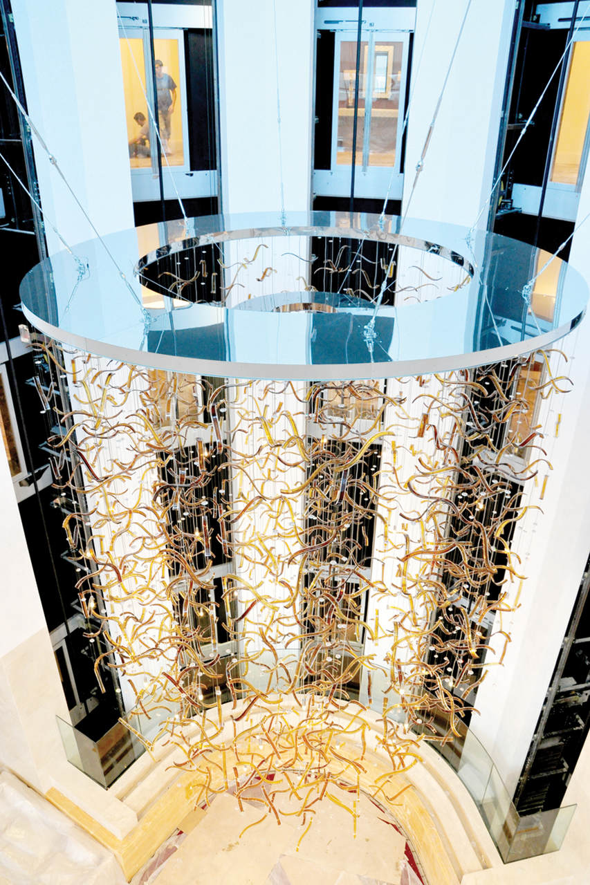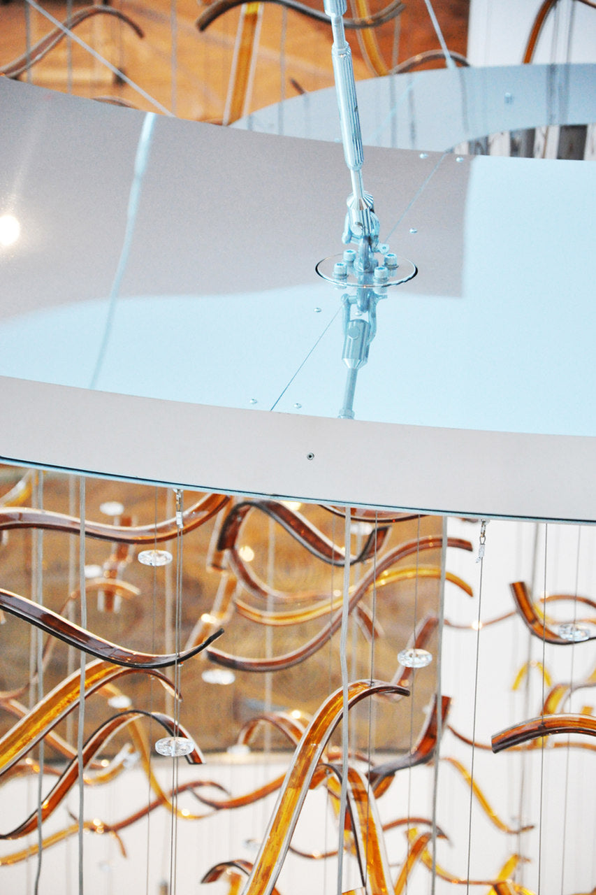 It comprises of thousands of hand slumped and curved glass rods in amber and gold that when suspended, create a triangular form to the centre of the fitting and random organic waves to the outer structure.