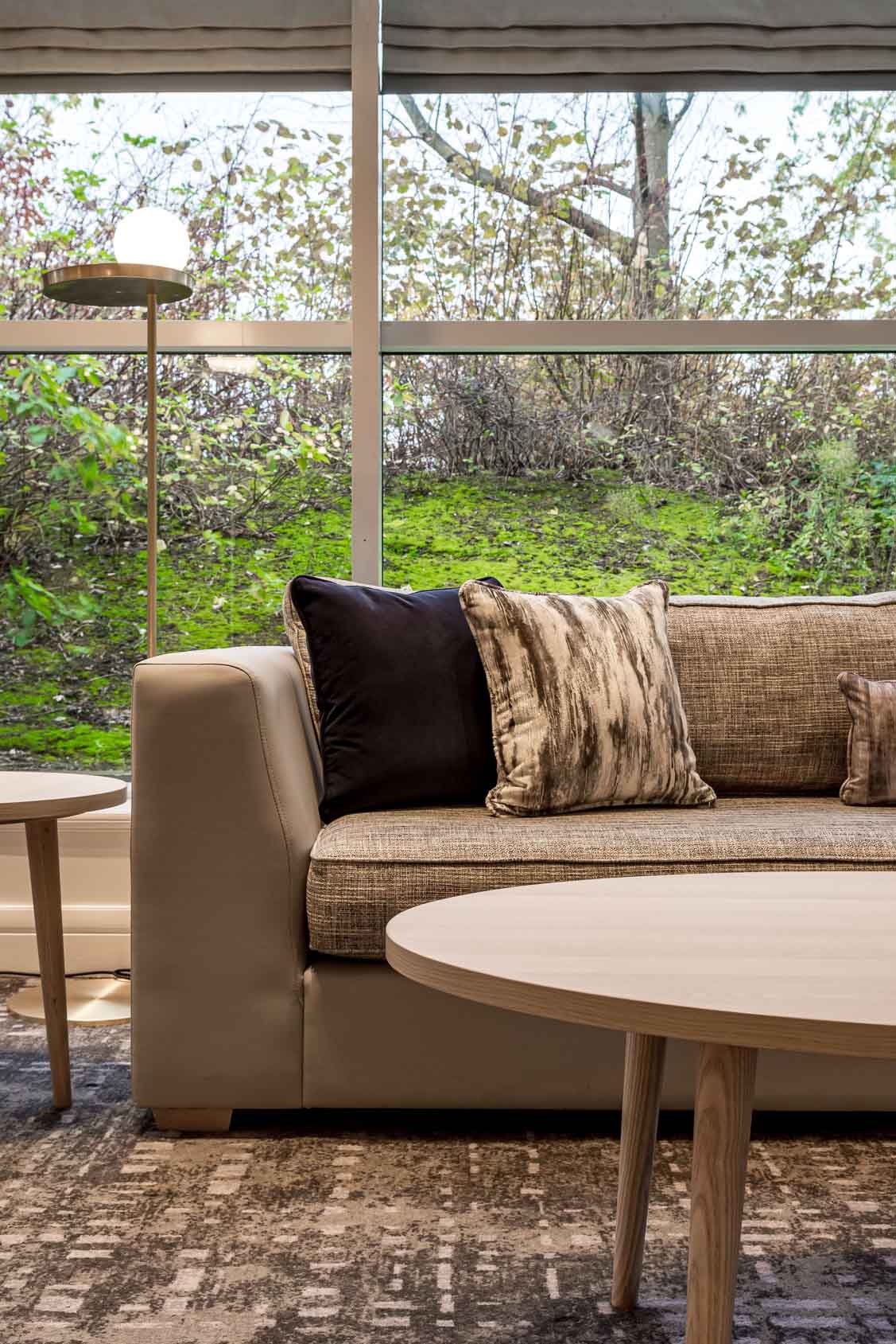 Finally, the communal seating area is graced with our Deco-inspired brushed brass floor lights. Benefiting from brass detailing on the underside of the lamps, each lamp has been internally weighted to stabilise the fixtures and keep them anchored to their respective areas.