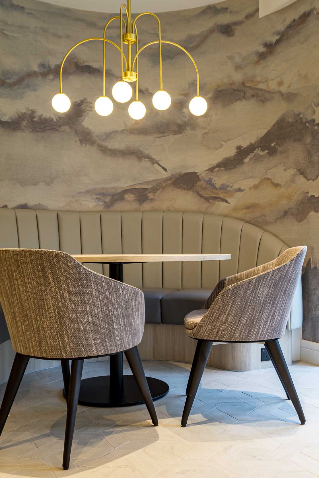 We also created a brushed brass globe pendant that sits above a single dining table to the back of the communal area, marrying with the other wonderful brass elements displayed throughout the scheme but with a slight tweak. The threaded matt opal globes emit a warming light that enhances the stunning hand-applied finish on the Deco-inspired arms.