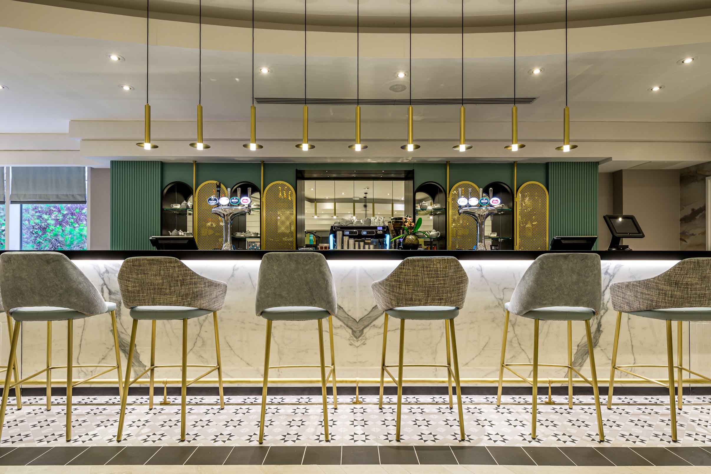 In the bar area, single drop pendant lighting styled on our iconic foyer chandelier has been lined above the bar seating to marry with the surrounding communal areas' aesthetic. Each light is complete with an acrylic disc and a matching brass ceiling plate.