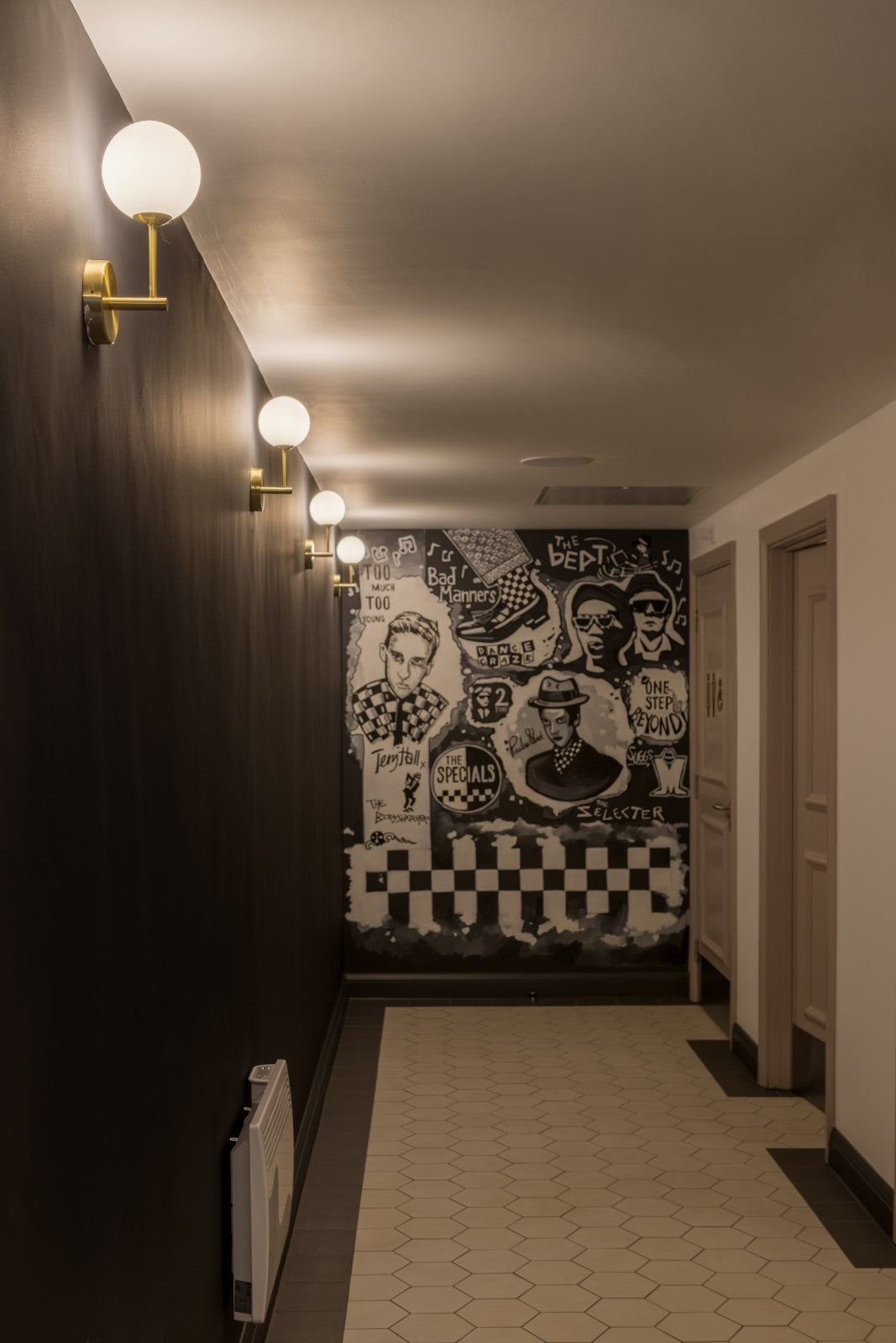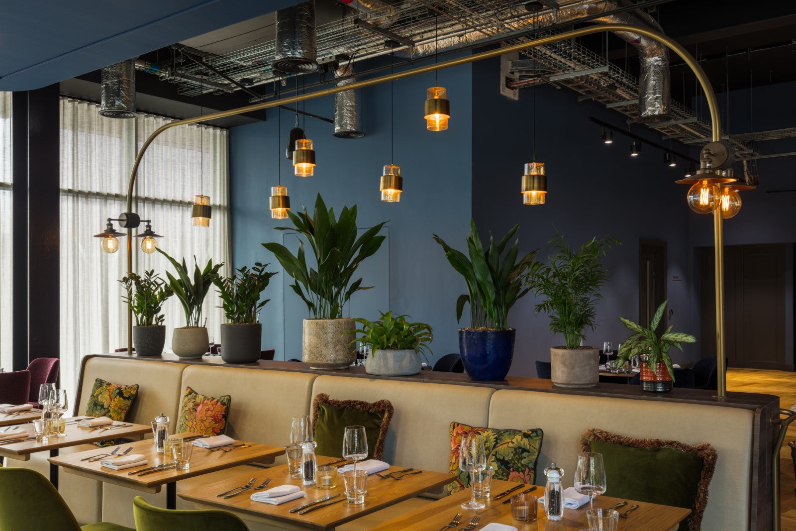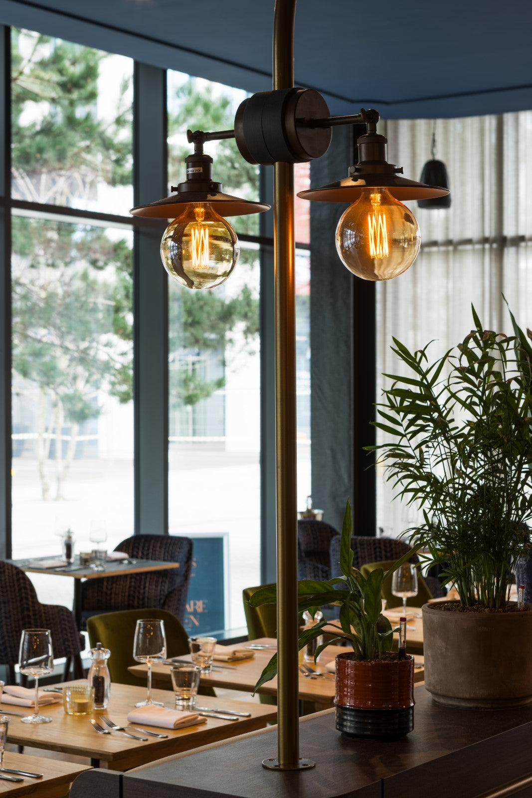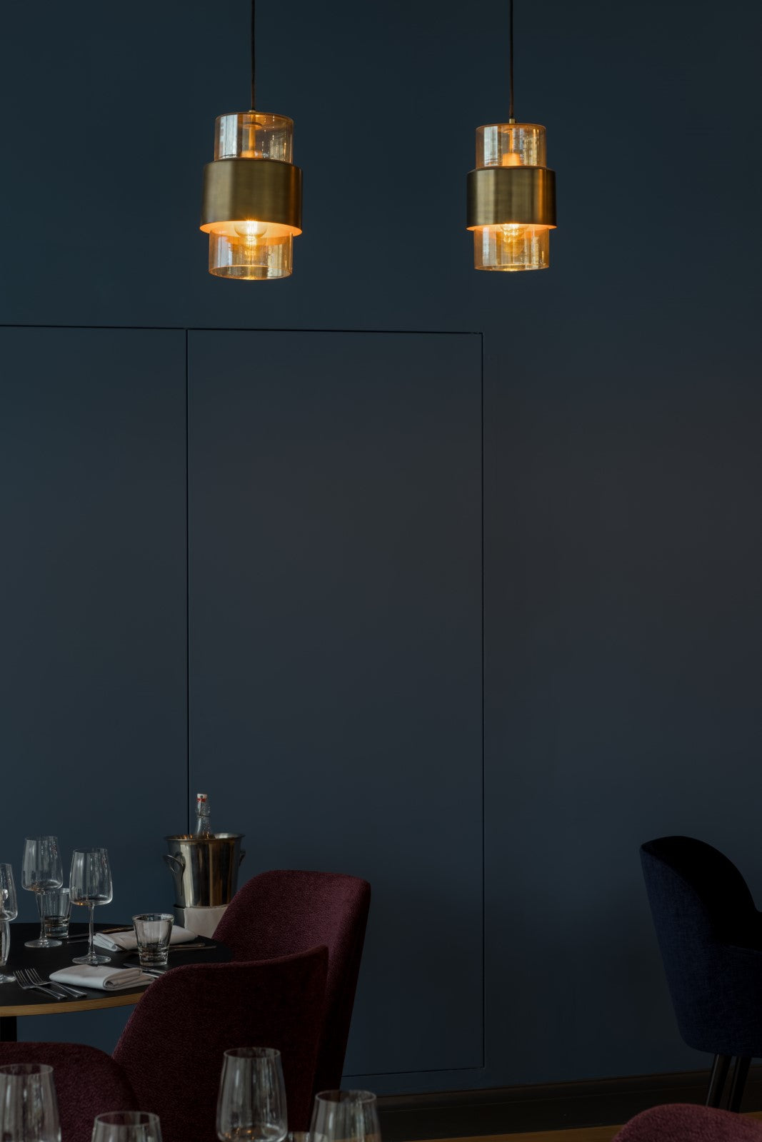 Throughout the public areas, pendant, floor and wall lights in a variety of materials and finishes are layered to provide atmospheric lighting. In the restaurant, antique brass patina pendants from within our group are paired with our Signature mouth-blown Levitt pendants in clear, amber and emerald glass. The result is a unique and striking lighting display that serves to create a colourful and inviting space for guests. Our industrial Berkeley pendants and Harbour wall lights offer a seamless design aesthetic, whilst our Hanover glass pendant with brushed brass finish offers a refined sense of luxury, continued by the single opal globe and double reeded globe wall lights.