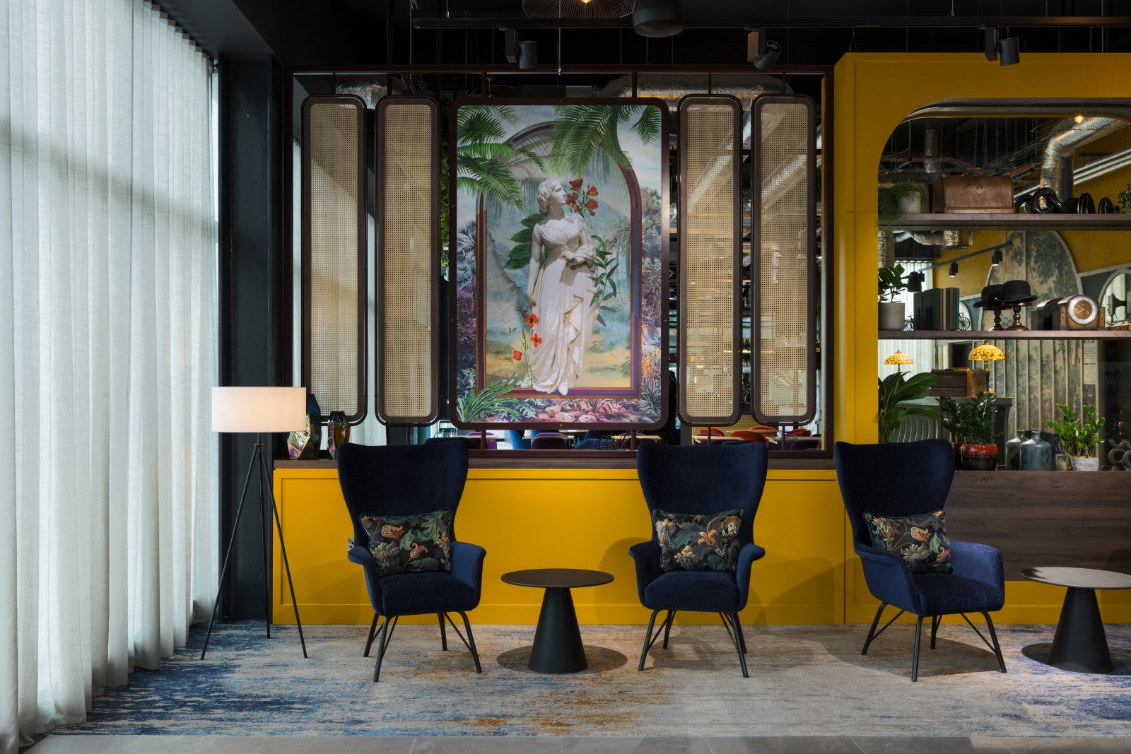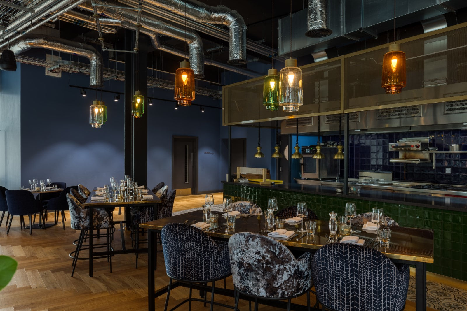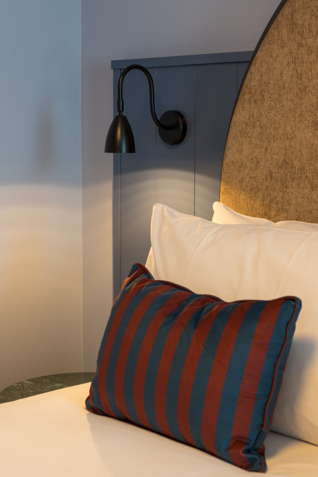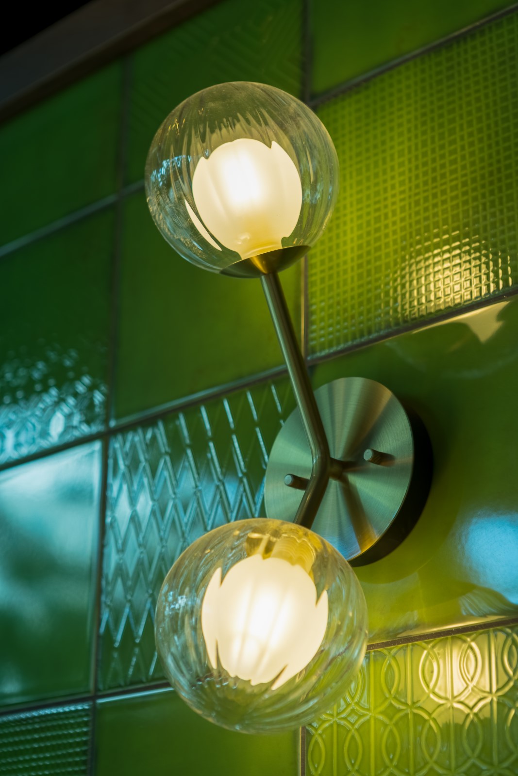 Throughout the public areas, pendant, floor and wall lights in a variety of materials and finishes are layered to provide atmospheric lighting. In the restaurant, antique brass patina pendants from within our group are paired with our Signature mouth-blown Levitt pendants in clear, amber and emerald glass. The result is a unique and striking lighting display that serves to create a colourful and inviting space for guests. Our industrial Berkeley pendants and Harbour wall lights offer a seamless design aesthetic, whilst our Hanover glass pendant with brushed brass finish offers a refined sense of luxury, continued by the single opal globe and double reeded globe wall lights.