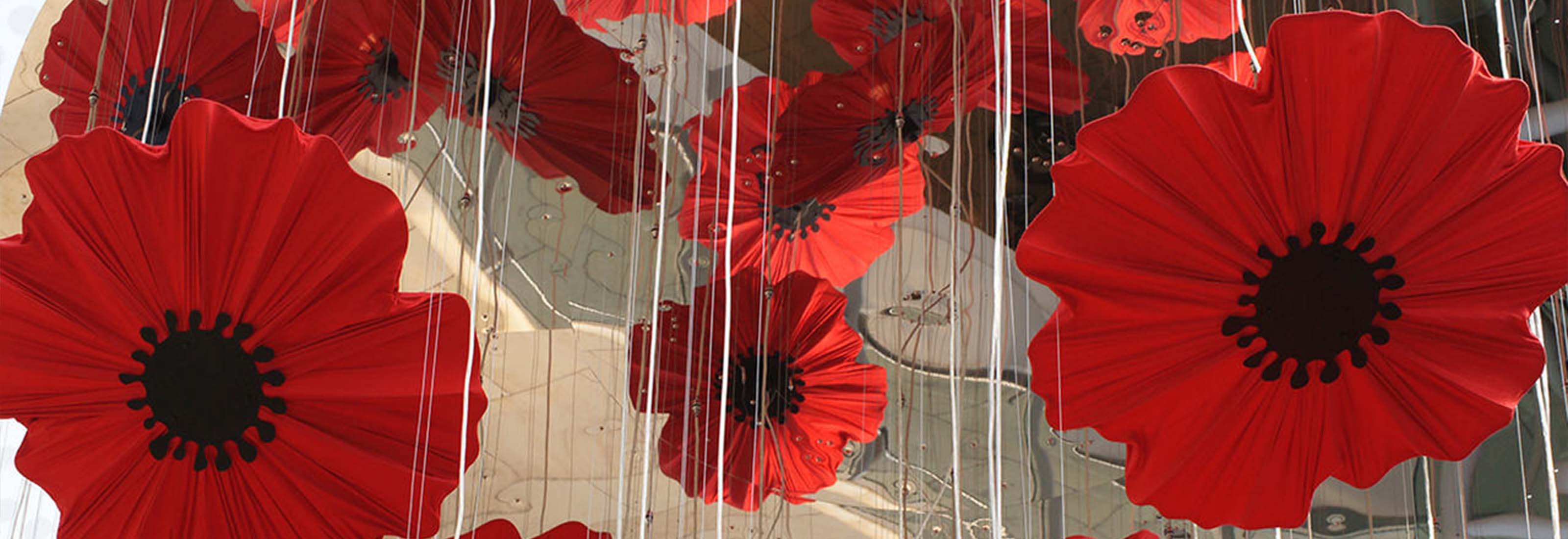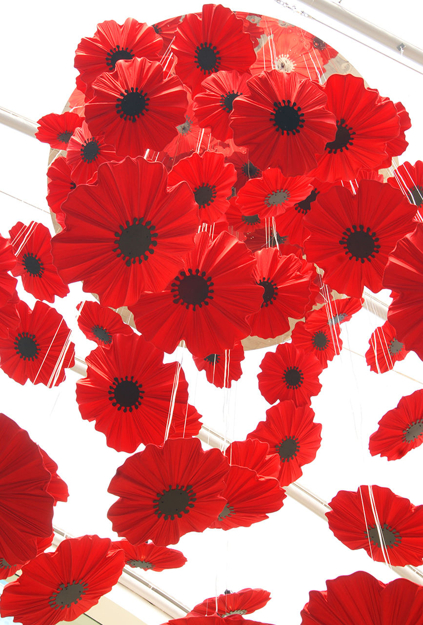 At 7m high and 3.5m in diameter, the heart of the installation are 60 handcrafted silk poppies, each delicately formed around a wire frame, are individually suspended from a mirror-polished ceiling plate. The scale and soft illumination enhances their presence, creating a striking and emotional tribute to the bravery and sacrifice of our servicemen and women.